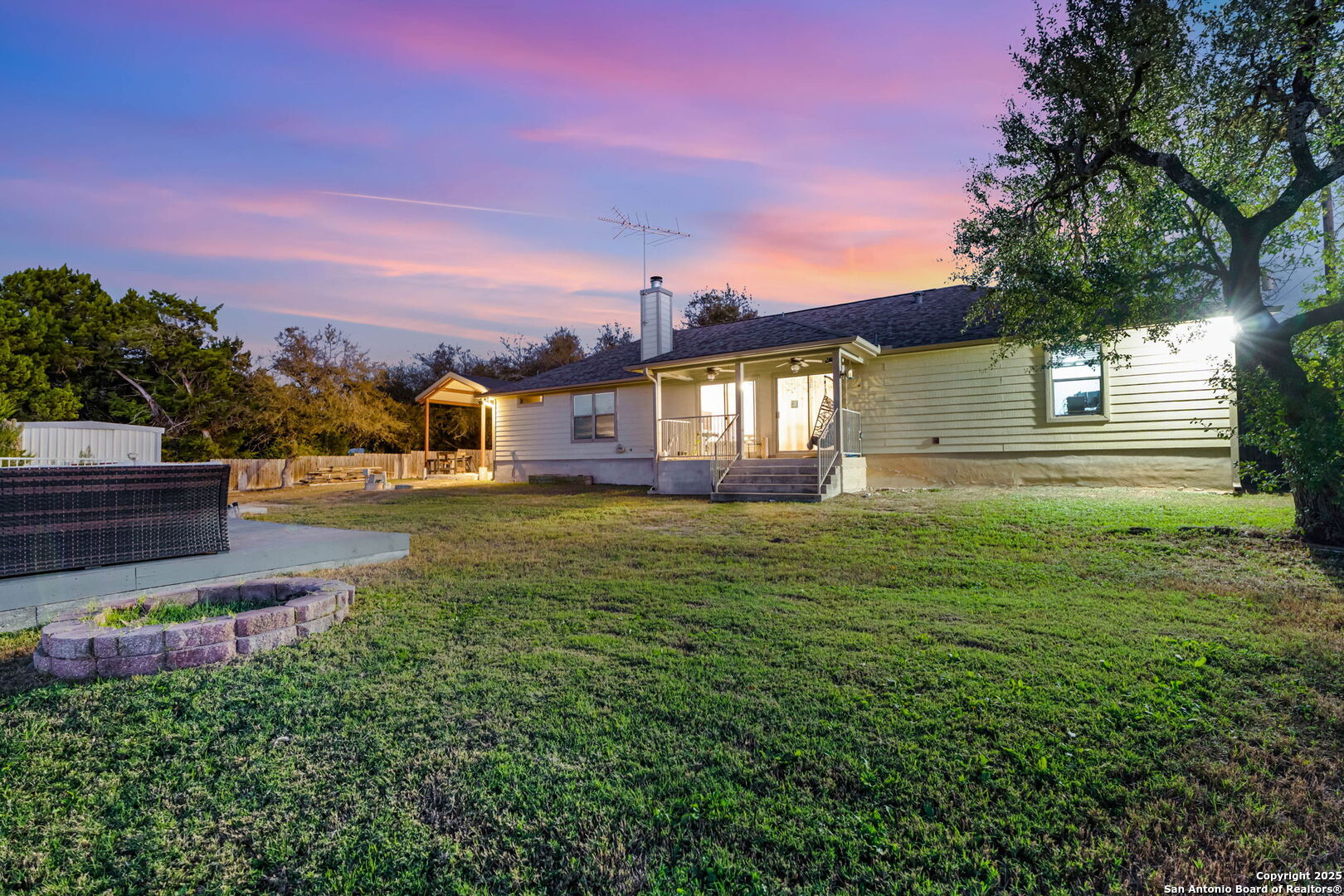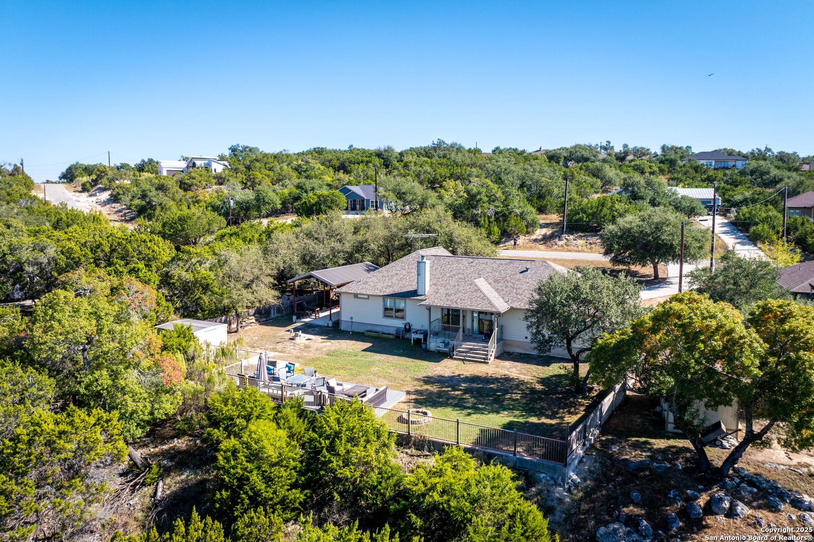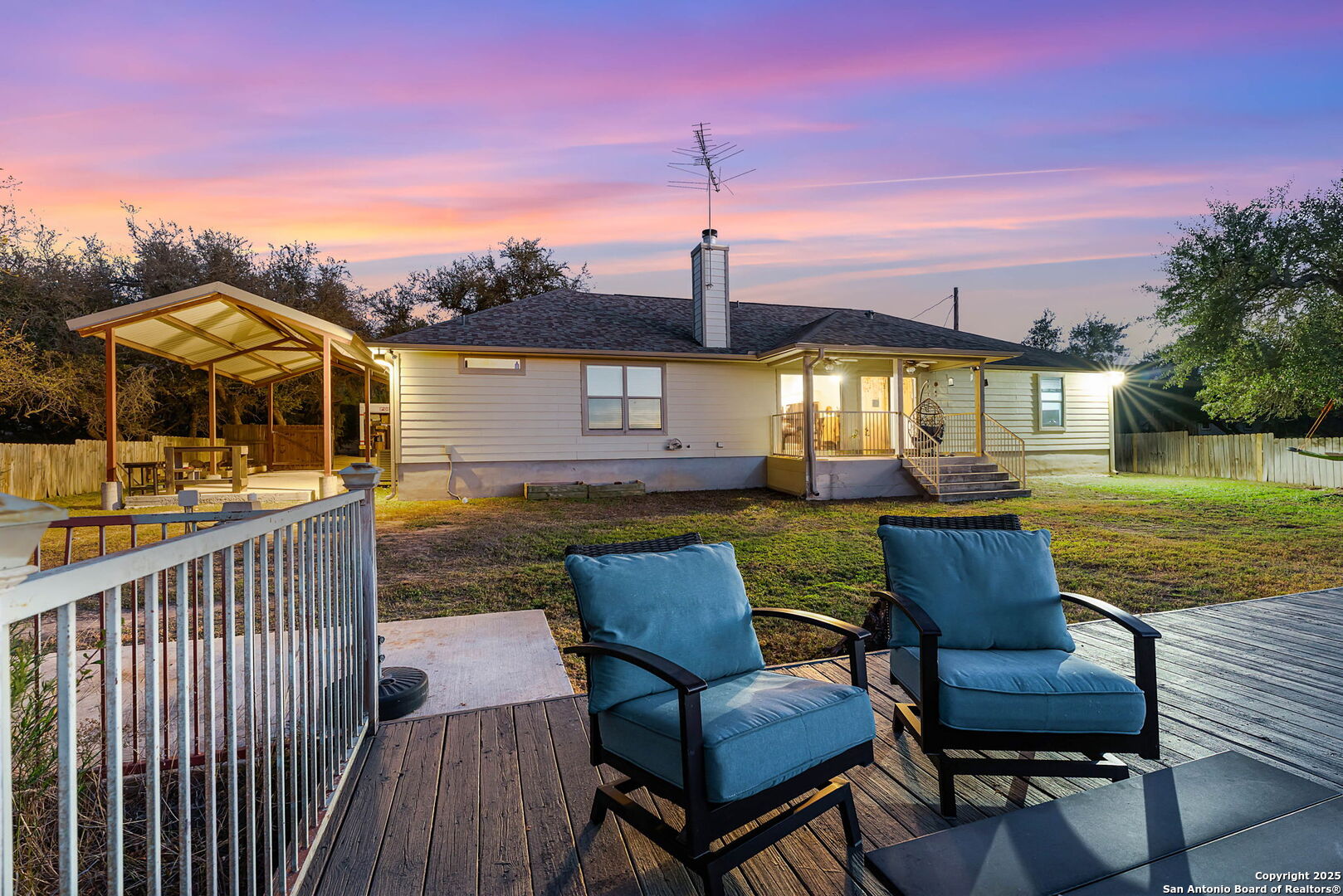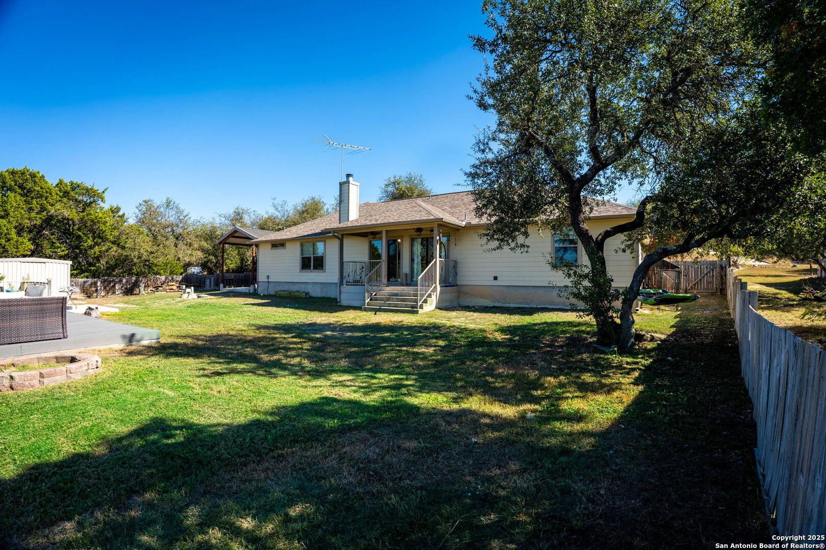 Discover your own Hill Country retreat just minutes from the sparkling waters of Canyon Lake, one of Texas's deepest lakes, boasting over 80 miles of scenic shoreline for year-round outdoor fun. This single-story ranch home is set on a private, expansive lot that stretches past the fenced backyard to a creek bed, giving you space to explore and breathe. Step inside and you'll find an airy, open layout anchored by beautiful stained concrete floors that make daily living easy. The 2023 kitchen update includes a dual oven/range and new dishwasher, while fresh paint and LED lighting brighten every corner. A newer roof (installed in 2023) provides peace of mind. The thoughtful floor plan features three bedrooms down one hall for privacy, an office tucked away on the opposite side of the home, and a laundry room conveniently located off the kitchen. Outside, soak in sweeping Hill Country views from your spacious backyard. A large concrete framed deck along the back fence invites gatherings ~ from sunset dinners to game nights and s'mores around the rock fire pit. There's also a covered concrete parking pad on the side of the home, ideal for RV or boat storage. Come and experience this slice of Hill Country solitude, where tranquility, convenience, and natural beauty come together just moments from the lake.