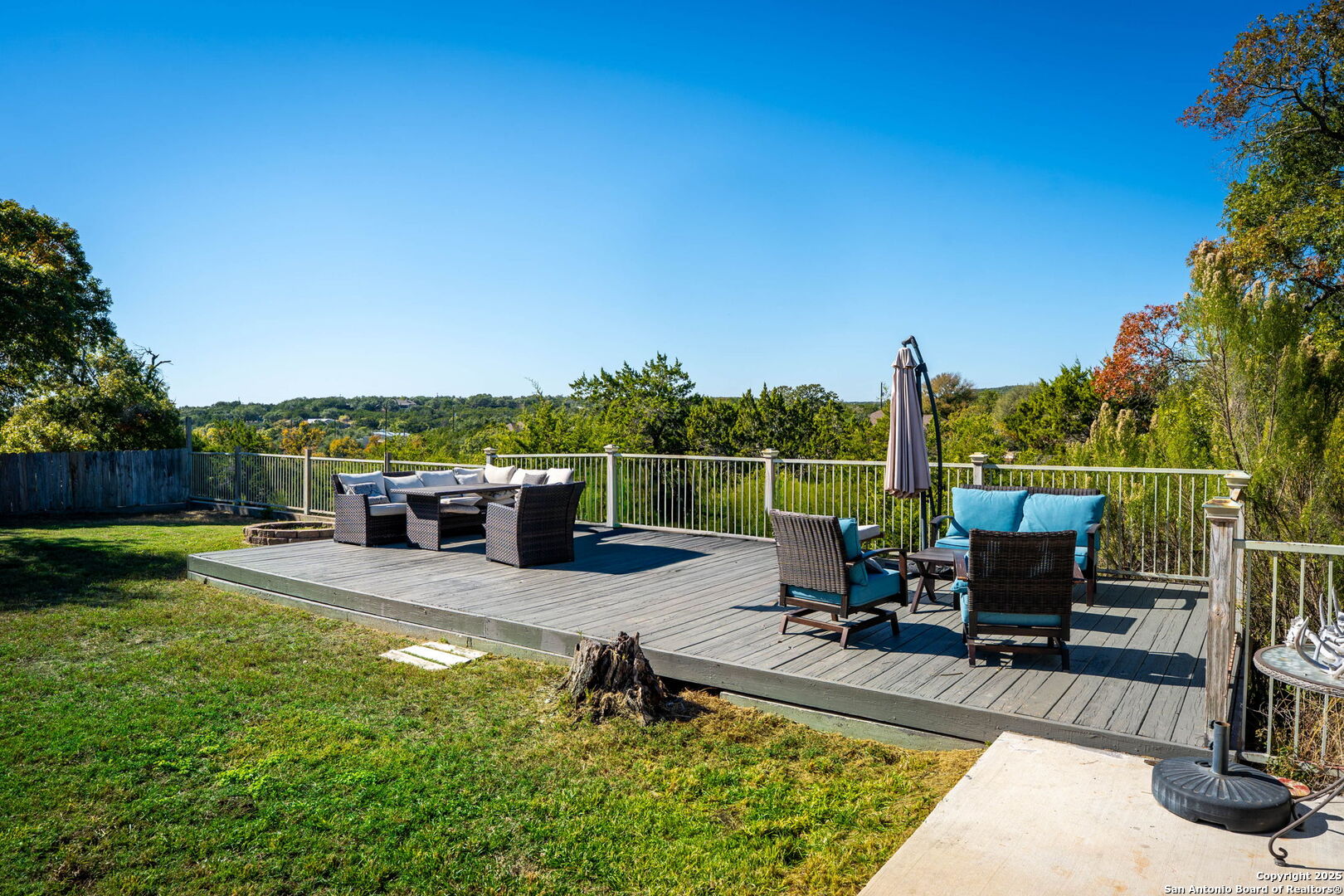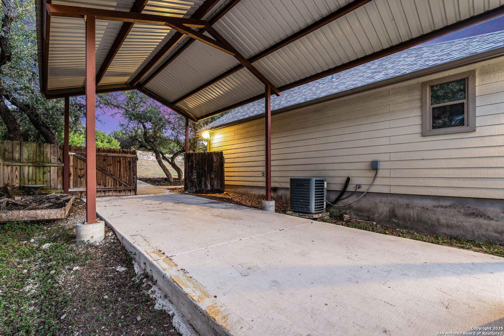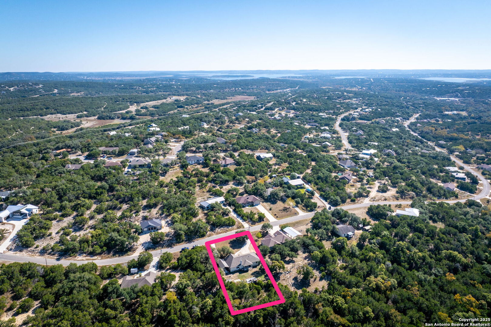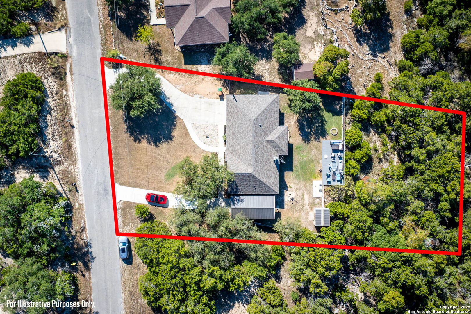 Discover your own Hill Country retreat just minutes from the sparkling waters of Canyon Lake, one of Texas's deepest lakes, boasting over 80 miles of scenic shoreline for year-round outdoor fun. This single-story ranch home is set on a private, expansive lot that stretches past the fenced backyard to a creek bed, giving you space to explore and breathe. Step inside and you'll find an airy, open layout anchored by beautiful stained concrete floors that make daily living easy. The 2023 kitchen update includes a dual oven/range and new dishwasher, while fresh paint and LED lighting brighten every corner. A newer roof (installed in 2023) provides peace of mind. The thoughtful floor plan features three bedrooms down one hall for privacy, an office tucked away on the opposite side of the home, and a laundry room conveniently located off the kitchen. Outside, soak in sweeping Hill Country views from your spacious backyard. A large concrete framed deck along the back fence invites gatherings ~ from sunset dinners to game nights and s'mores around the rock fire pit. There's also a covered concrete parking pad on the side of the home, ideal for RV or boat storage. Come and experience this slice of Hill Country solitude, where tranquility, convenience, and natural beauty come together just moments from the lake.