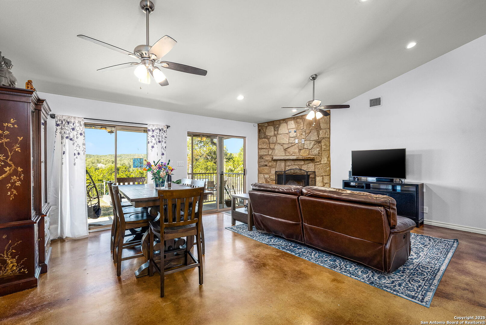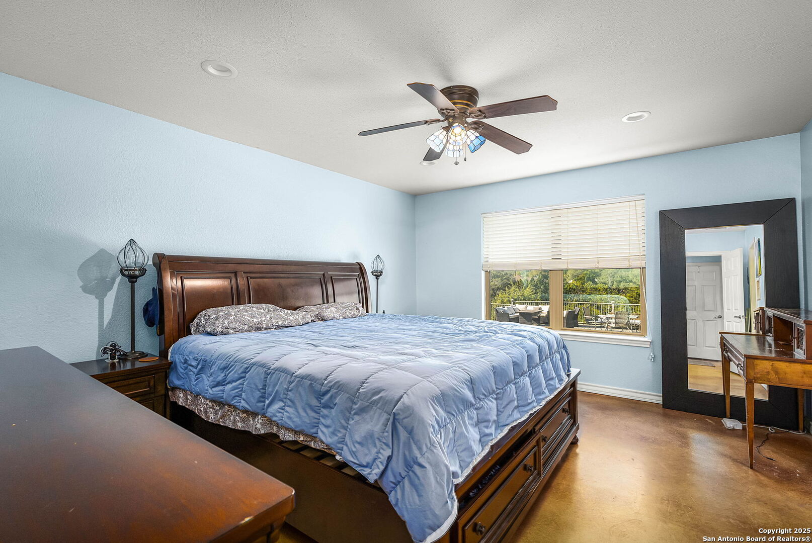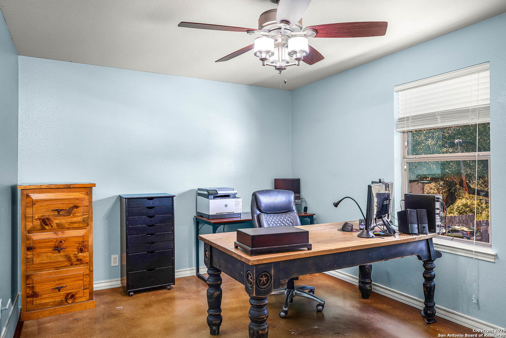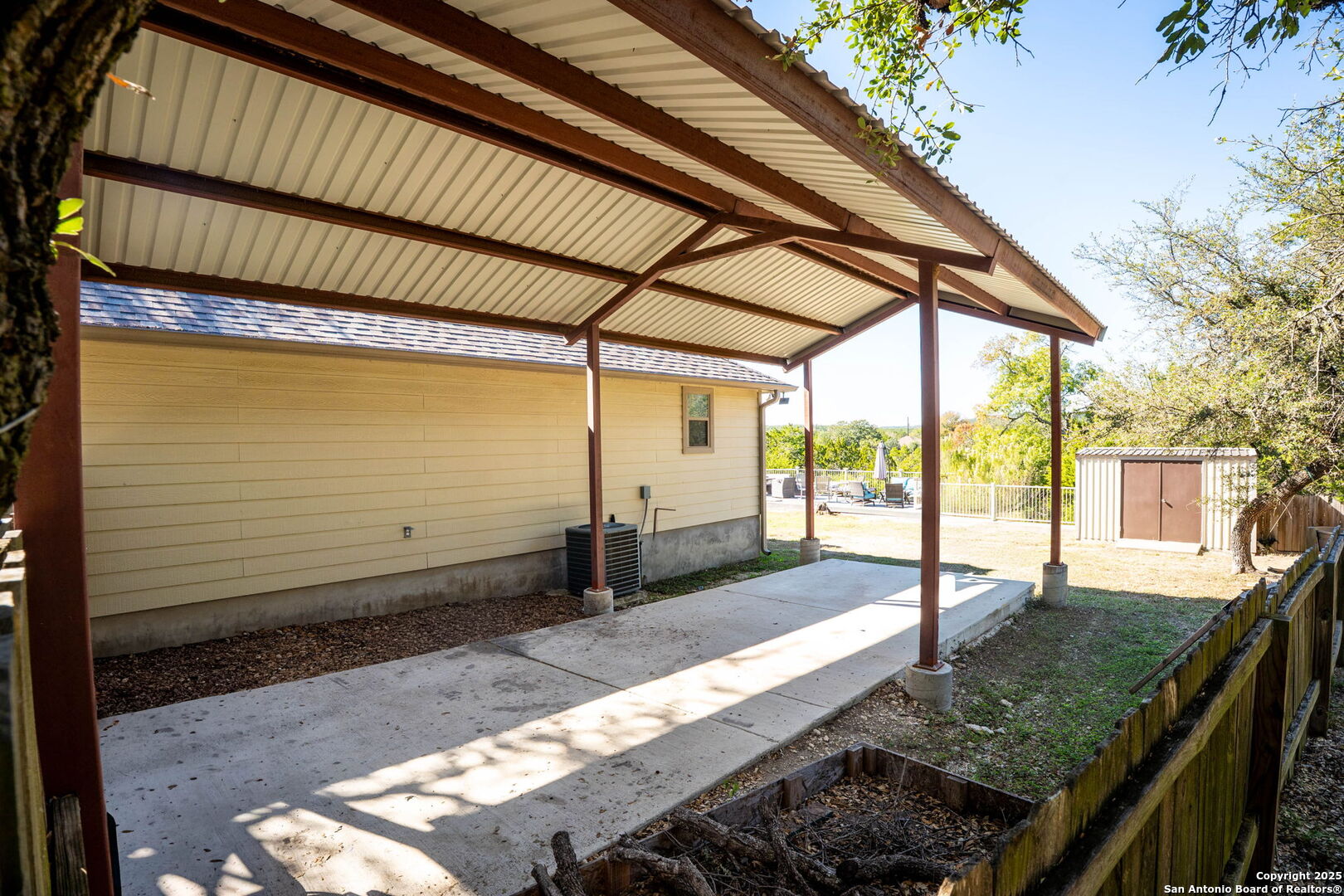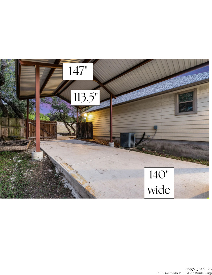 Discover your own Hill Country retreat just minutes from the sparkling waters of Canyon Lake, one of Texas's deepest lakes, boasting over 80 miles of scenic shoreline for year-round outdoor fun. This single-story ranch home is set on a private, expansive lot that stretches past the fenced backyard to a creek bed, giving you space to explore and breathe. Step inside and you'll find an airy, open layout anchored by beautiful stained concrete floors that make daily living easy. The 2023 kitchen update includes a dual oven/range and new dishwasher, while fresh paint and LED lighting brighten every corner. A newer roof (installed in 2023) provides peace of mind. The thoughtful floor plan features three bedrooms down one hall for privacy, an office tucked away on the opposite side of the home, and a laundry room conveniently located off the kitchen. Outside, soak in sweeping Hill Country views from your spacious backyard. A large concrete framed deck along the back fence invites gatherings ~ from sunset dinners to game nights and s'mores around the rock fire pit. There's also a covered concrete parking pad on the side of the home, ideal for RV or boat storage. Come and experience this slice of Hill Country solitude, where tranquility, convenience, and natural beauty come together just moments from the lake.
