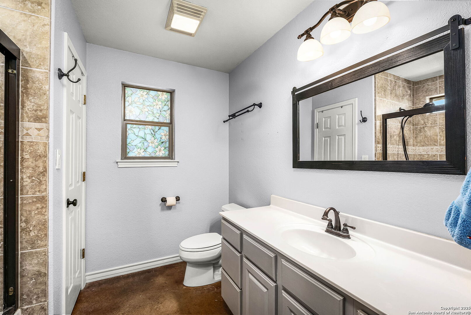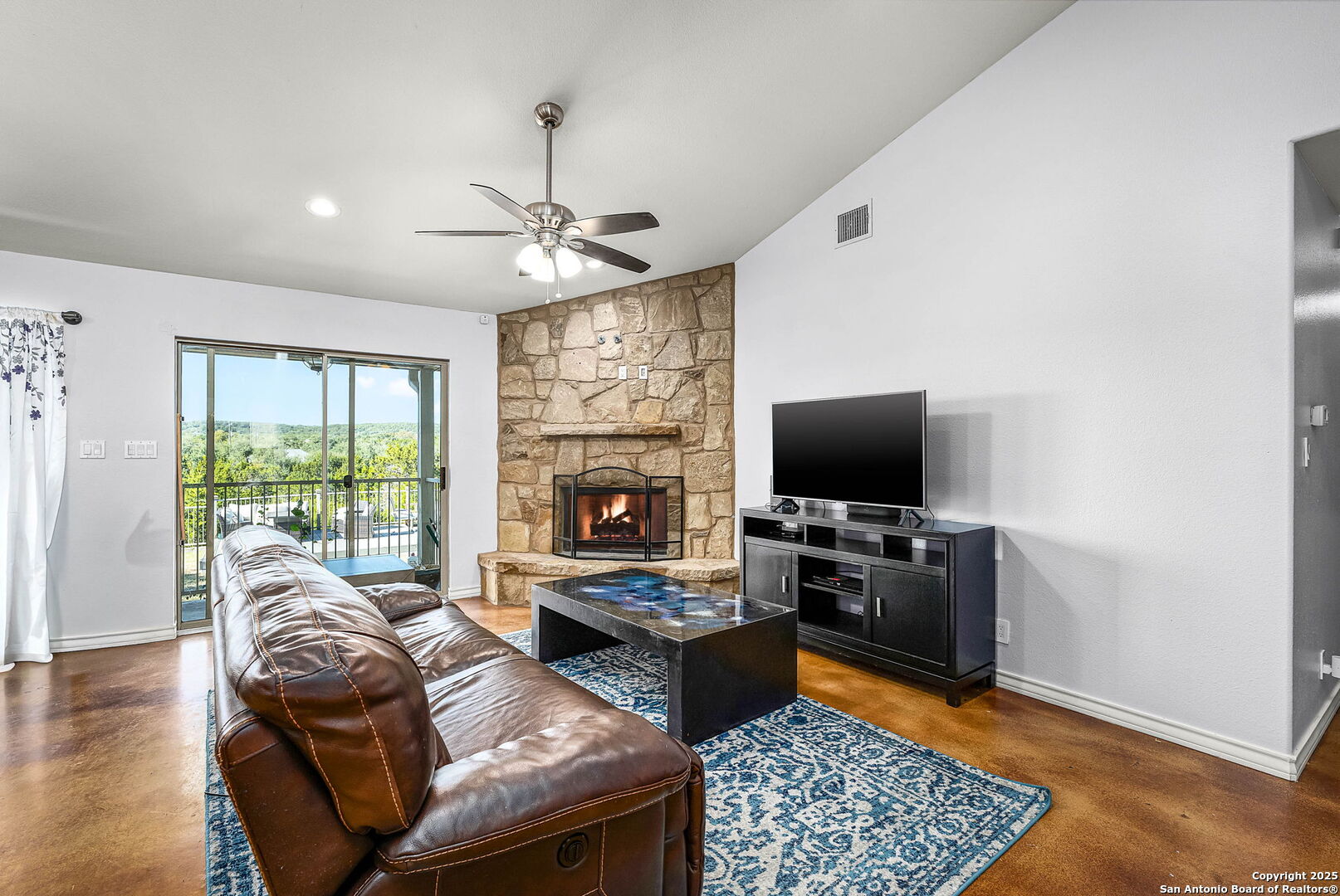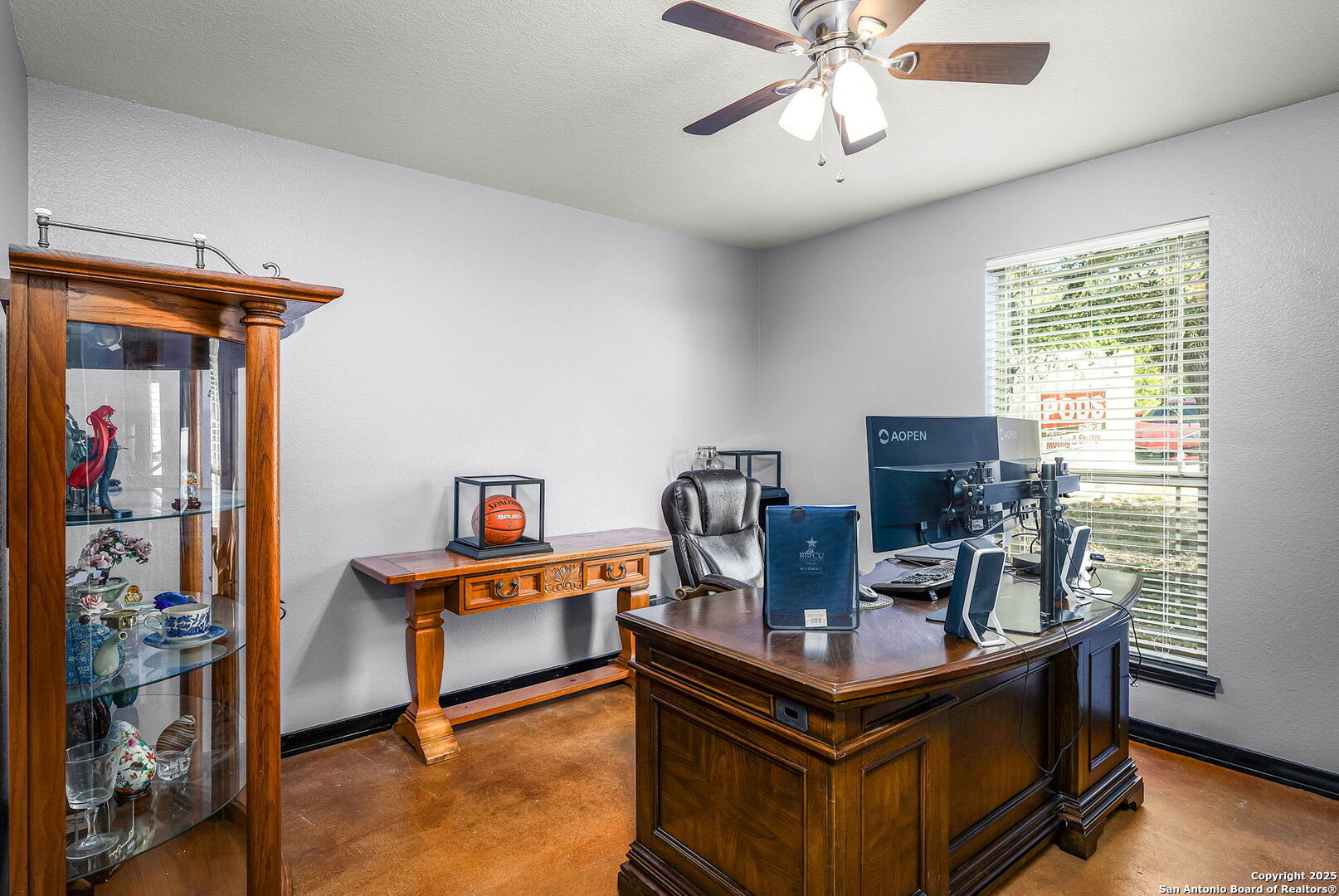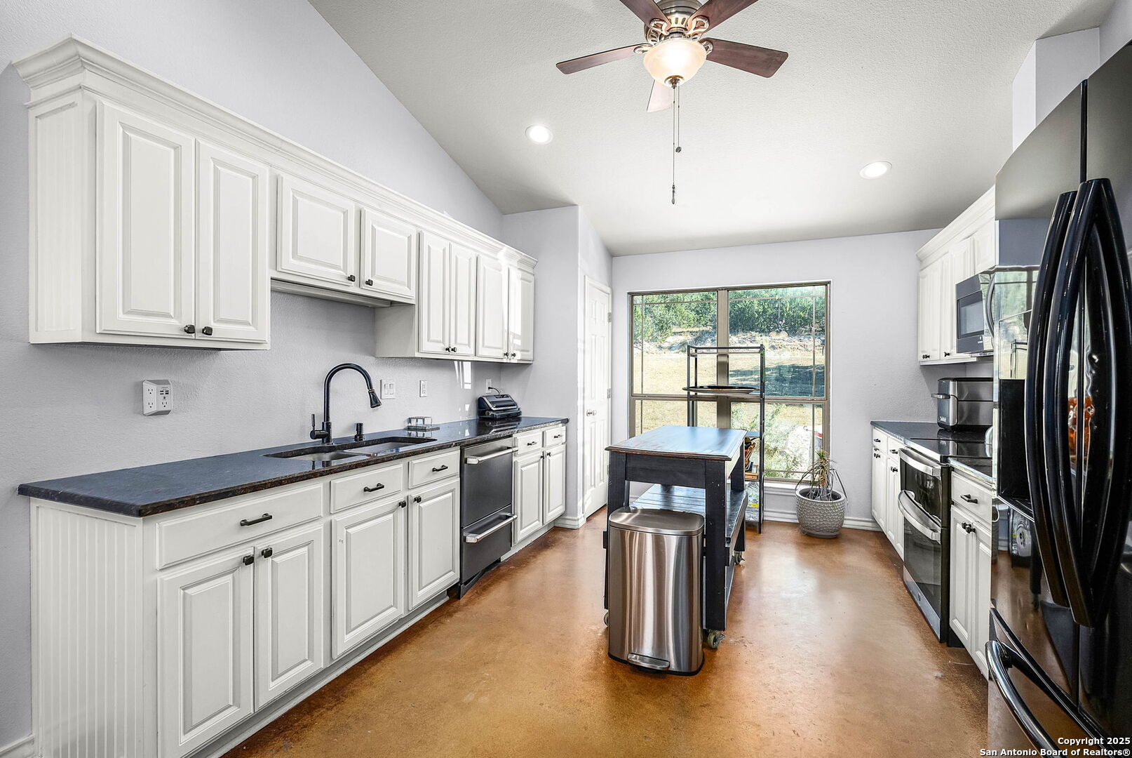 Discover your own Hill Country retreat just minutes from the sparkling waters of Canyon Lake, one of Texas's deepest lakes, boasting over 80 miles of scenic shoreline for year-round outdoor fun. This single-story ranch home is set on a private, expansive lot that stretches past the fenced backyard to a creek bed, giving you space to explore and breathe. Step inside and you'll find an airy, open layout anchored by beautiful stained concrete floors that make daily living easy. The 2023 kitchen update includes a dual oven/range and new dishwasher, while fresh paint and LED lighting brighten every corner. A newer roof (installed in 2023) provides peace of mind. The thoughtful floor plan features three bedrooms down one hall for privacy, an office tucked away on the opposite side of the home, and a laundry room conveniently located off the kitchen. Outside, soak in sweeping Hill Country views from your spacious backyard. A large concrete framed deck along the back fence invites gatherings ~ from sunset dinners to game nights and s'mores around the rock fire pit. There's also a covered concrete parking pad on the side of the home, ideal for RV or boat storage. Come and experience this slice of Hill Country solitude, where tranquility, convenience, and natural beauty come together just moments from the lake.