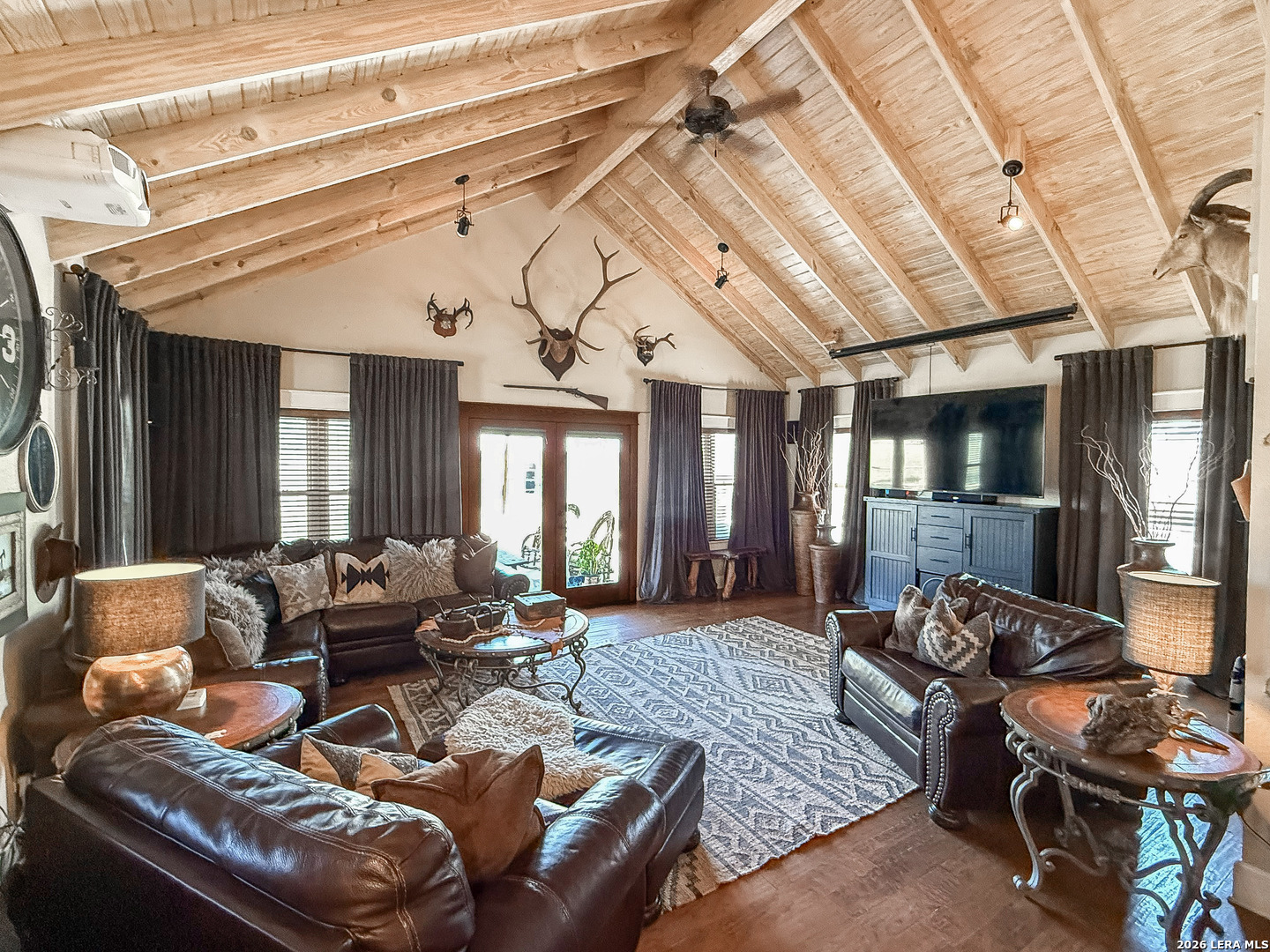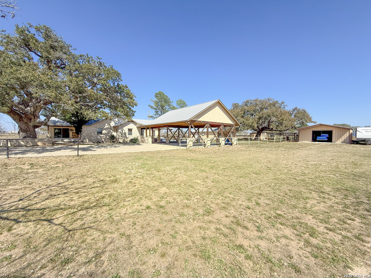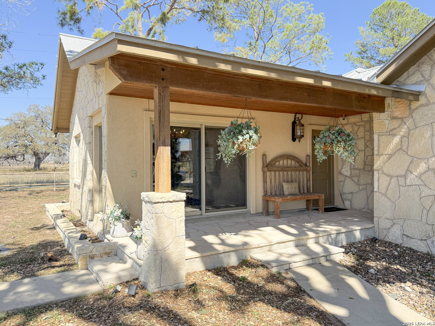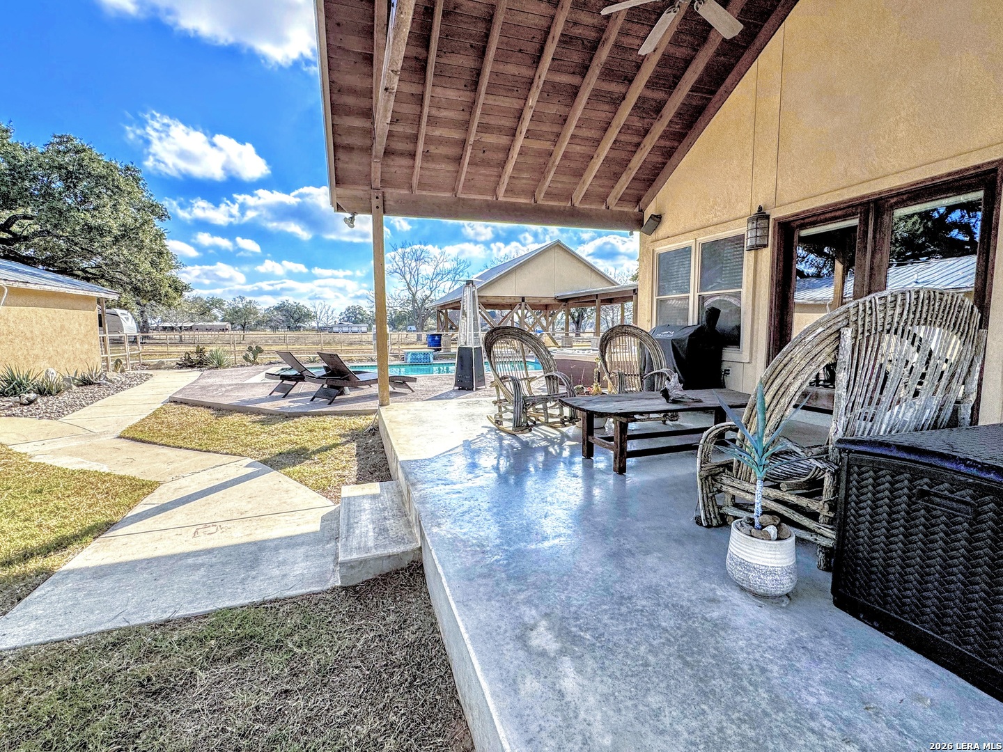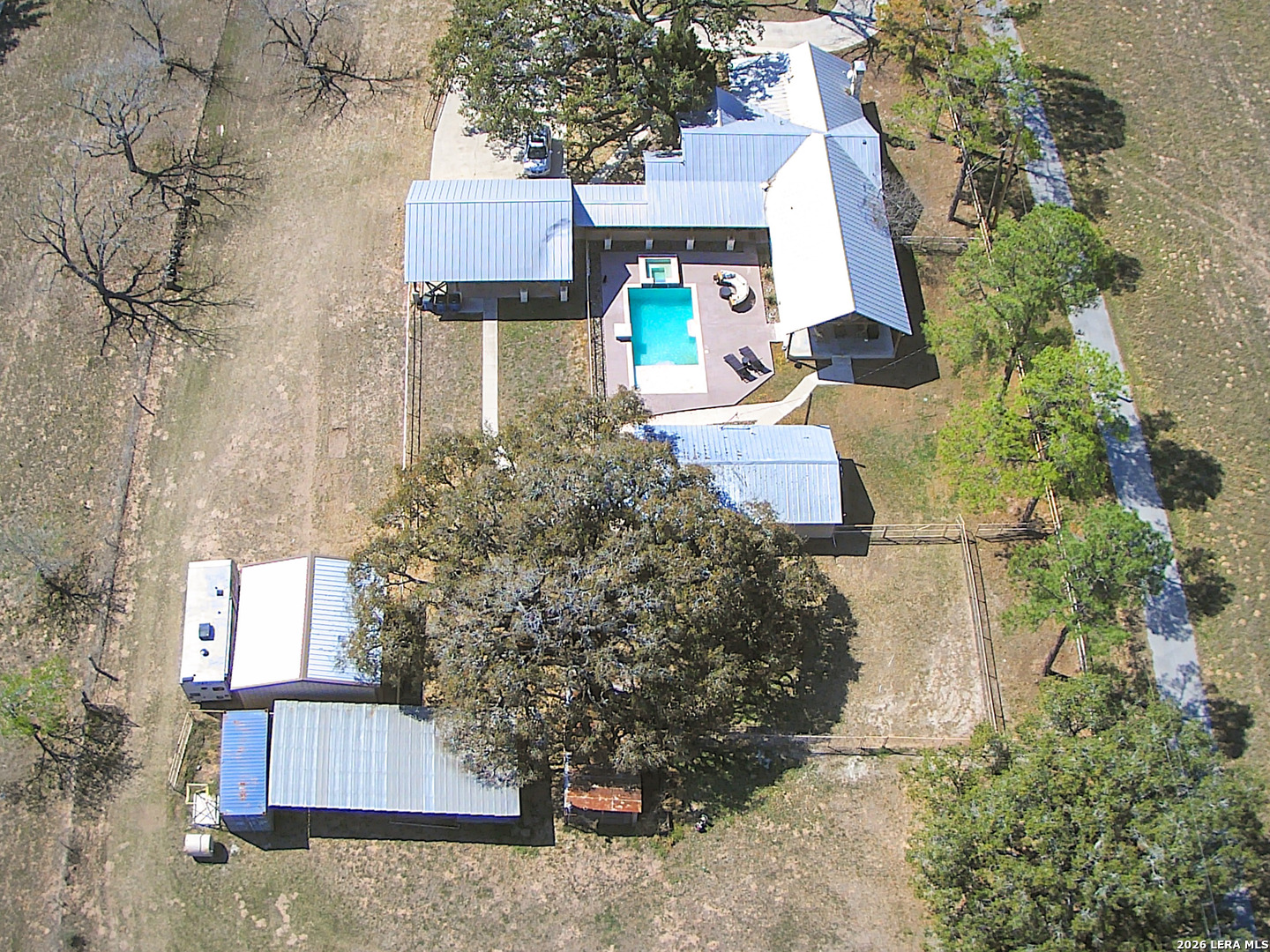 Set on 5.93 picturesque acres, this property offers space, comfort, and so much more! The main home features 2 thoughtfully designed bedrooms and 3 full bathrooms, while a separate guest house provides added flexibility with 1 bedroom, 1 bathroom, a kitchenette, and a private living area, ideal for extended family, guests, or a home office. Inside the main home, you're welcomed into an inviting living room enhanced by vaulted ceilings and oversized windows that flood the space with natural light. The family room flows seamlessly into the breakfast nook and kitchen, creating a layout perfect for entertaining or hosting gatherings at home. The kitchen is a chef's delight, offering stainless steel appliances, a glass cooktop, generous cabinetry, and a large center island with breakfast bar seating. Each bedroom serves as its own private retreat, featuring en suite bathrooms and ample closet space. Outside you will enjoy expansive outdoor living, where a covered patio overlooks the in-ground pool, making it the perfect setting for Texas summers. The sprawling acreage offers endless opportunities. Additional features include a shipping container for extra storage, a three-car carport, a private water well supplying both the pond and sprinkler system, horse stalls, tack room, and a barn with a roll-up door, completing this truly one-of-a-kind property. Schedule your private showing today and experience your own piece of Texas!