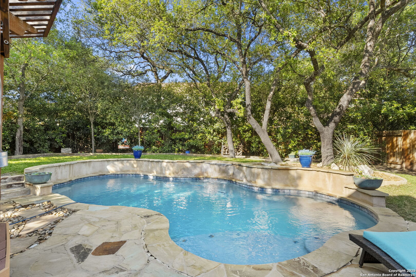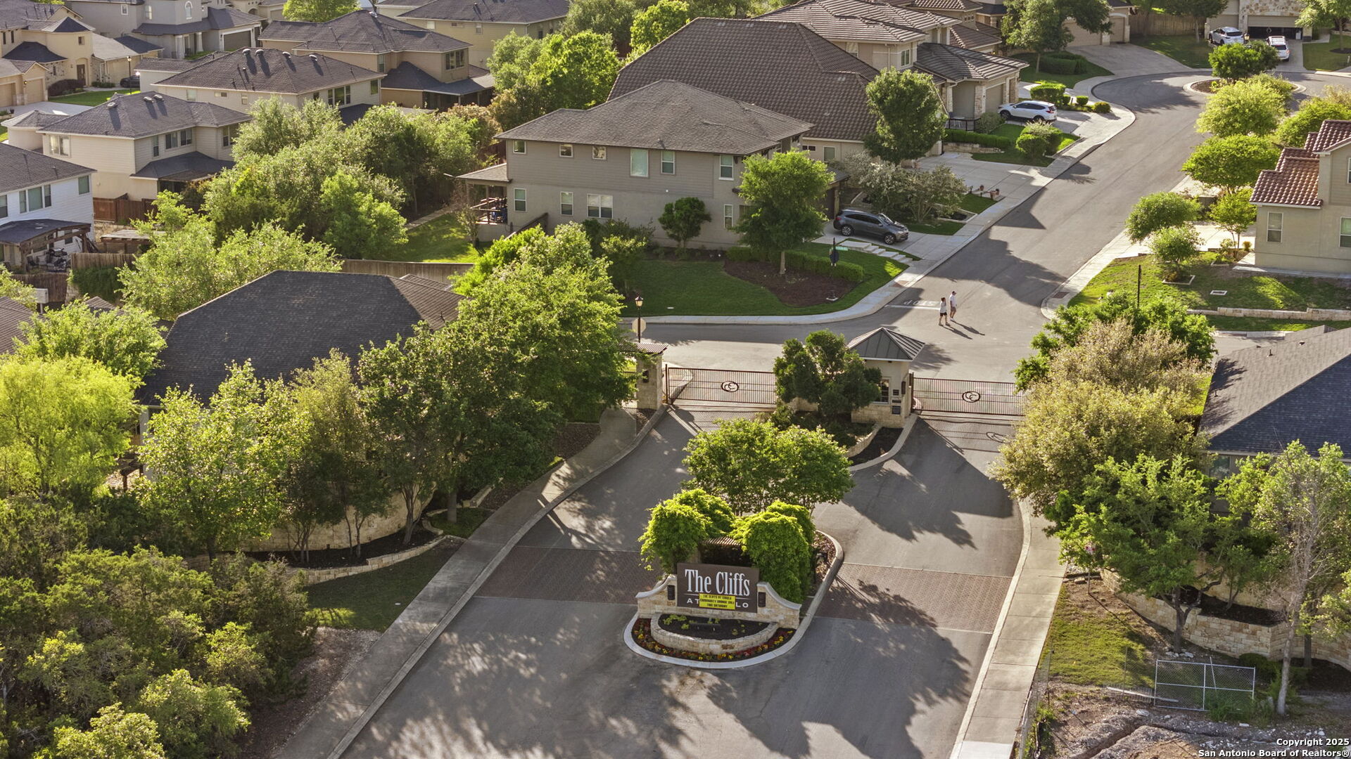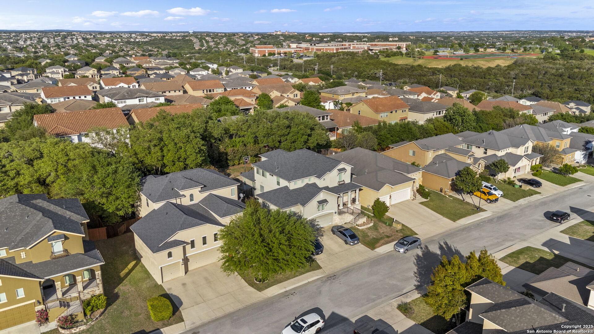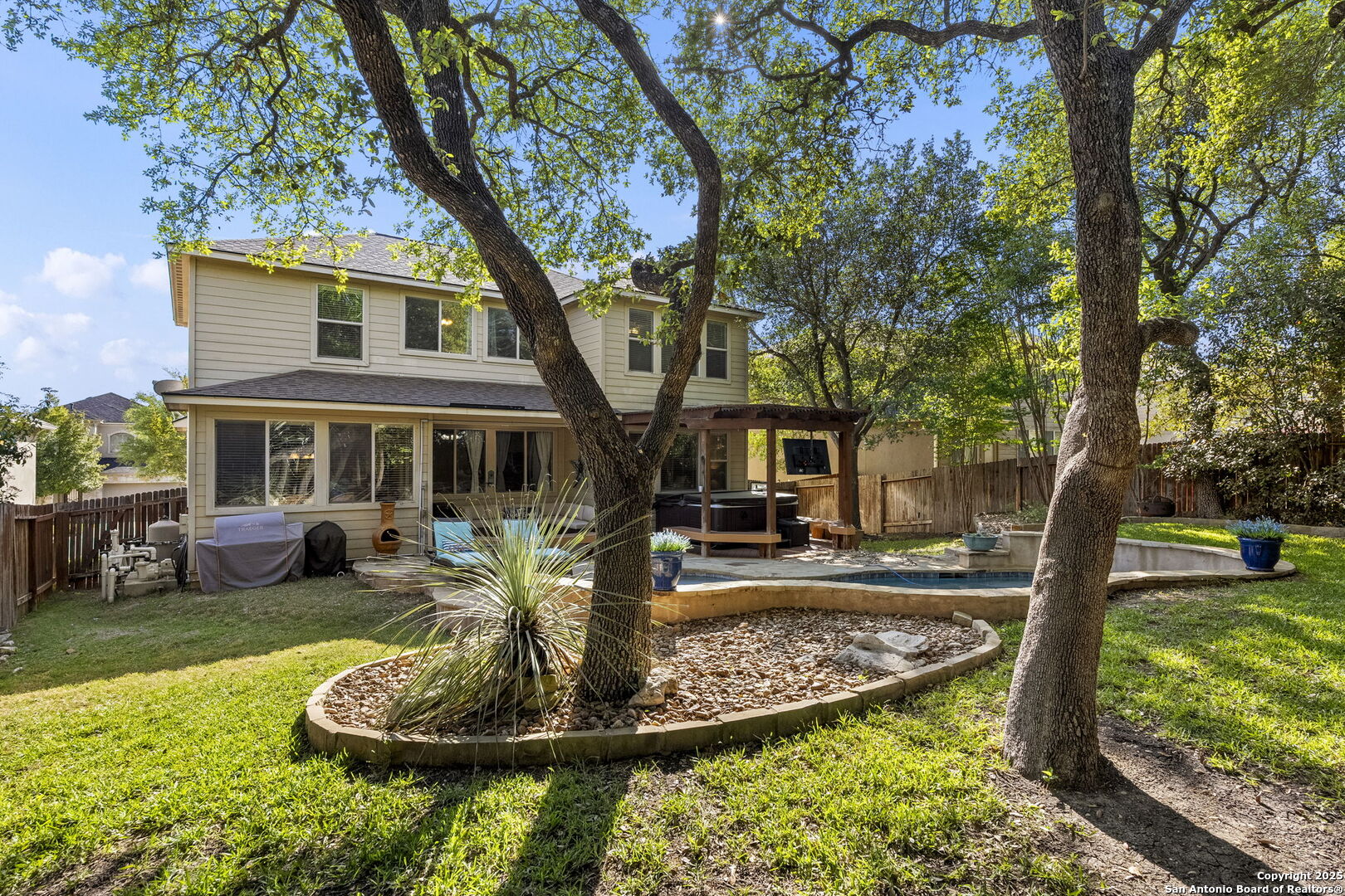 This is the one! This charming two-story gem, built by McMillan Homes, is nestled in the privately gated community of The Cliffs at Cibolo. Surrounded by mature trees and featuring 3-sided stucco masonry, this home is located in the highly desirable North Side of San Antonio, just outside Loop 1604, offering a strong long-term investment potential. Combining Hill Country charm with modern comforts, it's just minutes from top-rated NEISD schools, Stone Oak, shopping, dining, and major highways. Step inside to a bright, inviting layout where natural light fills the foyer. At the front of the home, you'll find a formal dining space with crown molding and a powder bath, leading into the heart of the home, a spacious, open-concept living area, and a chef's kitchen. The kitchen features oversized custom cabinetry, granite countertops, a stone-accented island, stainless steel KitchenAid appliances including a gas cooktop, double ovens, a recently replaced microwave, and a large walk-in pantry with room for a wine refrigerator or storage. Tile floors flow throughout the main living areas, while engineered wood flooring adds warmth in the primary suite, and carpet is reserved for upstairs bedrooms and closets. The home offers 4 bedrooms, 2.5 baths, a foirmal dining, and a large upstairs game room ideal for a home gym, media space, or playroom. The primary suite is downstairs and a relaxing retreat featuring large windows and an upgraded bathroom with a walk-in shower upgraded in 2015, double vanity, and a generous closet. Every detail was thoughtfully considered, from tall ceilings in the garage to a water softener, and ceiling fans in every bedroom. Step outside into your private oasis. Built in 2014, the in-ground custom pool is surrounded by flagstone decking, landscaping, built-in bench seating, and fiber composite decking with a pergola for shaded lounging. A separate pergola-covered hot tub area with a TV hookup and jacuzzi makes this backyard perfect for relaxing or entertaining under the stars. Additional exterior upgrades include a replaced pool pump and pool cleaner and an irrigation system. Major improvements include a new roof installed by the previous owner in 2016, a recently replaced HVAC unit in the attic (with the exterior unit still original), a new water heater, garbage disposal, and a Honeywell UV light treatment system for cleaner indoor air. A wrought-iron accented front door adds the perfect curb appeal, welcoming you to a home that blends sophistication with everyday comfort. Conveniently located near US 281, IH-10, and Loop 1604, you'll enjoy quick access to destinations like Canyon Springs Golf Club, TPC Parkway, JW Marriott Hill Country Resort, The Rim, La Cantera, and top parks including Eisenhower, Phil Hardberger, and McAllister. It's also near Camp Bullis and the airport-making this location as practical as it is beautiful. With top-tier public and private schools nearby, and a community that feels like a retreat, this home is more than just a place to live-it's a story waiting to be lived.