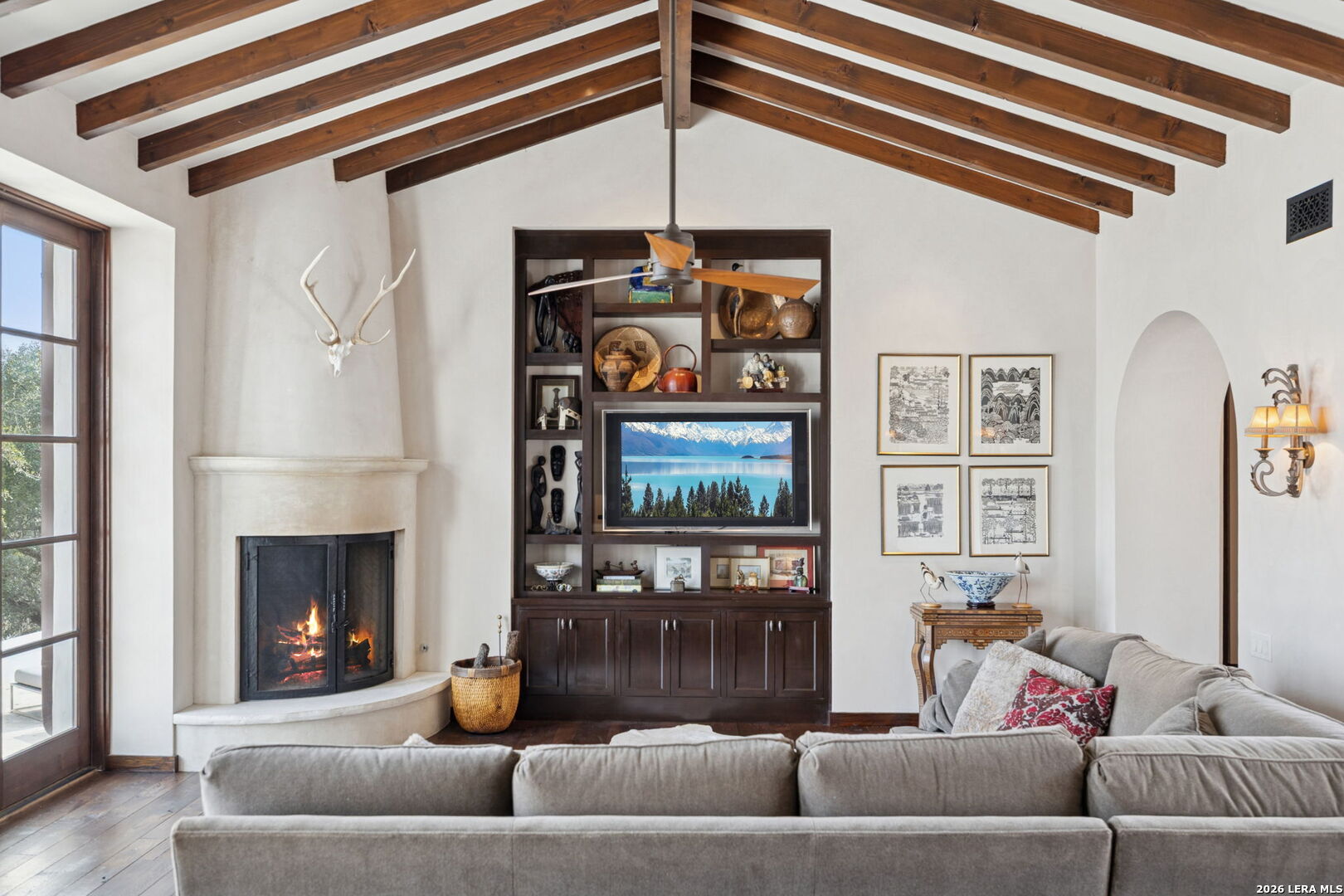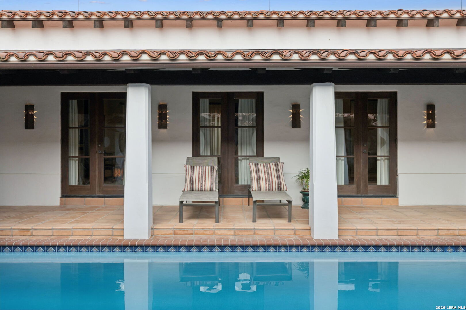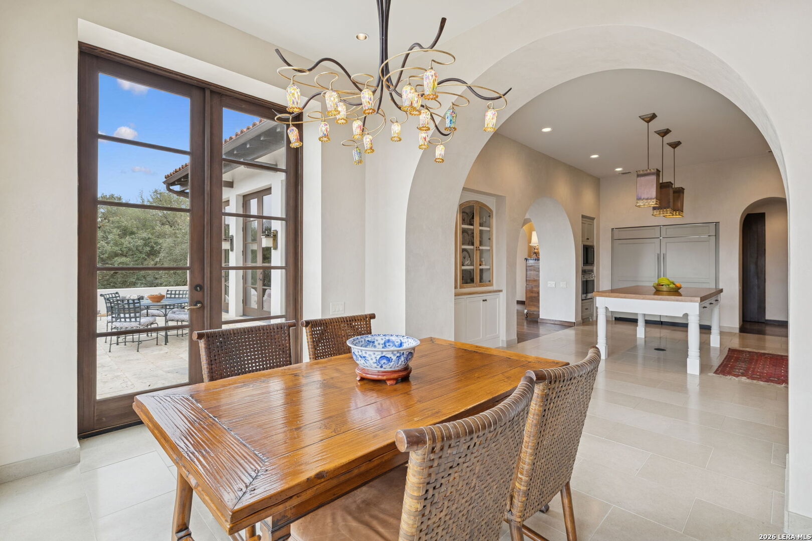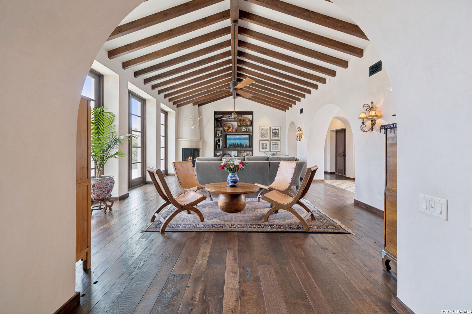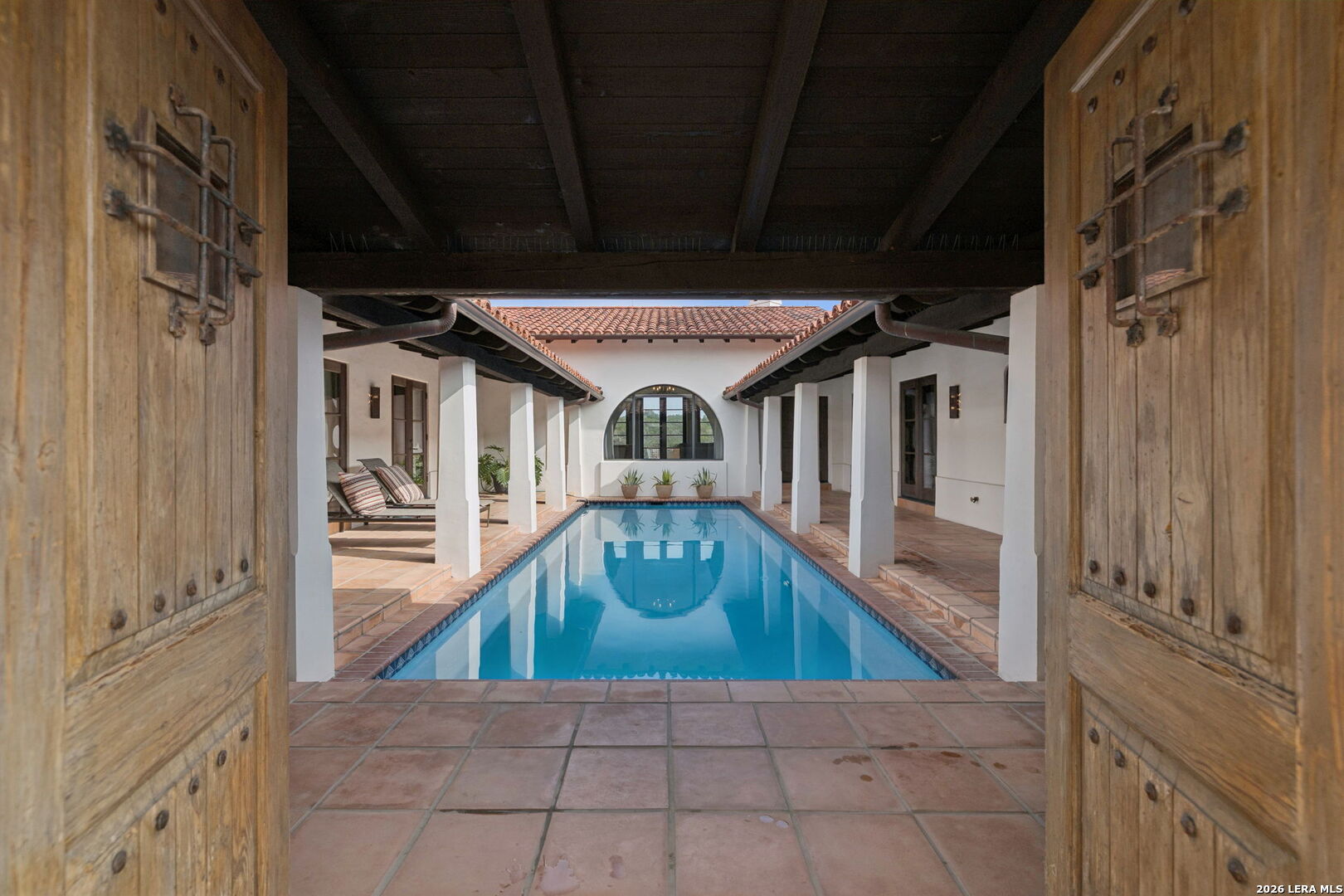 Designed by renowned architect Michael G. Imber, the home, drawing from a Spanish Colonial vocabulary is composed with stone, stucco, and clay tile, that feels established within its setting. Set across 8.21 acres in Bandera, this custom residence sits well back from the road, with mature trees and long sightlines shaping the approach. Entry is through a covered loggia that establishes the home's internal rhythm. Venetian plaster walls, reclaimed wood floors, and arched openings carry through the interior, with circulation oriented toward outdoor rooms and sheltered passages. The great room anchors the plan with a pitched ceiling, stained fir beams, and a stone fireplace. Large openings connect directly to the terrace, allowing light and air to move easily through the space. The kitchen is proportioned for use, with custom cabinetry, inset Subzero and Wolf appliances, a substantial island, and direct connection to adjacent dining areas. Circulation remains clear and intuitive, supporting daily living and larger gatherings without formality. The primary suite opens to the loggia and garden, set apart within the plan. The primary bath includes carved stone details, custom cabinetry, and a soaking tub positioned beneath a window oriented toward the landscape. Guest bedrooms are spaced for privacy, each with its own bath and outdoor access to the loggia. A study and a den or media room are positioned away from the main living areas, maintaining separation without disrupting flow. Outdoor living spaces are integral to the architecture. The terrace extends from the great room and dining areas, with the pool positioned as a visual anchor within the outdoor sequence. Covered seating areas and fireplaces support year-round use. The acreage continues toward the Medina River, which runs seasonally and contributes to the character of the land.