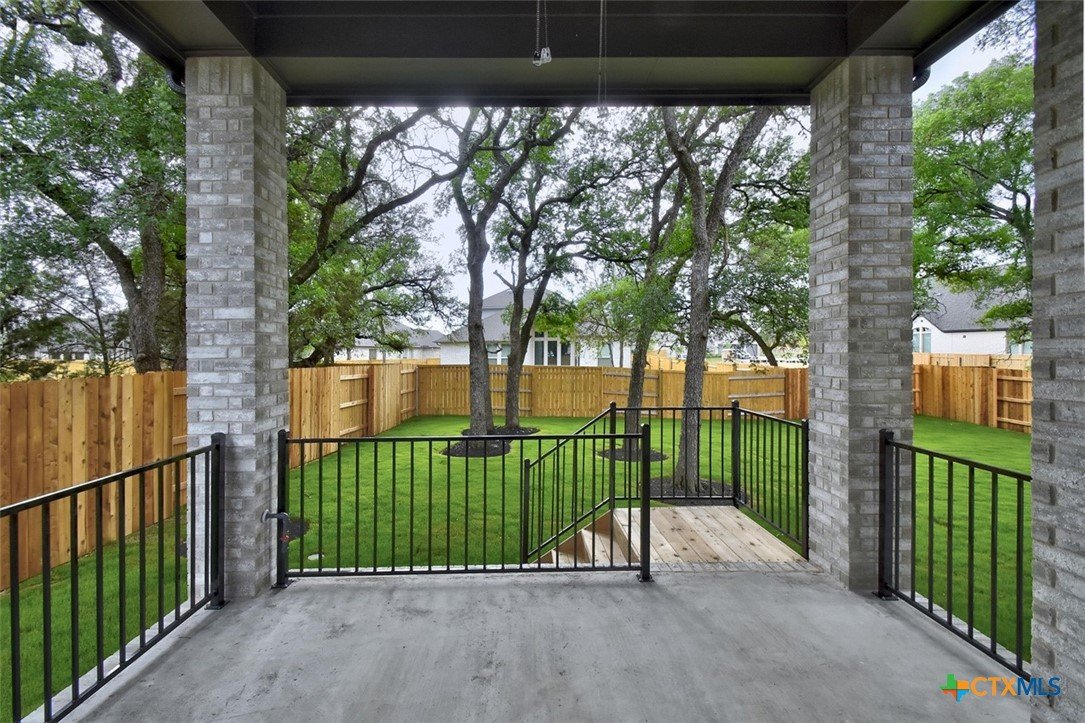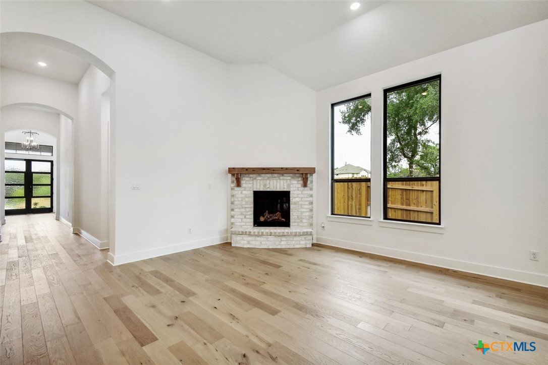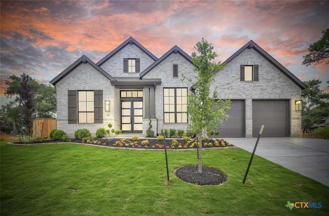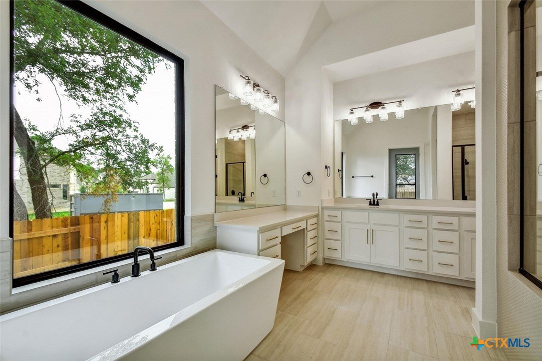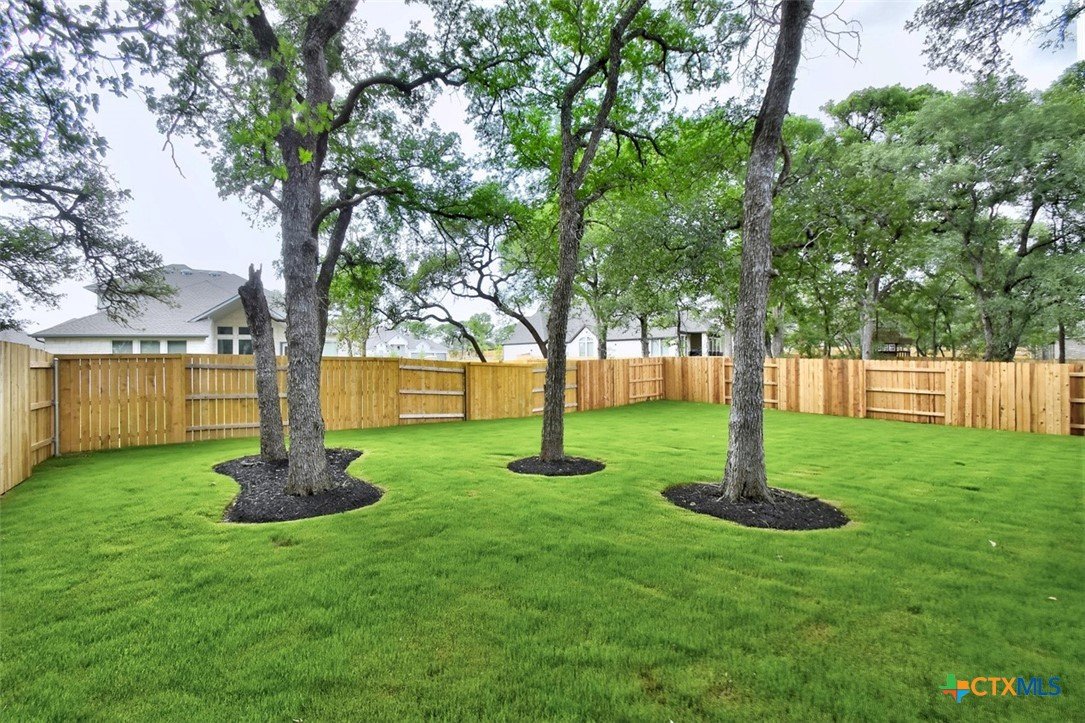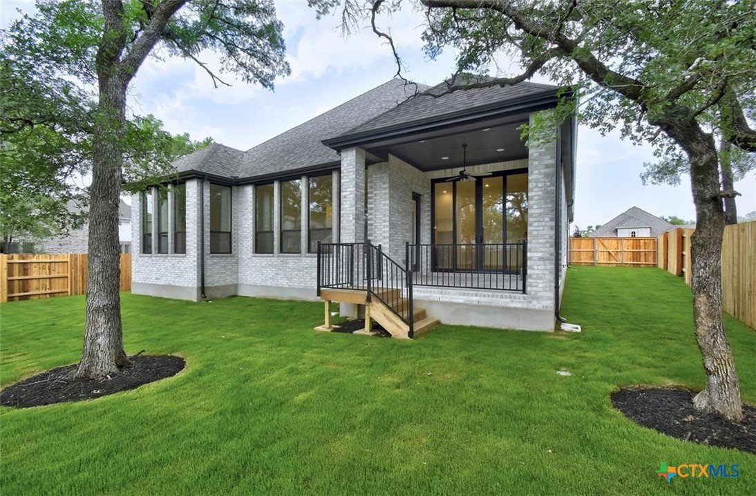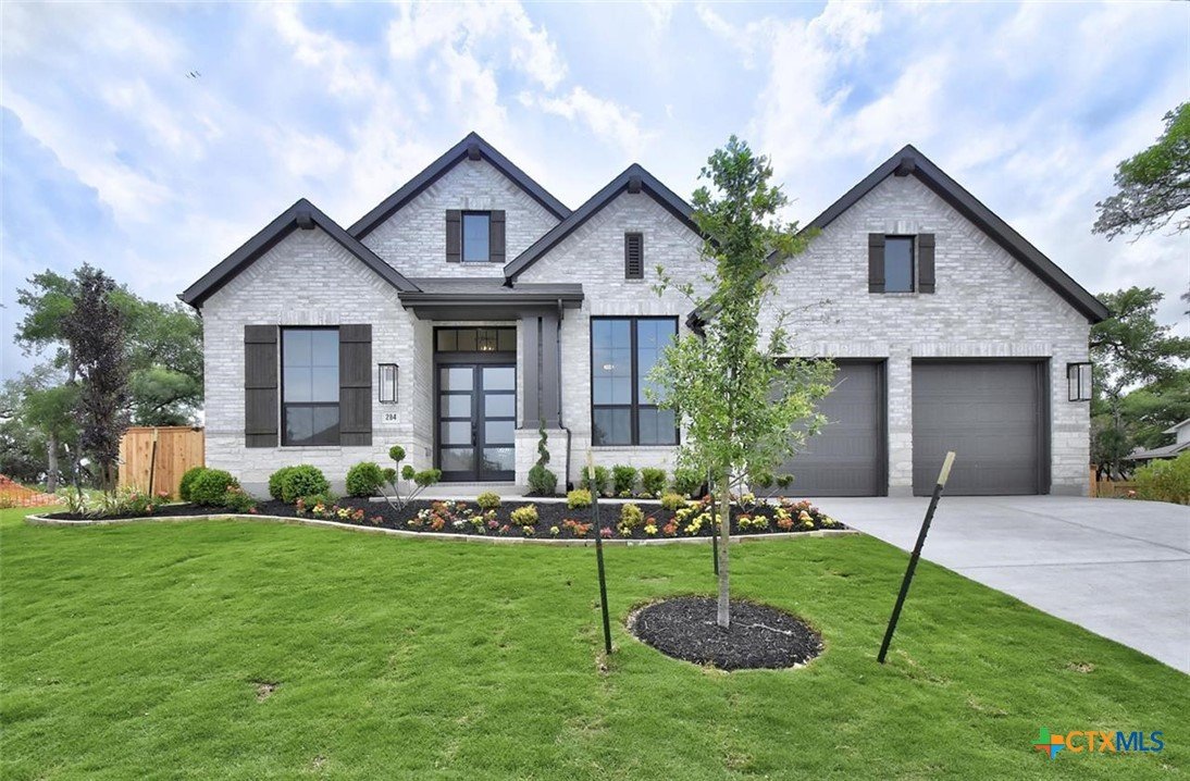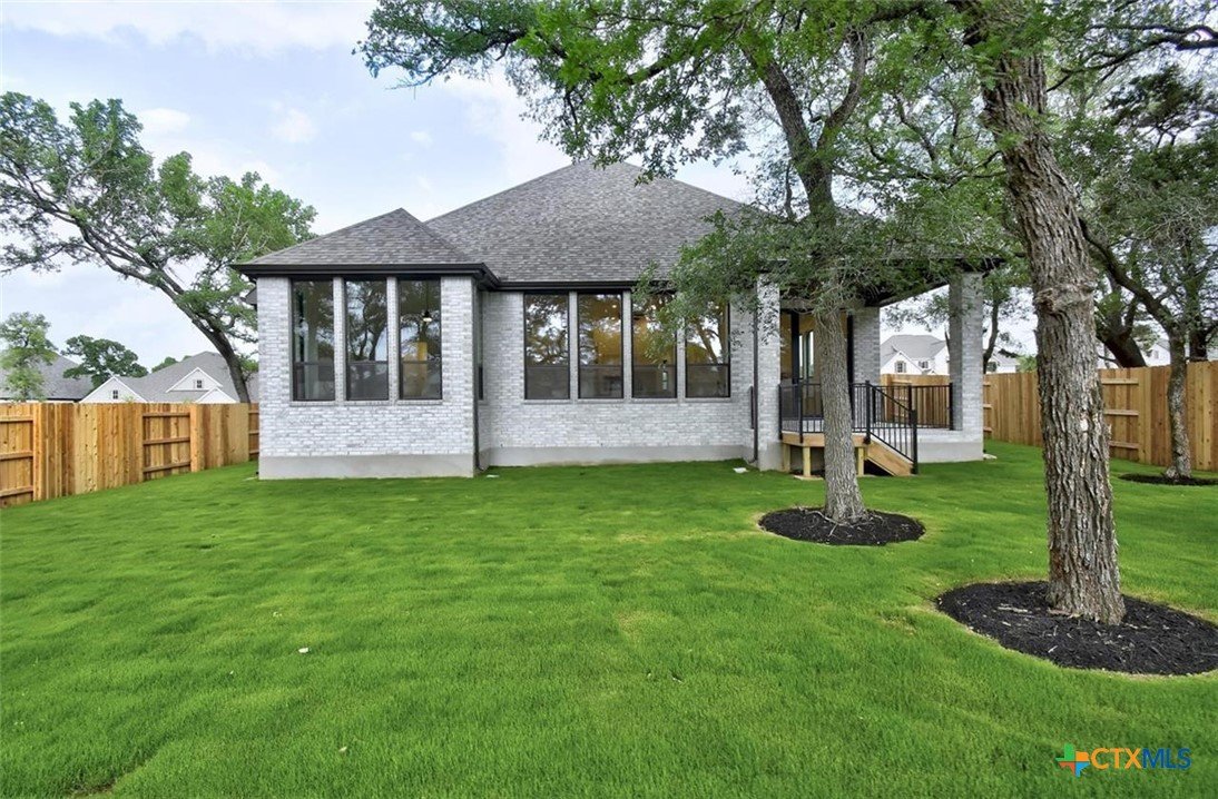 MLS 566799 - Built by Highland Homes - Ready Now! ~ 0.25 ACRES - mature oak trees preserved onsite! Big enough for future pool! Stunning home with light exterior & black window frames for designer look. Upgraded stone-edge landscaped beds for tons of curb appeal. ALL beds have full baths connected! Study & media room for multiple flex-spaces. Cozy brick fireplace & sliding glass doors that lead to private patio. Gourmet kitchen with apron-front sink, HUGE island & peninsula for perfect entertaining home. Luxury primary suite with sitting area & freestanding tub w separate shower. Primary closet has direct access to laundry room which is suited up with cabinets & sink for easy living. Wood floors throughout all common areas, study & primary bed. Energy STAR home & smart home technology package included! Must see!