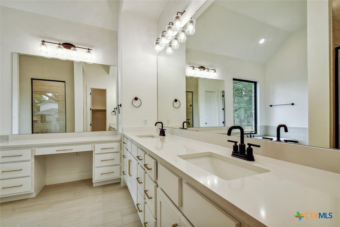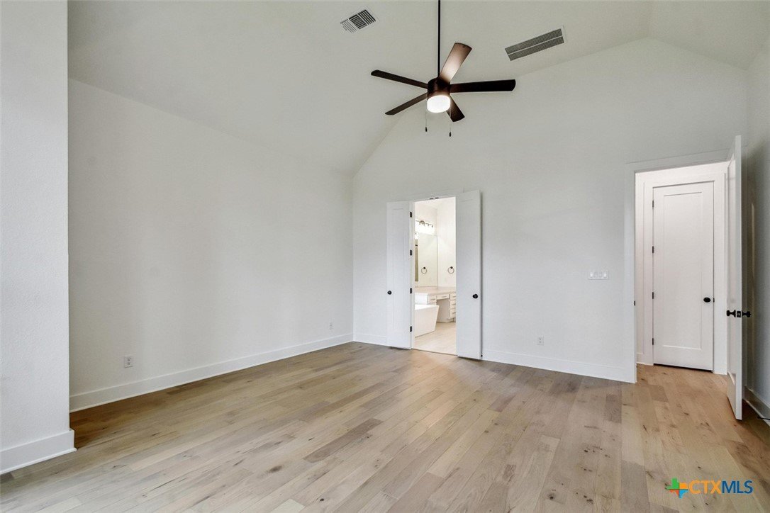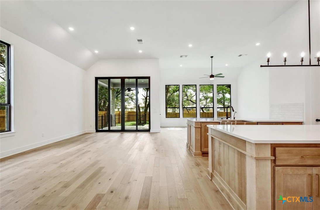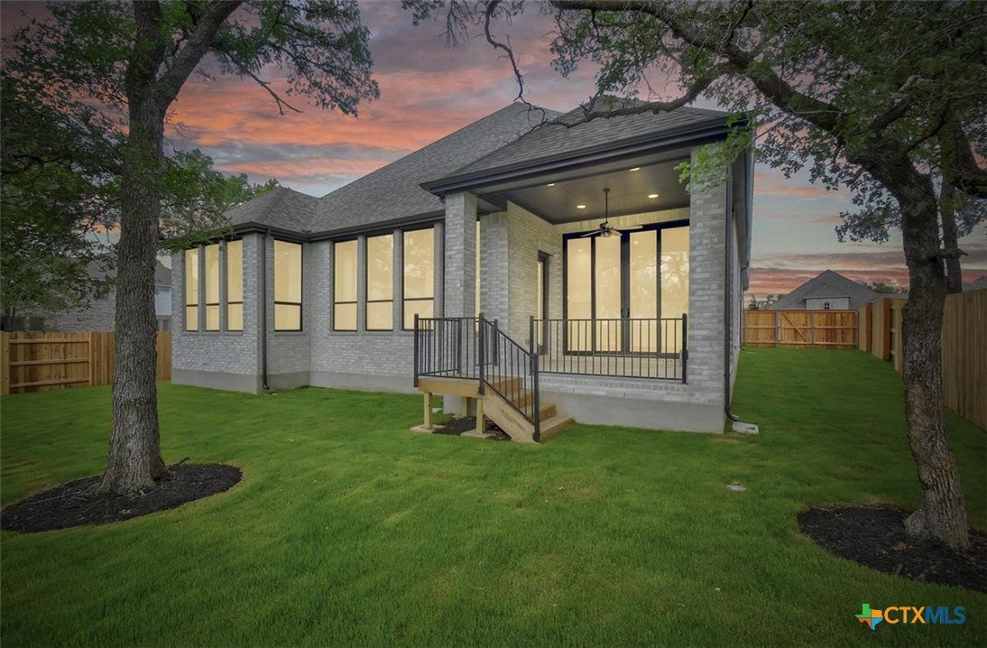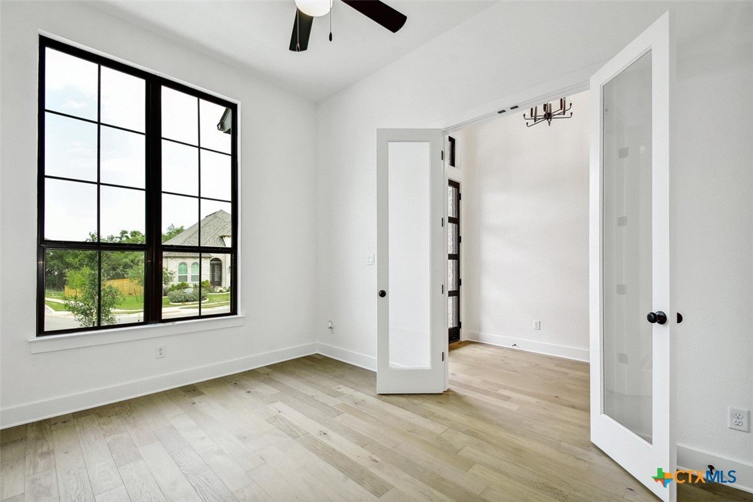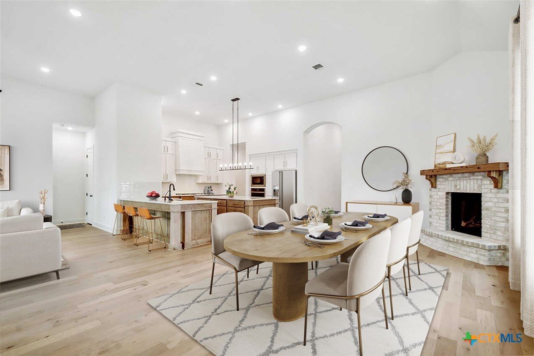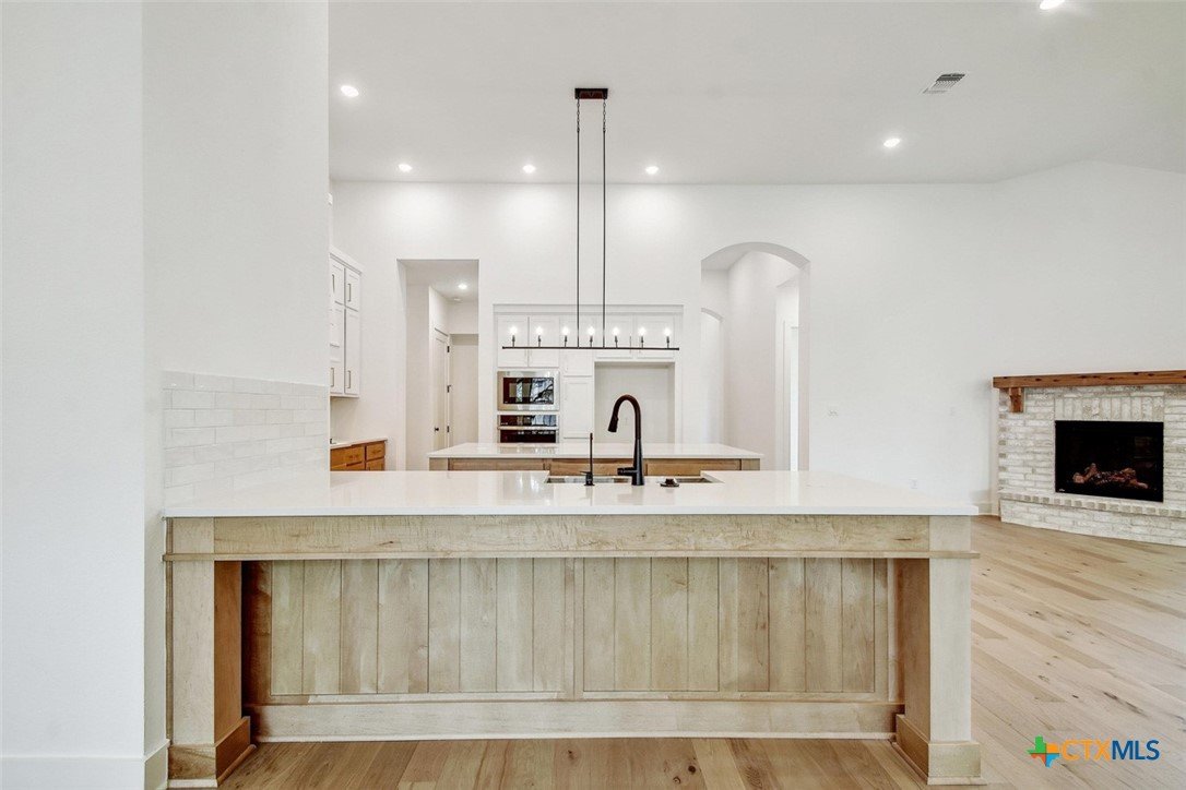 MLS 566799 - Built by Highland Homes - Ready Now! ~ 0.25 ACRES - mature oak trees preserved onsite! Big enough for future pool! Stunning home with light exterior & black window frames for designer look. Upgraded stone-edge landscaped beds for tons of curb appeal. ALL beds have full baths connected! Study & media room for multiple flex-spaces. Cozy brick fireplace & sliding glass doors that lead to private patio. Gourmet kitchen with apron-front sink, HUGE island & peninsula for perfect entertaining home. Luxury primary suite with sitting area & freestanding tub w separate shower. Primary closet has direct access to laundry room which is suited up with cabinets & sink for easy living. Wood floors throughout all common areas, study & primary bed. Energy STAR home & smart home technology package included! Must see!