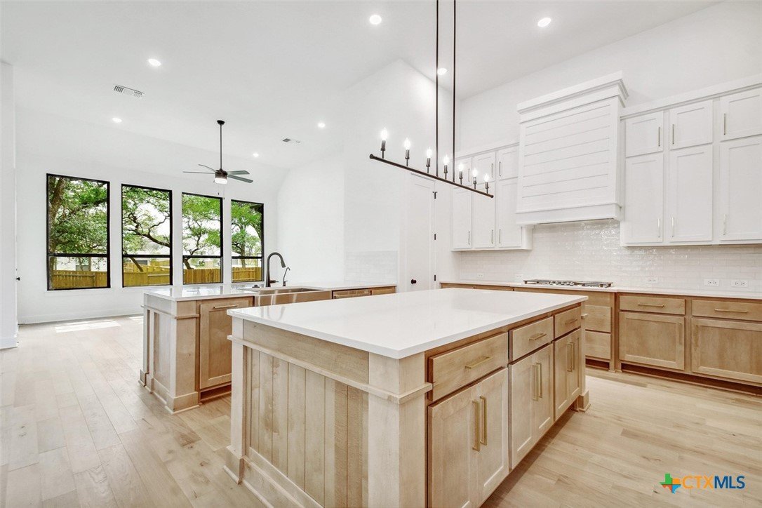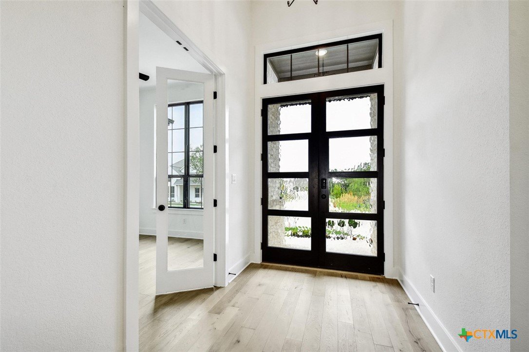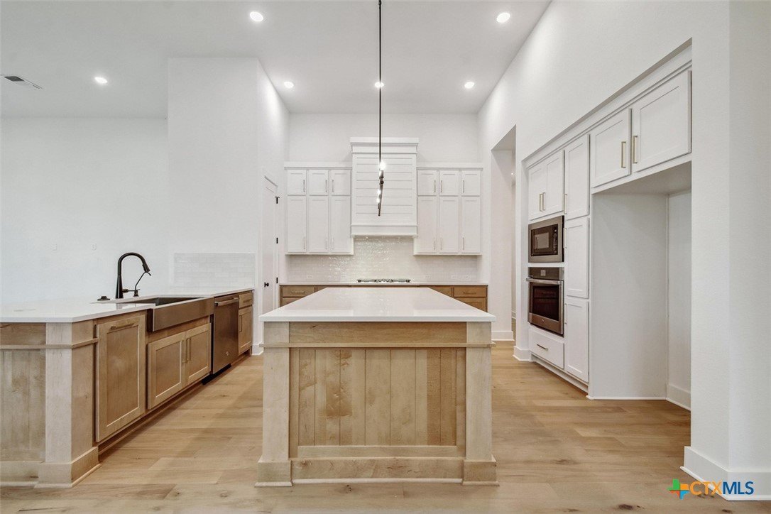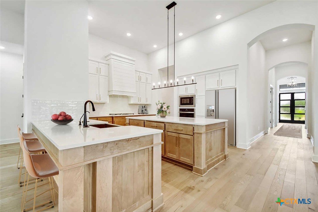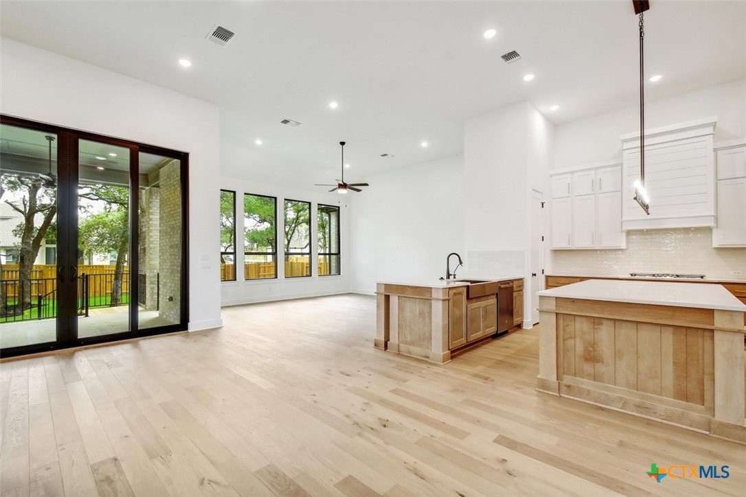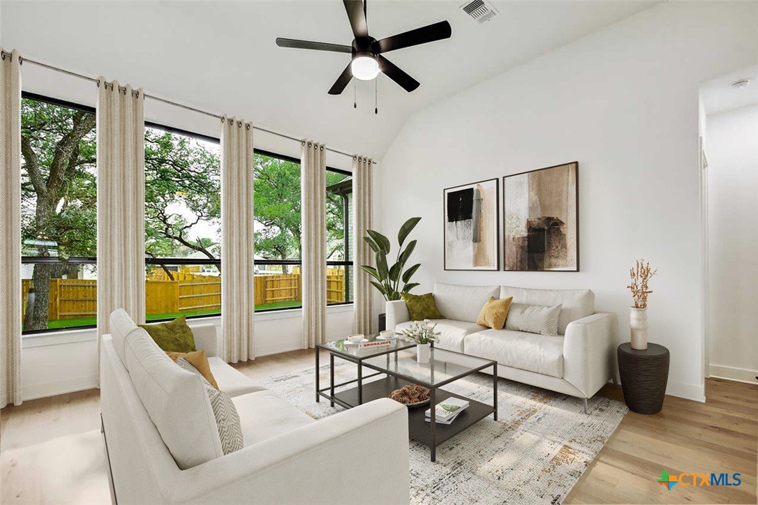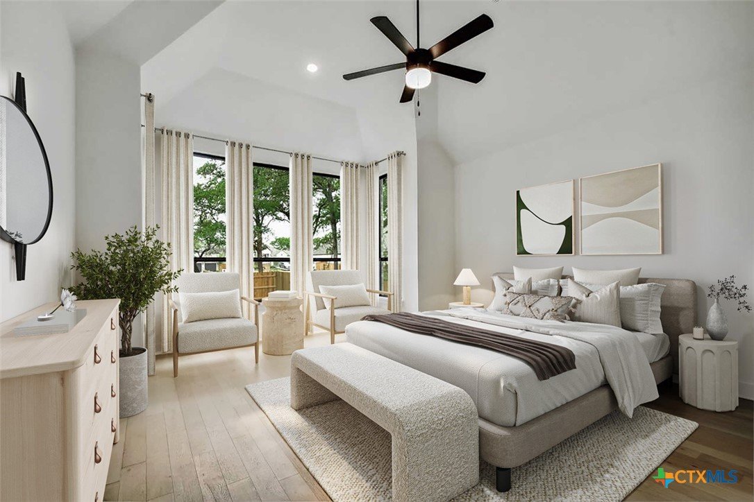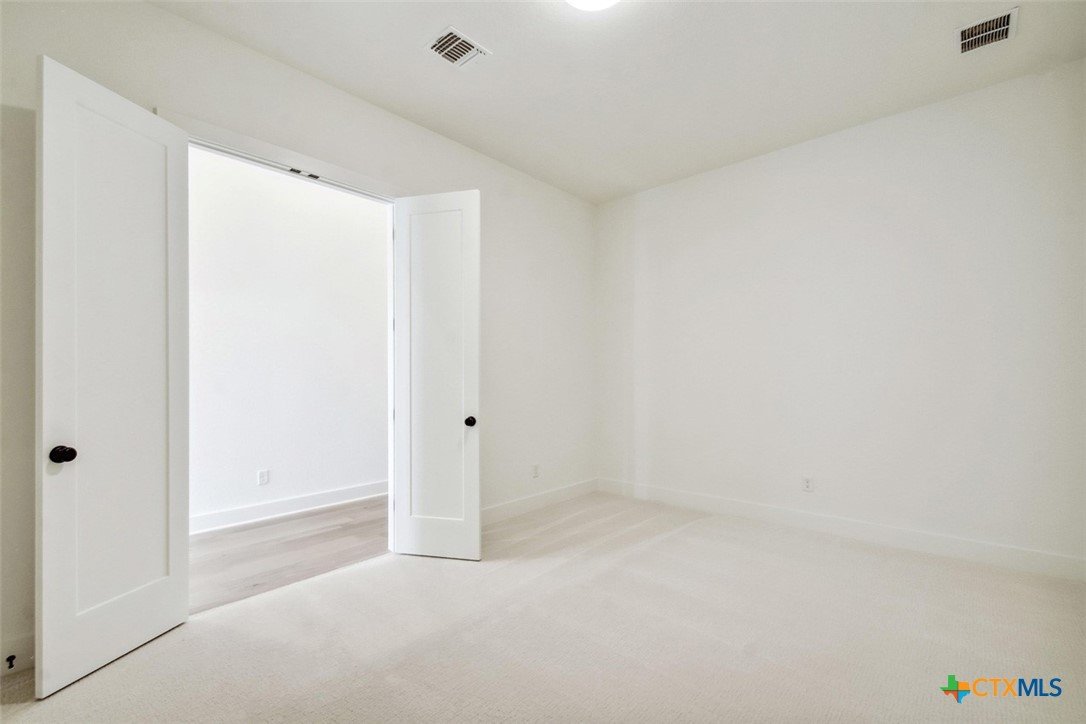 MLS 566799 - Built by Highland Homes - Ready Now! ~ 0.25 ACRES - mature oak trees preserved onsite! Big enough for future pool! Stunning home with light exterior & black window frames for designer look. Upgraded stone-edge landscaped beds for tons of curb appeal. ALL beds have full baths connected! Study & media room for multiple flex-spaces. Cozy brick fireplace & sliding glass doors that lead to private patio. Gourmet kitchen with apron-front sink, HUGE island & peninsula for perfect entertaining home. Luxury primary suite with sitting area & freestanding tub w separate shower. Primary closet has direct access to laundry room which is suited up with cabinets & sink for easy living. Wood floors throughout all common areas, study & primary bed. Energy STAR home & smart home technology package included! Must see!