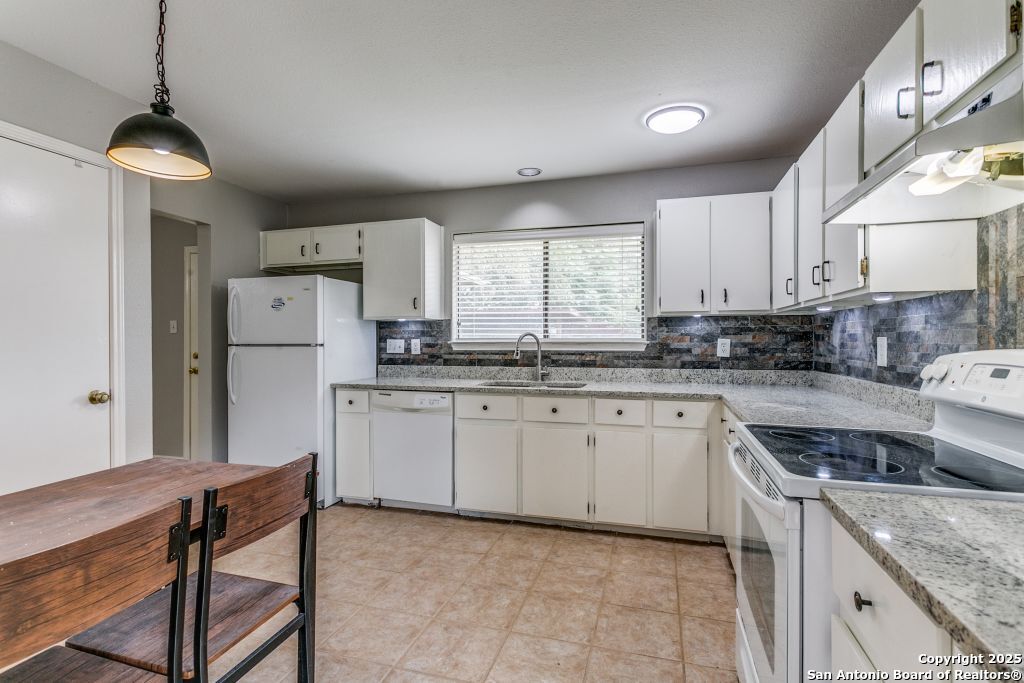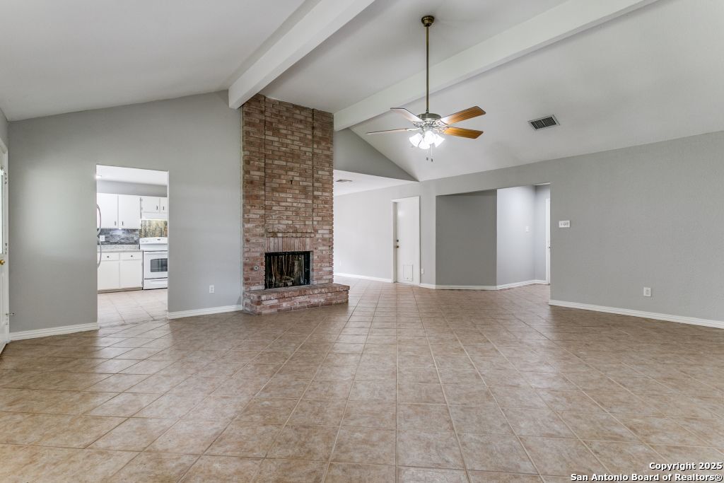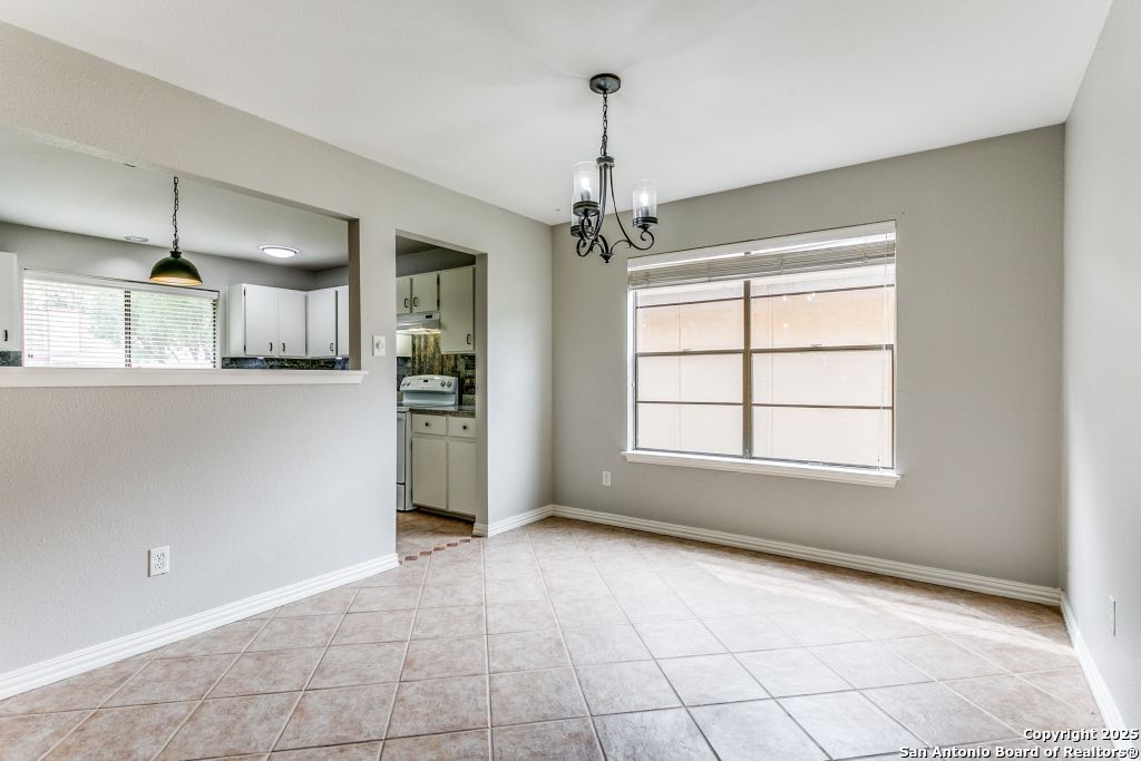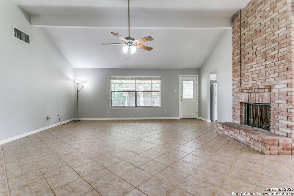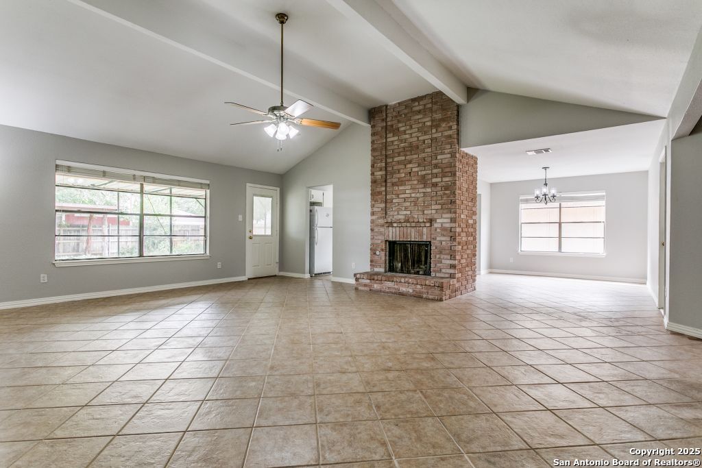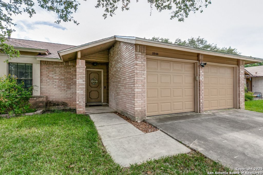 This move-in ready home with recent updates features large mature oak trees in both the front and back yards providing beauty and shade. Inside, enjoy recent updates, including new interior paint throughout, kitchen and bathroom counter-tops as well as fixtures in both and updated light fixtures- April thru July 2025. This home has a floor to ceiling brick fireplace, an open living layout and vaulted ceilings. The primary suite offers two walk-in closets. The roof was replaced in 2021. You'll be just minutes from San Antonio International Airport. The neighborhood has an entrance to McAllister Park which features trails, sports park, and a dog park