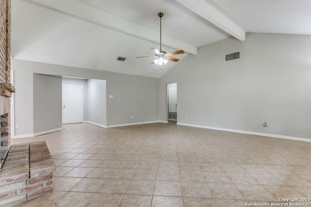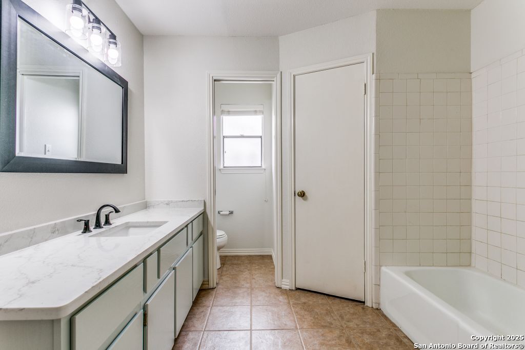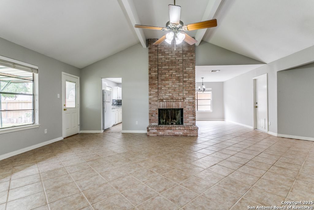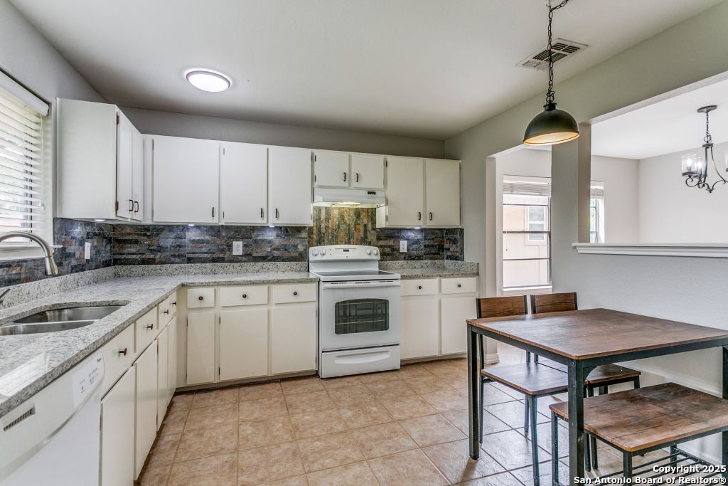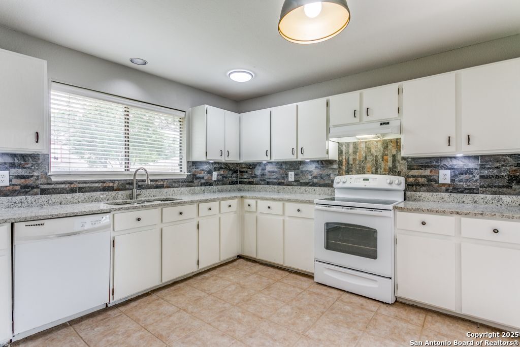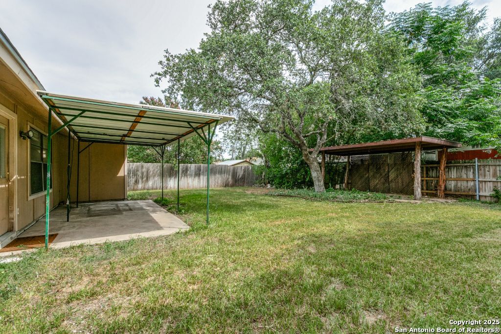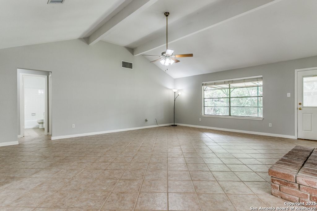 This move-in ready home with recent updates features large mature oak trees in both the front and back yards providing beauty and shade. Inside, enjoy recent updates, including new interior paint throughout, kitchen and bathroom counter-tops as well as fixtures in both and updated light fixtures- April thru July 2025. This home has a floor to ceiling brick fireplace, an open living layout and vaulted ceilings. The primary suite offers two walk-in closets. The roof was replaced in 2021. You'll be just minutes from San Antonio International Airport. The neighborhood has an entrance to McAllister Park which features trails, sports park, and a dog park