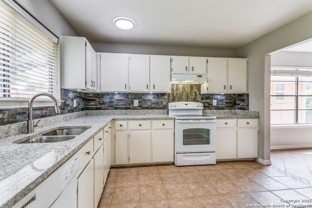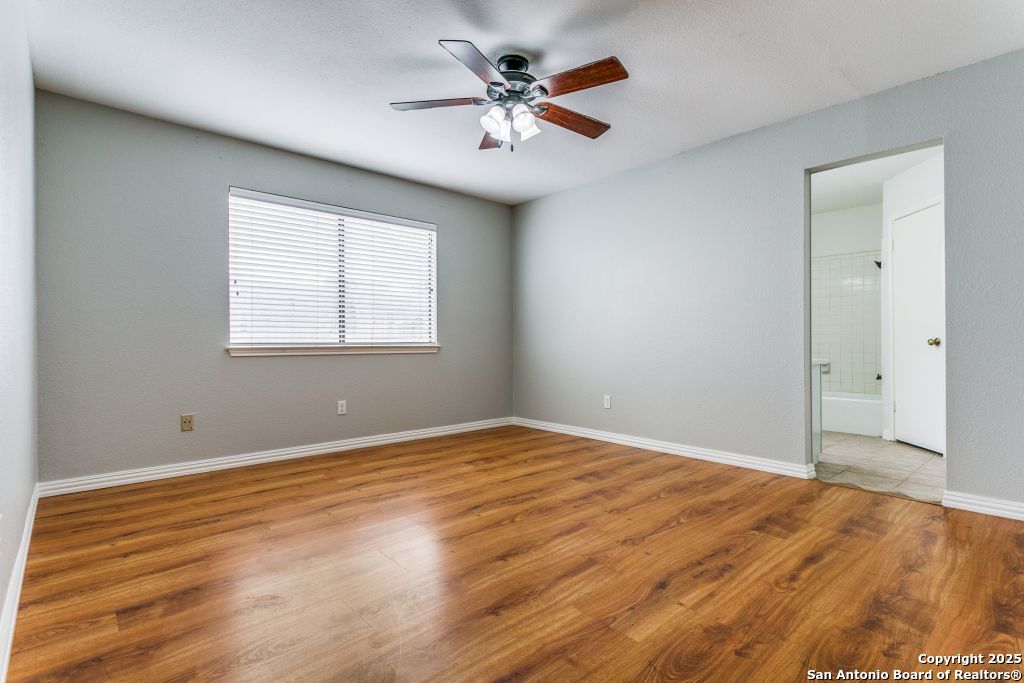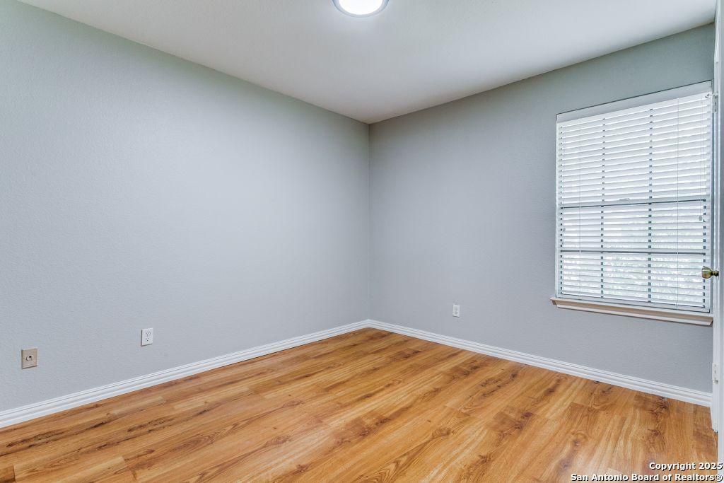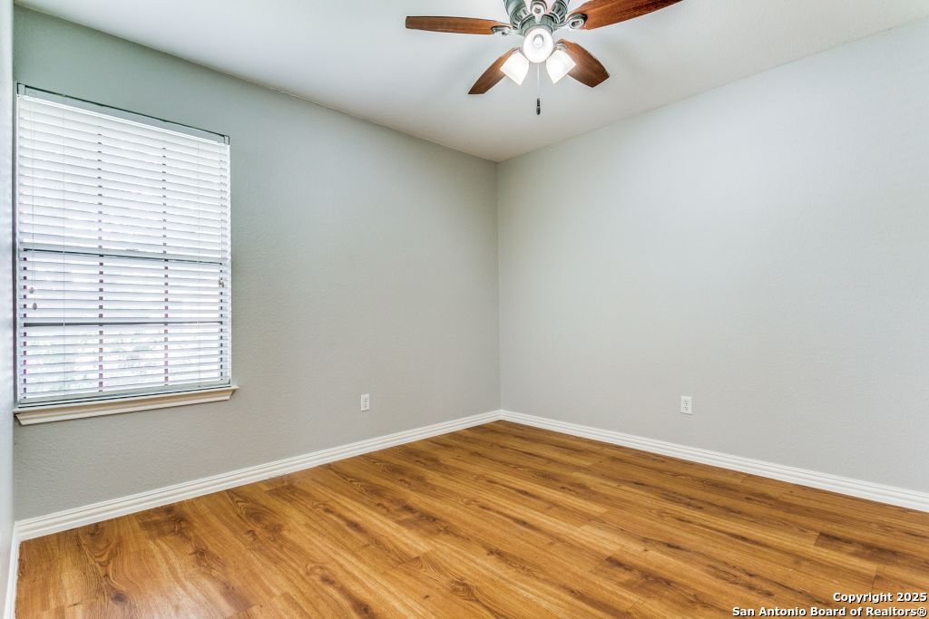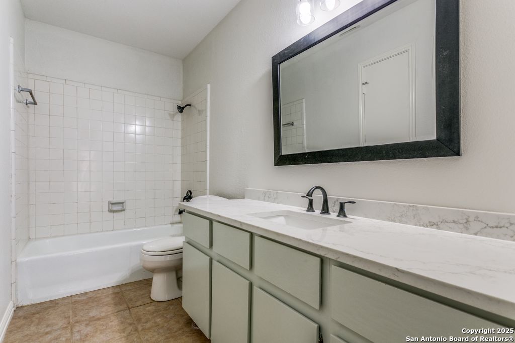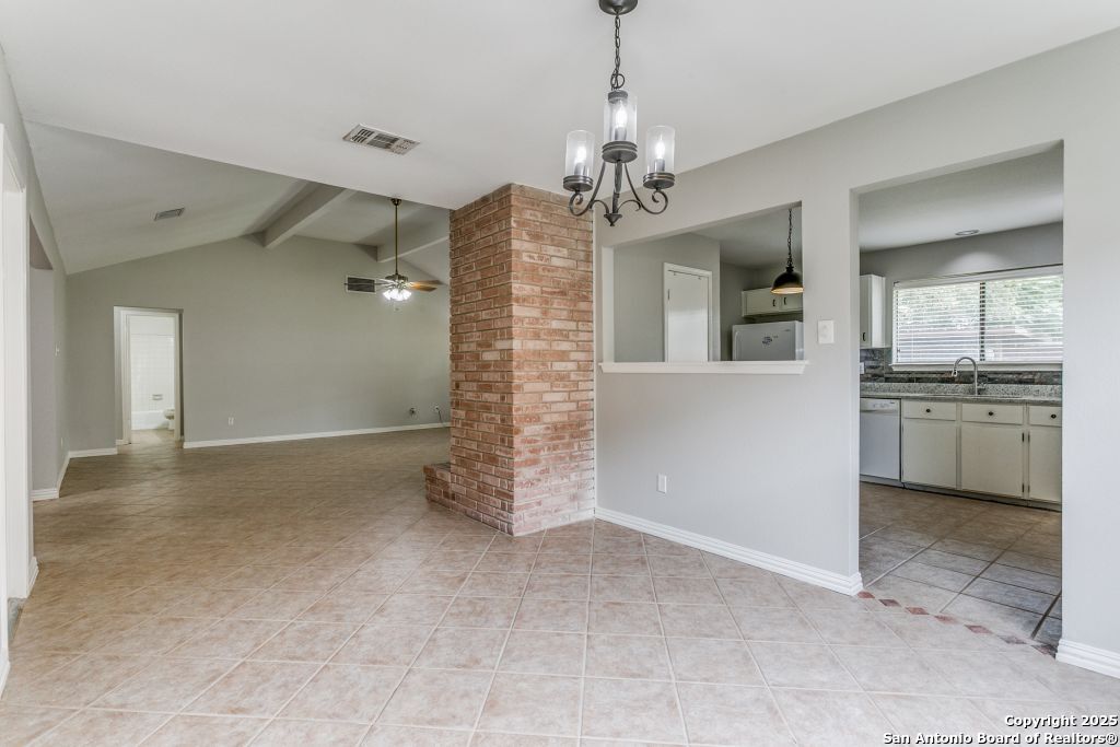 This move-in ready home with recent updates features large mature oak trees in both the front and back yards providing beauty and shade. Inside, enjoy recent updates, including new interior paint throughout, kitchen and bathroom counter-tops as well as fixtures in both and updated light fixtures- April thru July 2025. This home has a floor to ceiling brick fireplace, an open living layout and vaulted ceilings. The primary suite offers two walk-in closets. The roof was replaced in 2021. You'll be just minutes from San Antonio International Airport. The neighborhood has an entrance to McAllister Park which features trails, sports park, and a dog park