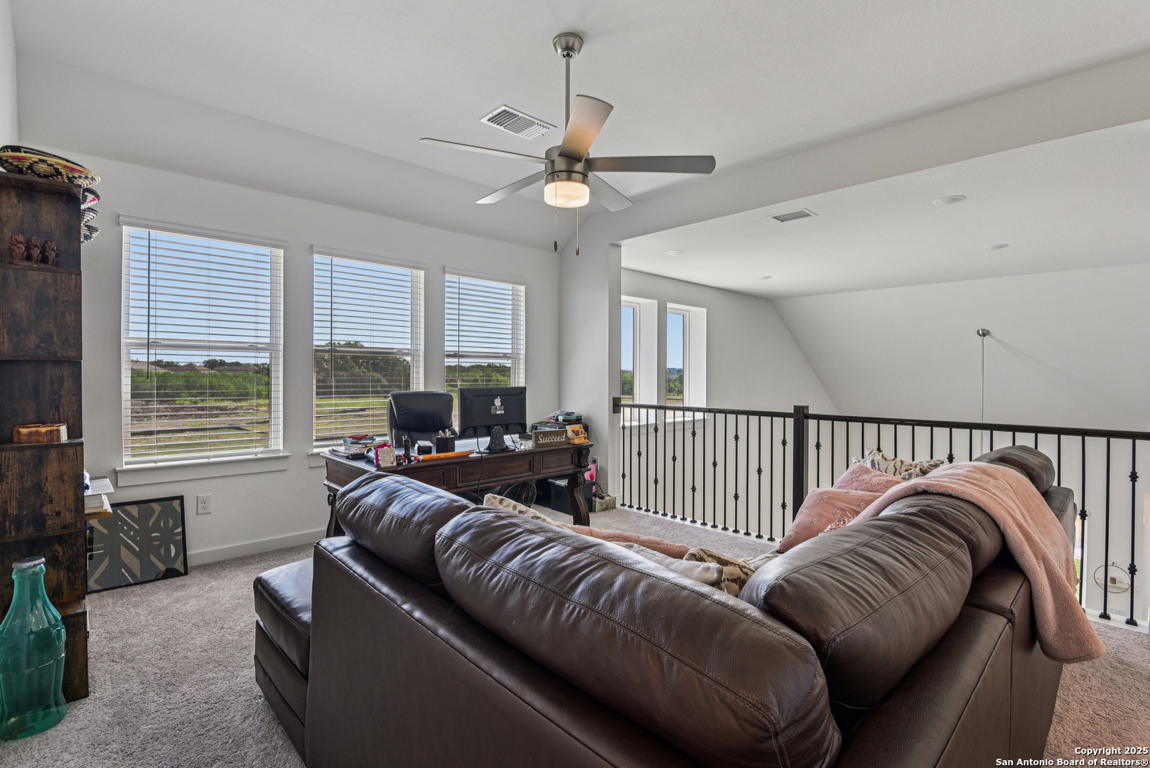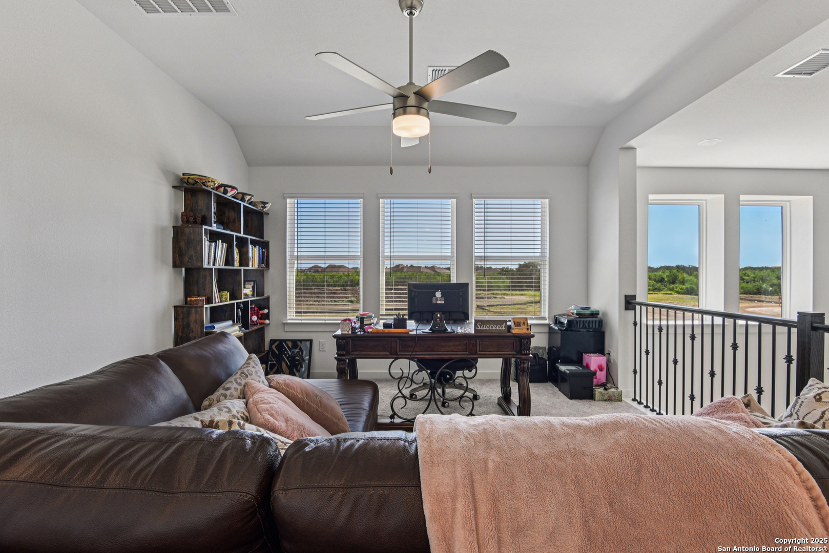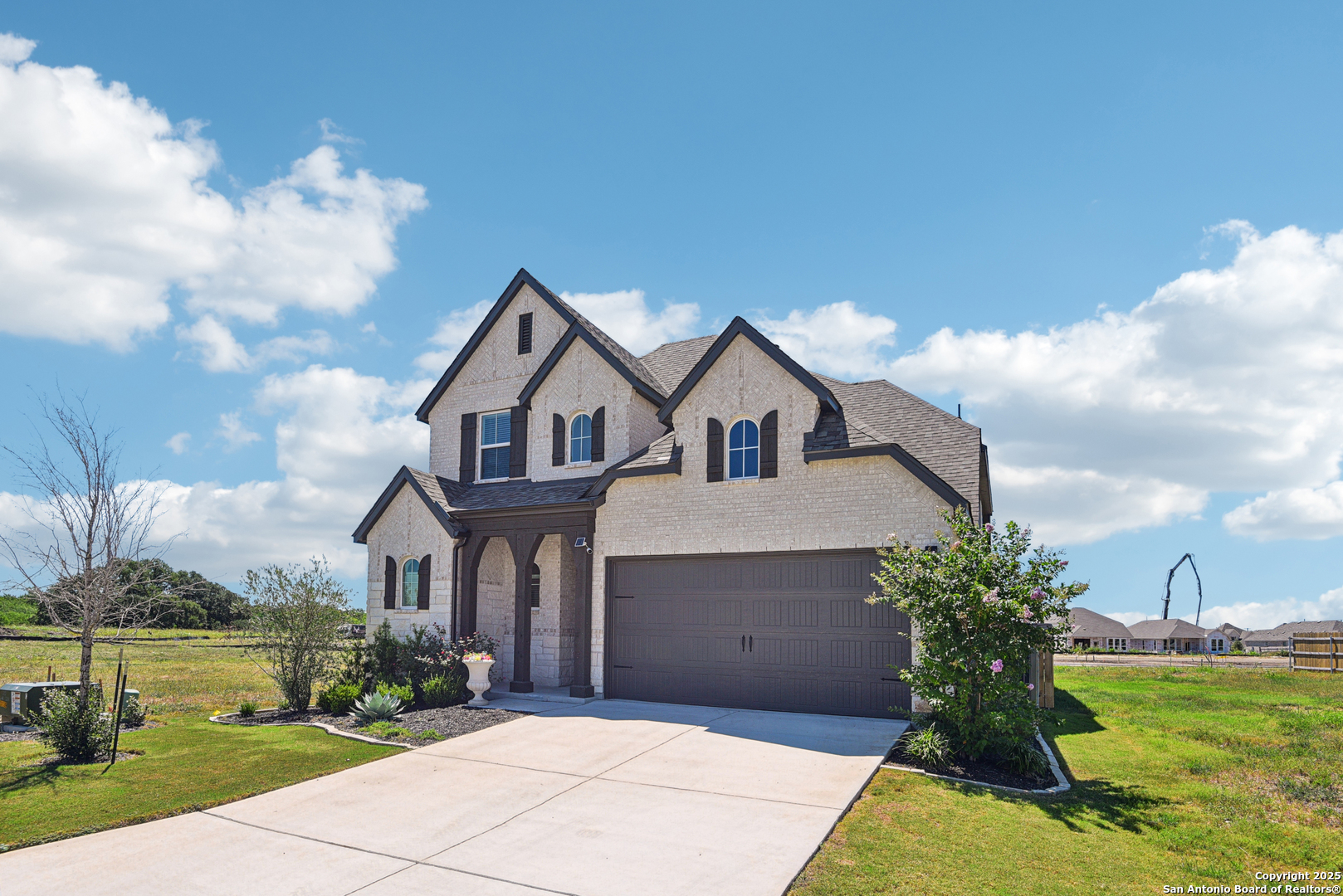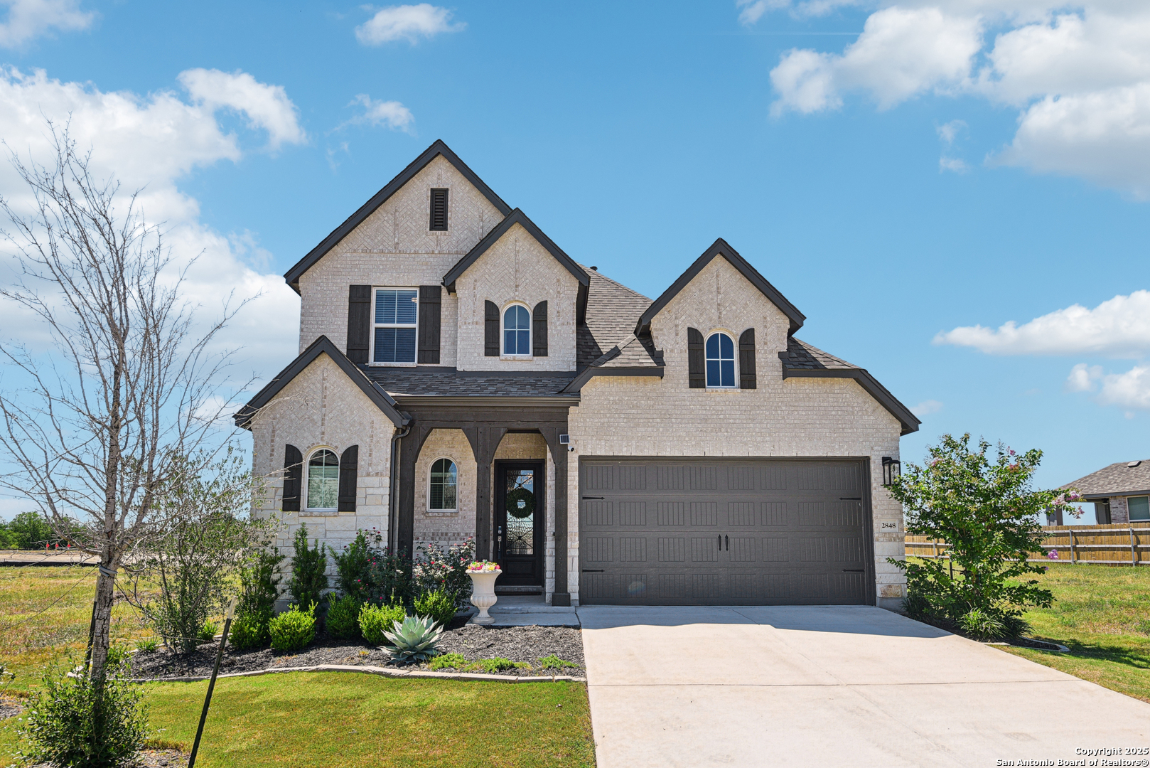This spacious 2-story home in Sunflower Ridge offers a flexible layout with 5 bedrooms and abundant natural light throughout. The open floor plan features high ceilings and a dramatic spiral staircase that adds character and charm. The gourmet kitchen is designed with function in mind, featuring a large island, breakfast bar, gas cooking, pantry, and ample counter and cabinet space. A dedicated home office provides the ideal setup for remote work or study. The first-floor primary suite is thoughtfully positioned apart from the other bedrooms and includes a private bath with a drop-in tub, walk-in shower, and peaceful backyard views. A second bedroom on the main floor adds convenience for guests or multi-generational living. Upstairs, you'll find three generously sized bedrooms and a versatile loft that works well as a second living area or game room. The backyard features a covered patio and privacy fence, offering a comfortable outdoor space for relaxing or entertaining. Located close to shopping and I-35, this home combines space, comfort, and convenience. Schedule your tour today.