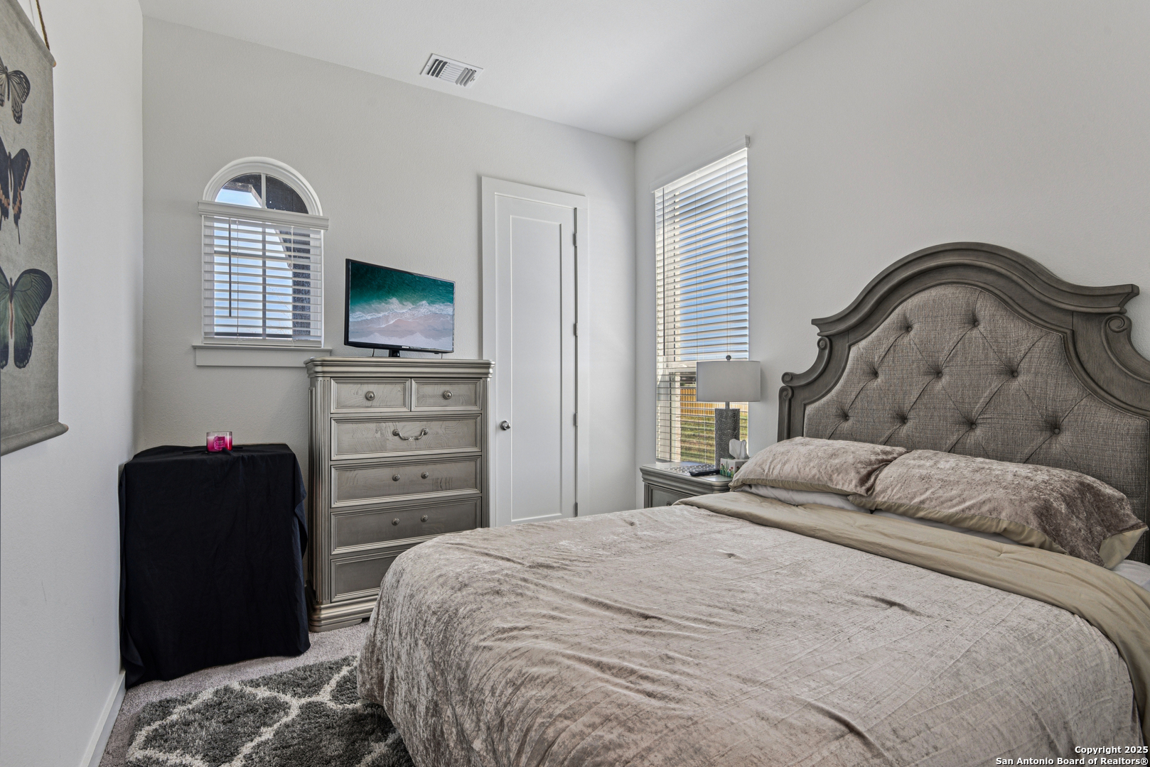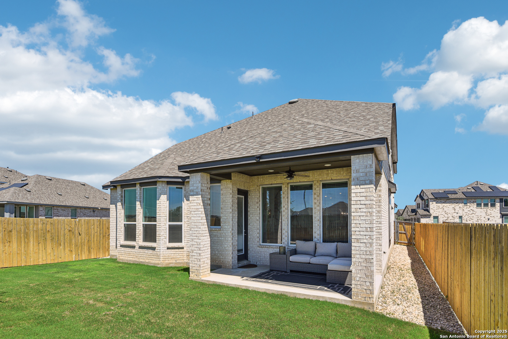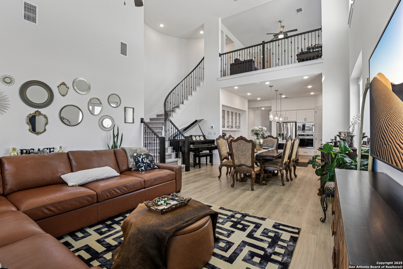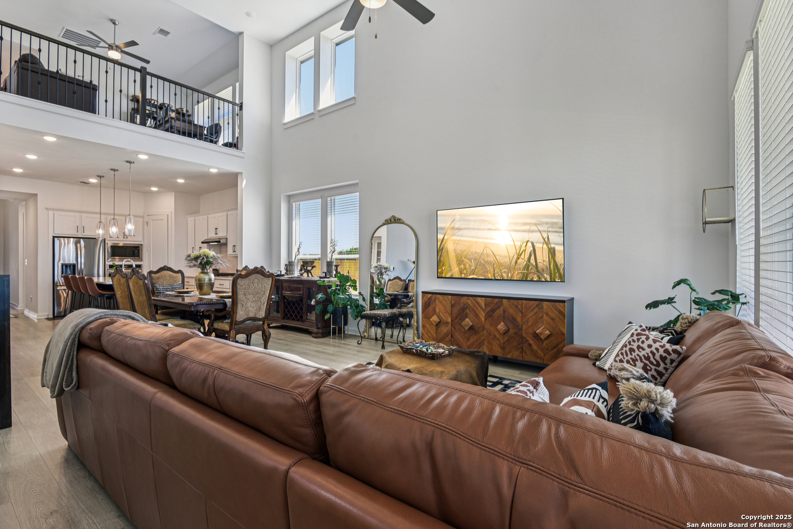 This spacious 2-story home in Sunflower Ridge offers a flexible layout with 5 bedrooms and abundant natural light throughout. The open floor plan features high ceilings and a dramatic spiral staircase that adds character and charm. The gourmet kitchen is designed with function in mind, featuring a large island, breakfast bar, gas cooking, pantry, and ample counter and cabinet space. A dedicated home office provides the ideal setup for remote work or study. The first-floor primary suite is thoughtfully positioned apart from the other bedrooms and includes a private bath with a drop-in tub, walk-in shower, and peaceful backyard views. A second bedroom on the main floor adds convenience for guests or multi-generational living. Upstairs, you'll find three generously sized bedrooms and a versatile loft that works well as a second living area or game room. The backyard features a covered patio and privacy fence, offering a comfortable outdoor space for relaxing or entertaining. Located close to shopping and I-35, this home combines space, comfort, and convenience. Schedule your tour today.
