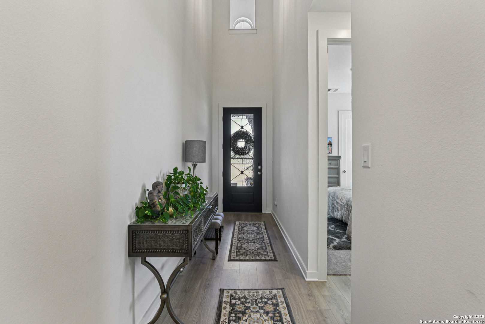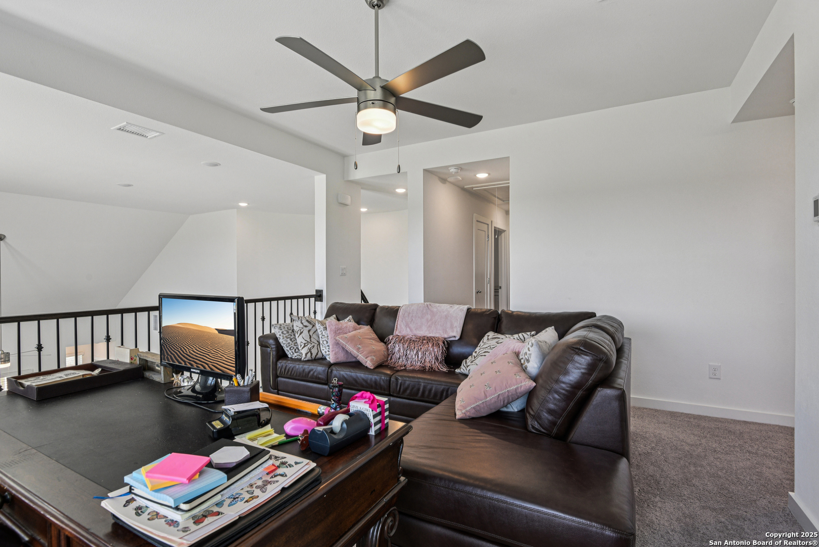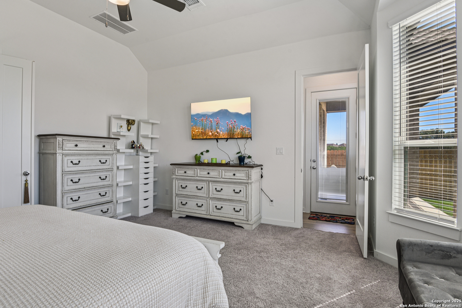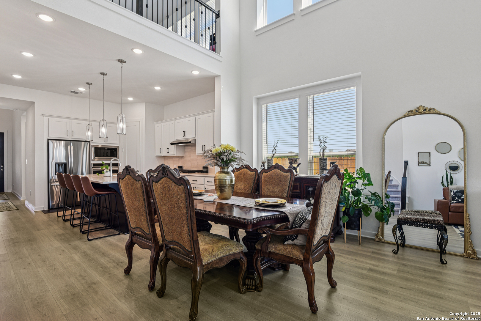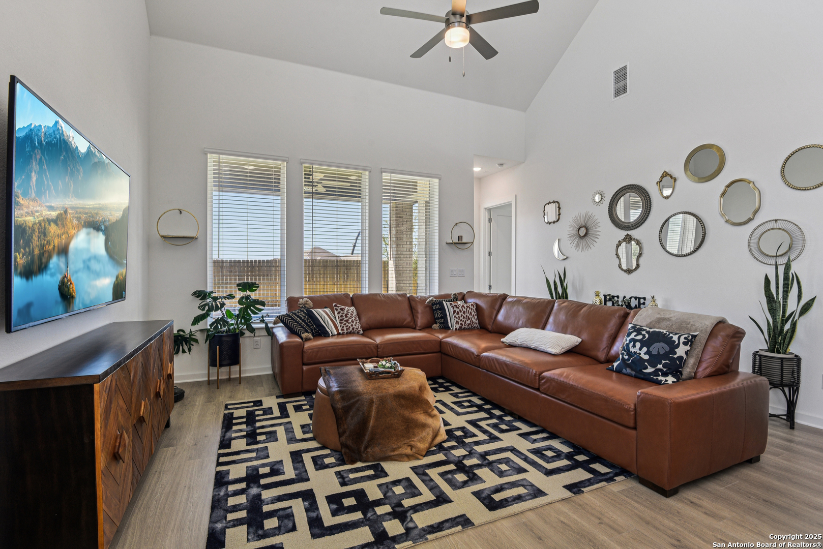 This spacious 2-story home in Sunflower Ridge offers a flexible layout with 5 bedrooms and abundant natural light throughout. The open floor plan features high ceilings and a dramatic spiral staircase that adds character and charm. The gourmet kitchen is designed with function in mind, featuring a large island, breakfast bar, gas cooking, pantry, and ample counter and cabinet space. A dedicated home office provides the ideal setup for remote work or study. The first-floor primary suite is thoughtfully positioned apart from the other bedrooms and includes a private bath with a drop-in tub, walk-in shower, and peaceful backyard views. A second bedroom on the main floor adds convenience for guests or multi-generational living. Upstairs, you'll find three generously sized bedrooms and a versatile loft that works well as a second living area or game room. The backyard features a covered patio and privacy fence, offering a comfortable outdoor space for relaxing or entertaining. Located close to shopping and I-35, this home combines space, comfort, and convenience. Schedule your tour today.