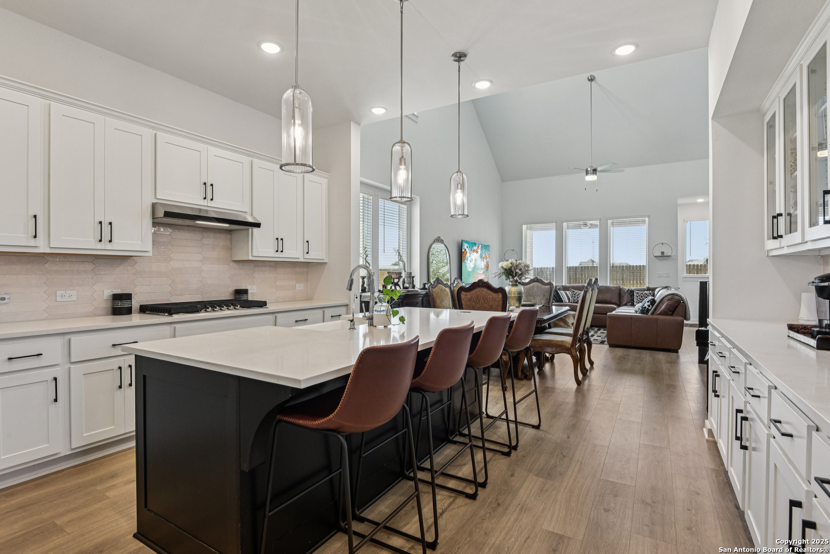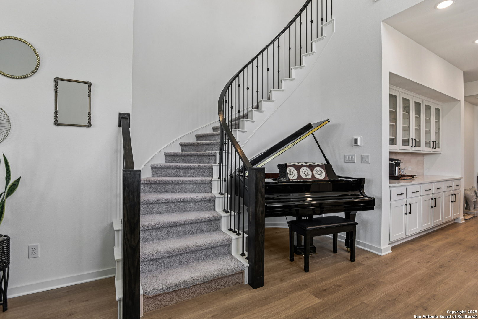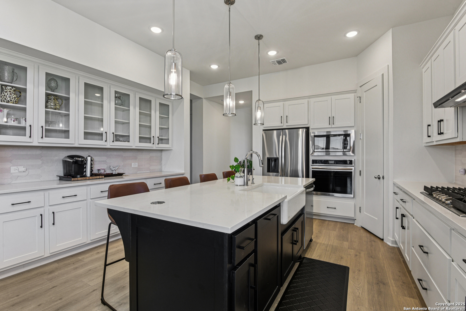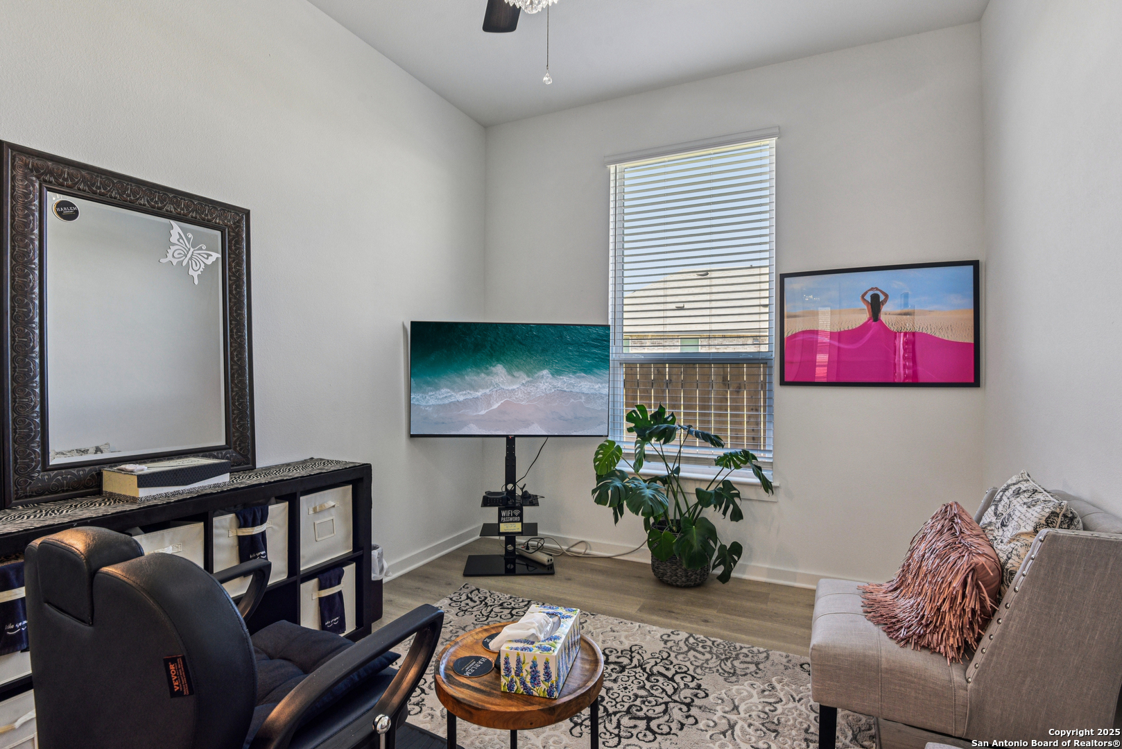 This spacious 2-story home in Sunflower Ridge offers a flexible layout with 5 bedrooms and abundant natural light throughout. The open floor plan features high ceilings and a dramatic spiral staircase that adds character and charm. The gourmet kitchen is designed with function in mind, featuring a large island, breakfast bar, gas cooking, pantry, and ample counter and cabinet space. A dedicated home office provides the ideal setup for remote work or study. The first-floor primary suite is thoughtfully positioned apart from the other bedrooms and includes a private bath with a drop-in tub, walk-in shower, and peaceful backyard views. A second bedroom on the main floor adds convenience for guests or multi-generational living. Upstairs, you'll find three generously sized bedrooms and a versatile loft that works well as a second living area or game room. The backyard features a covered patio and privacy fence, offering a comfortable outdoor space for relaxing or entertaining. Located close to shopping and I-35, this home combines space, comfort, and convenience. Schedule your tour today.