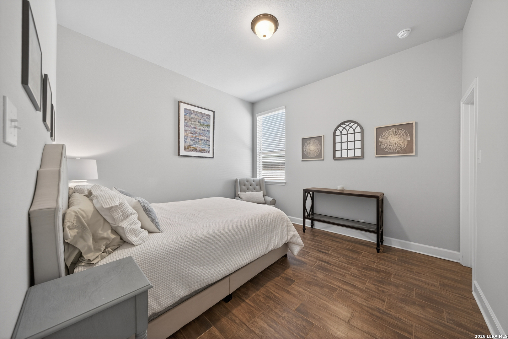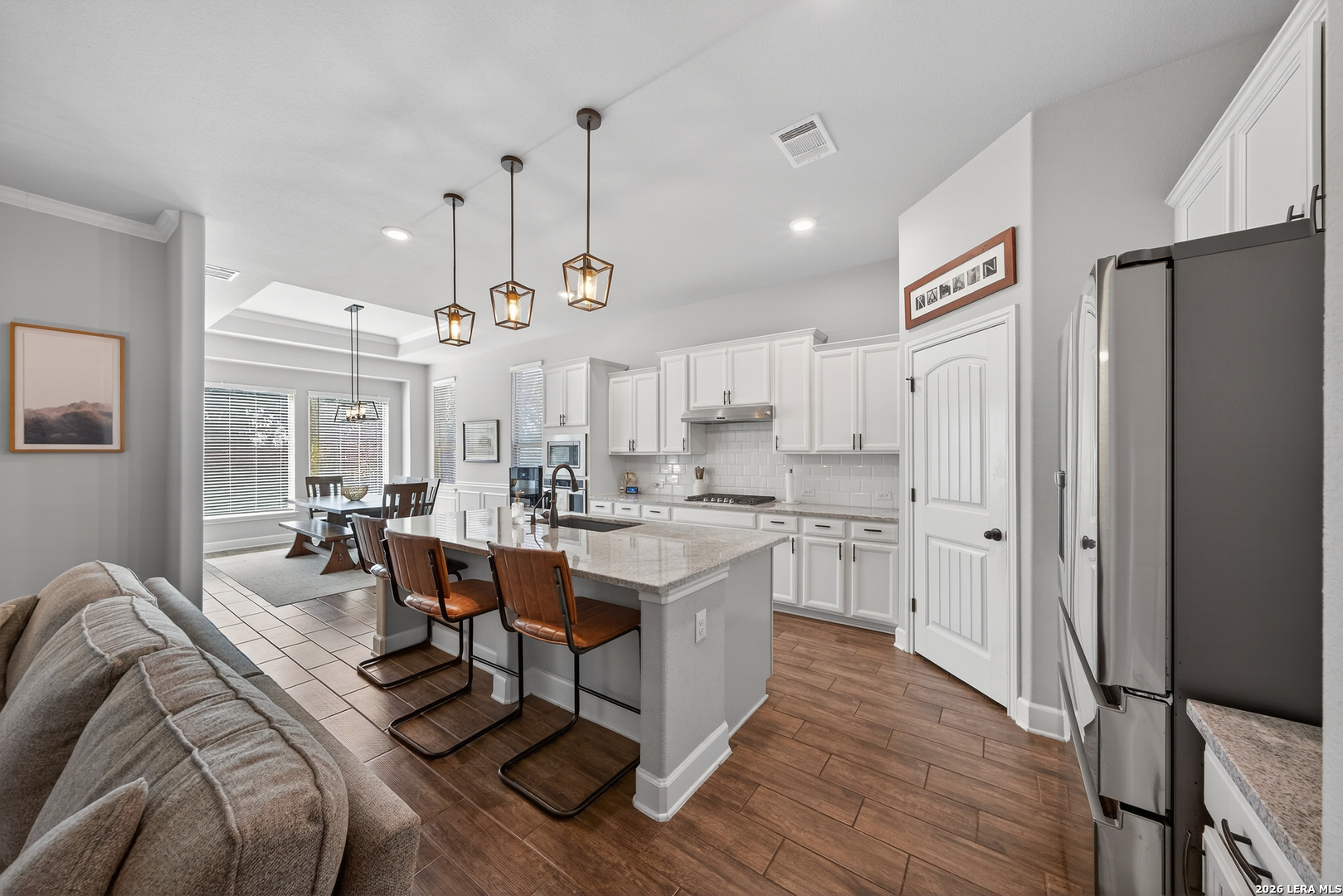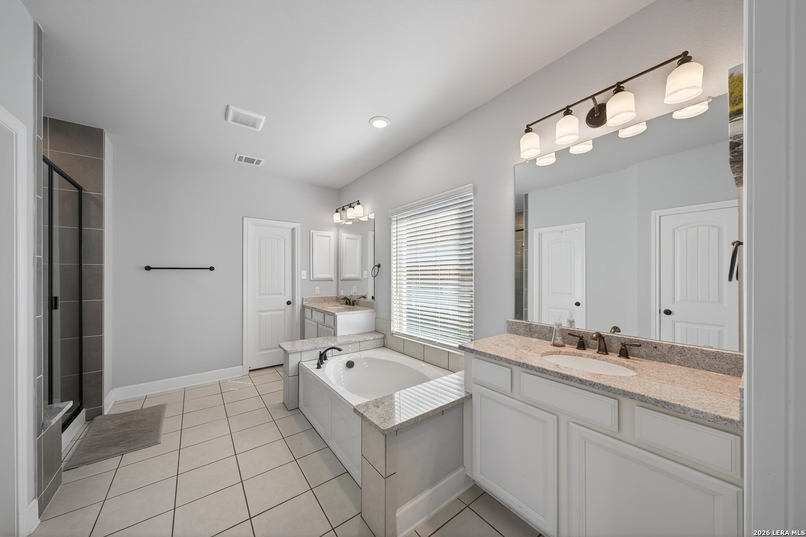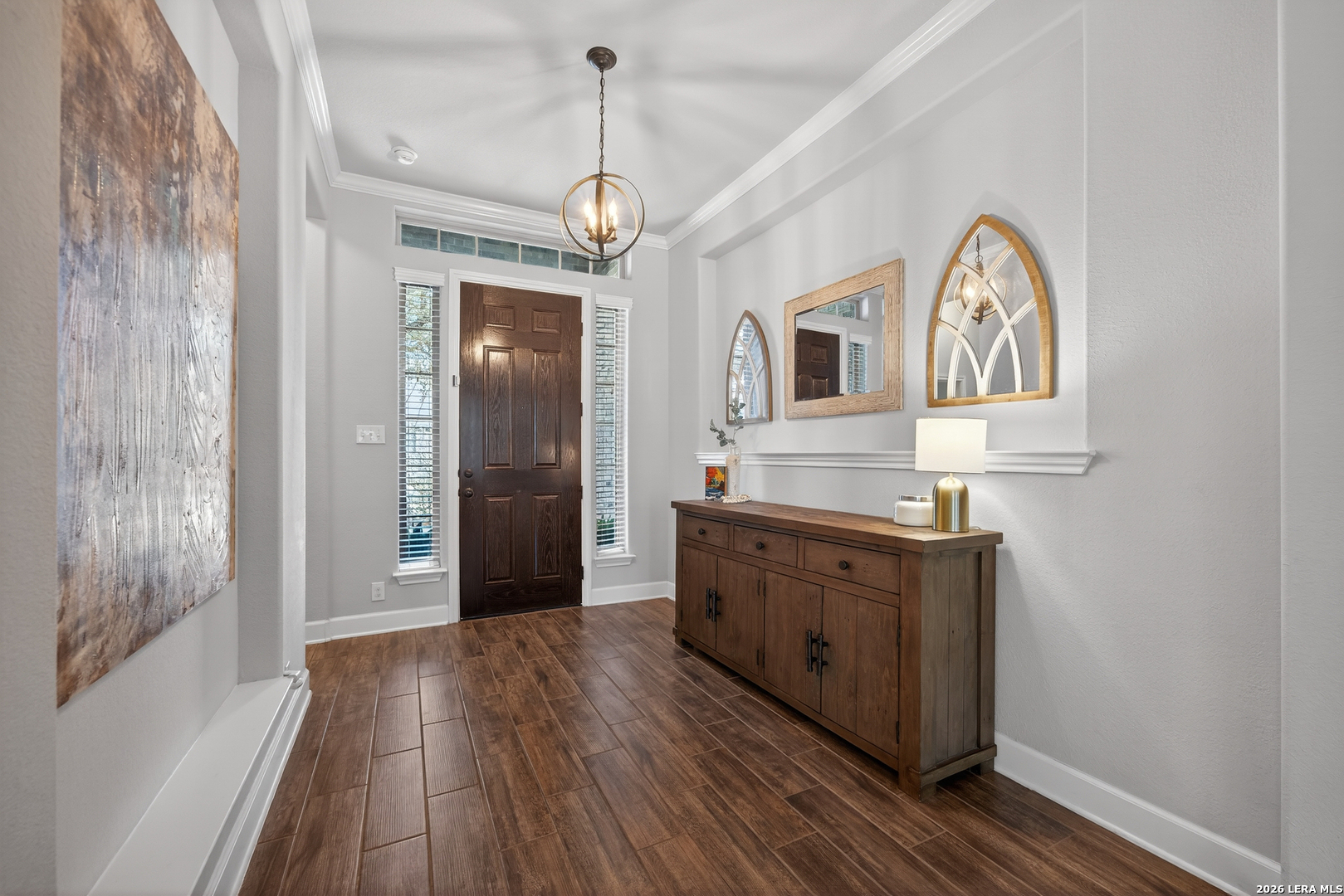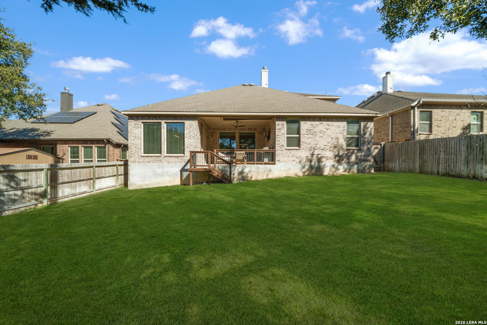 Offering 2,509 square feet of well-designed living space, this two-story brick home features an open floor plan with wood-look tile flooring throughout the main living areas and abundant natural light. The family room showcases a stone fireplace and flows seamlessly into the kitchen and dining area. The kitchen is equipped with a large island, ample cabinetry, walk-in pantry, built-in oven and microwave, built-in gas cooktop, dishwasher, and a white tile backsplash. The primary bedroom includes a full bath with separate vanities, a garden tub, and a walk-in shower. In total, the home offers four bedrooms, with the fourth bedroom located upstairs alongside a spacious loft, creating a private retreat ideal for guests or additional living space. Exterior features include mature trees, a sprinkler system, privacy fencing, and a covered patio for outdoor enjoyment. The property also offers excellent garage flexibility with a front-entry two-car garage and an additional side-entry one-car garage. Located within the gated Front Gate community in Fair Oaks Ranch, this home combines space, function, and privacy in the Texas Hill Country