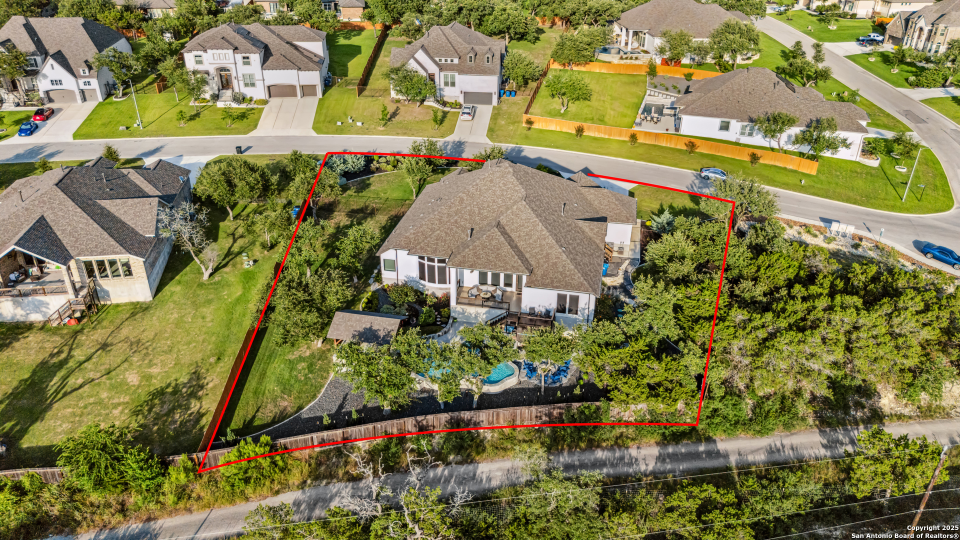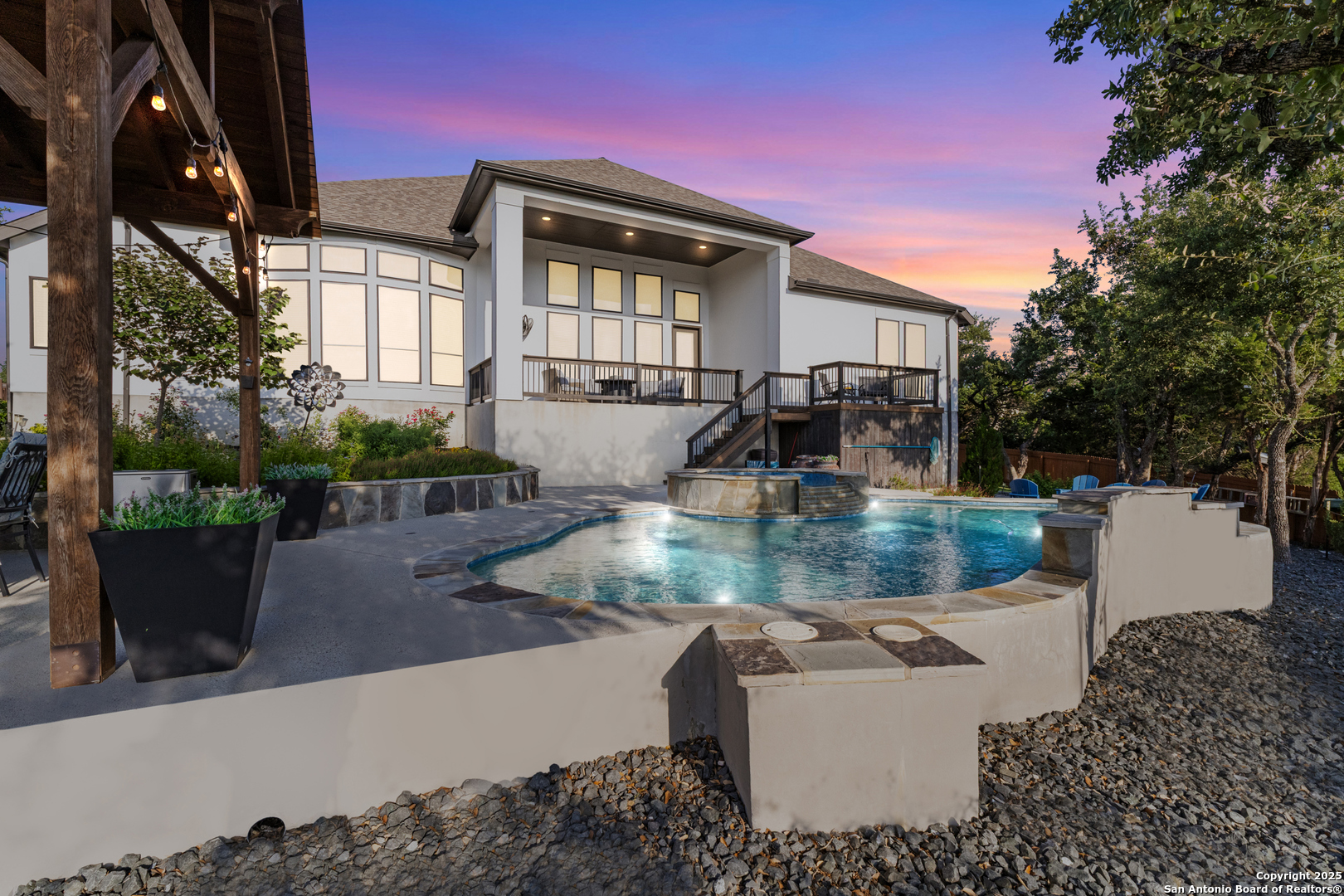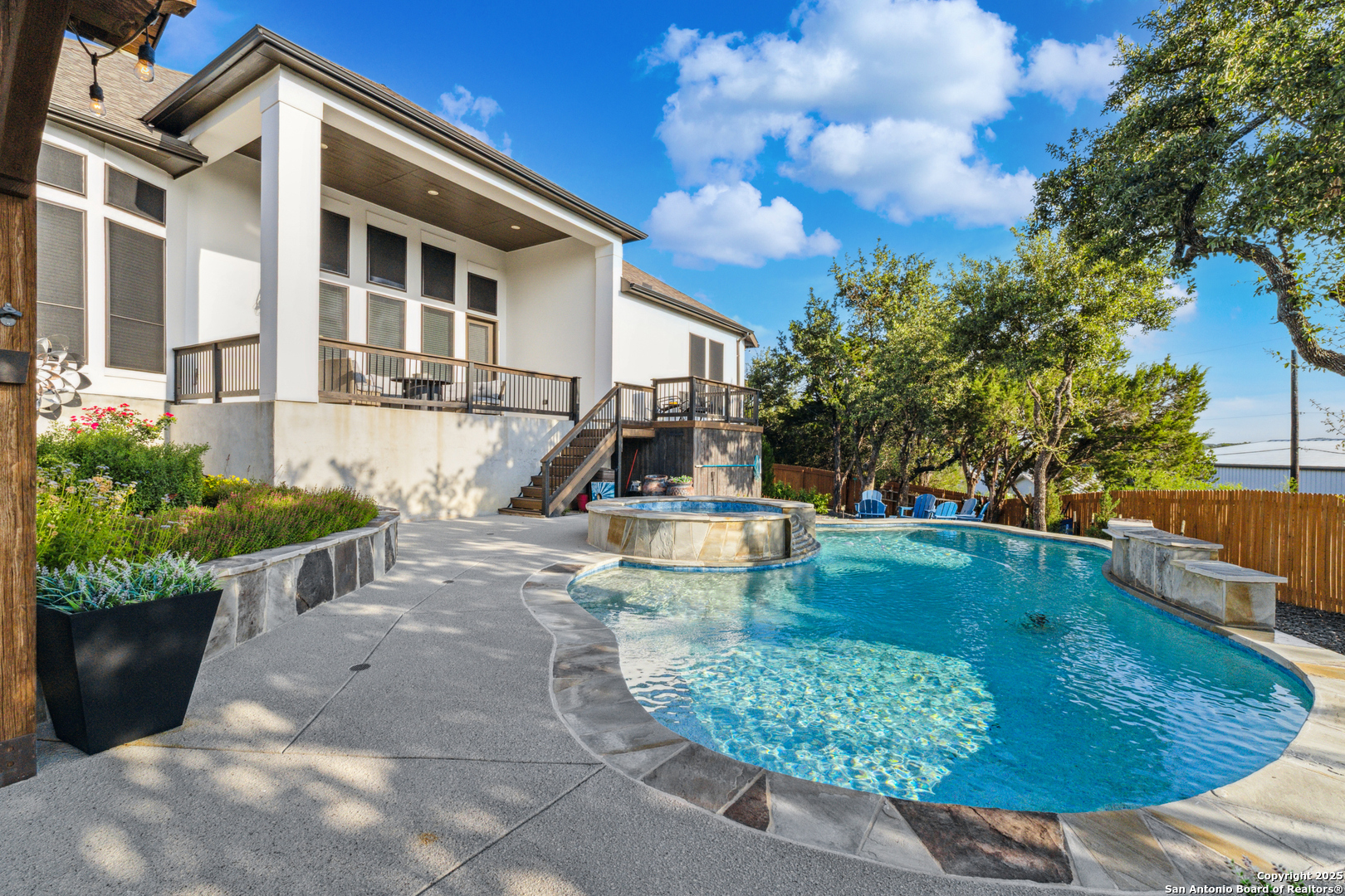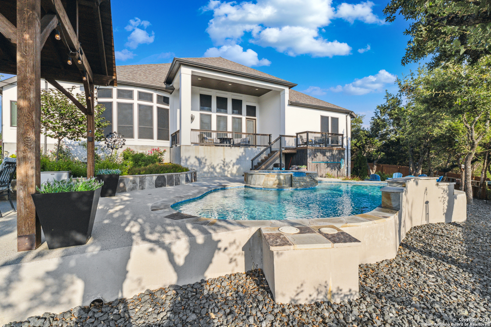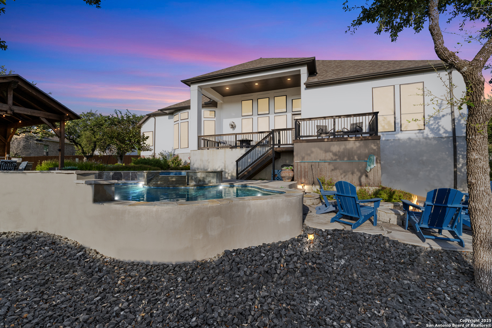 Welcome to the coveted Balcones Creek gated community in Boerne, where elegance, comfort, and exceptional craftsmanship come together in a truly one-of-a-kind home. From the moment you arrive, you'll be impressed by the meticulous attention to detail from the grand curb appeal to the thoughtfully designed interior spaces and 5 car garage with epoxy floors and overhead storage. Inside, expansive living areas are highlighted by soaring ceilings, luxury vinyl plank flooring, and a seamless flow that's perfect for everyday living and entertaining. Each oversized bedroom offers walk-in closets. The chef's kitchen includes a large walk-in pantry and cabinet lighting. The media room is a standout with double insulation and solid doors for an immersive theater experience. A hidden safe room adds a unique layer of security and functionality. Step outside to your half-acre personal resort, where more than $300K of professional xeriscaping and hardscaping create the ultimate outdoor retreat with bee and butterfly conservation in mind. Entertain in style with a custom-built pool, relaxing hot tub, fully equipped outdoor kitchen, cozy firepit, and a spacious covered patio providing generous gathering areas for all your guests. The home backs to Boerne Stage Airfield, a private airport serving local pilots and small aircraft with fixed-base operations and occasional community events. A service road separates the property from the airfield, and the home has been thoughtfully insulated for sound, offering peace and quiet while enjoying a truly unique setting. Learn more at boernestageairfield dot com. With timeless style, thoughtful upgrades, and unmatched outdoor living, this home is a true Hill Country masterpiece.