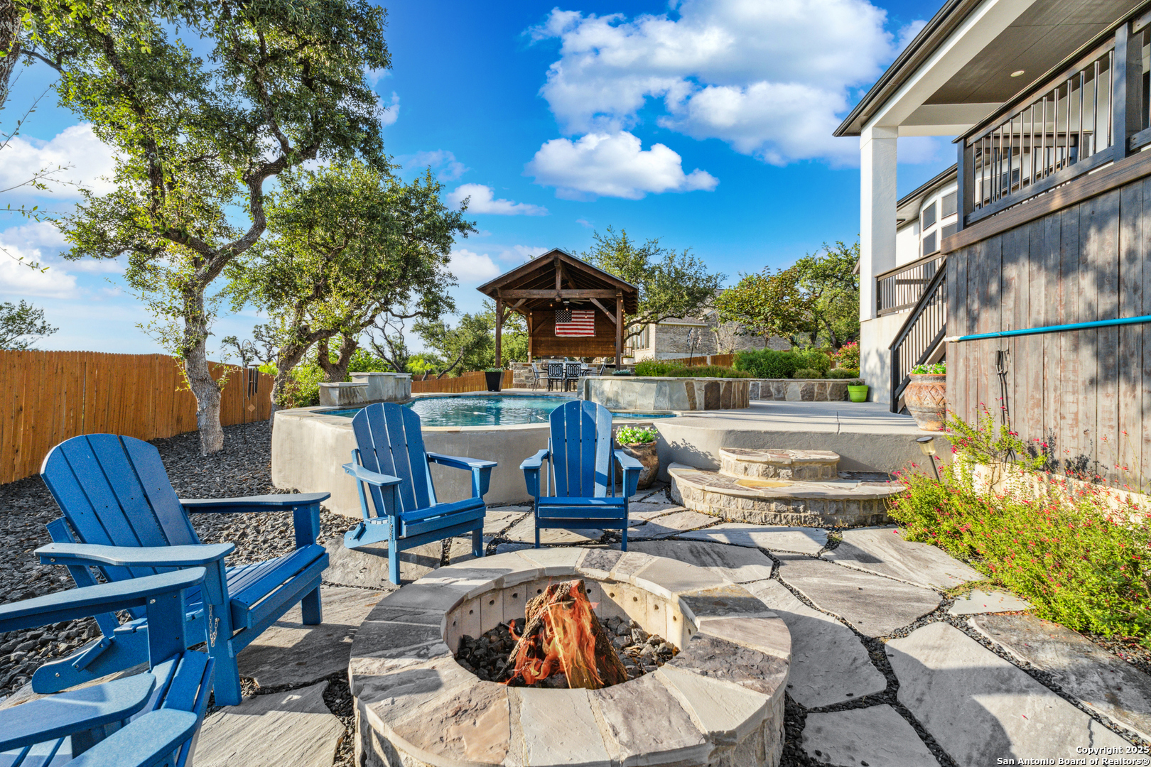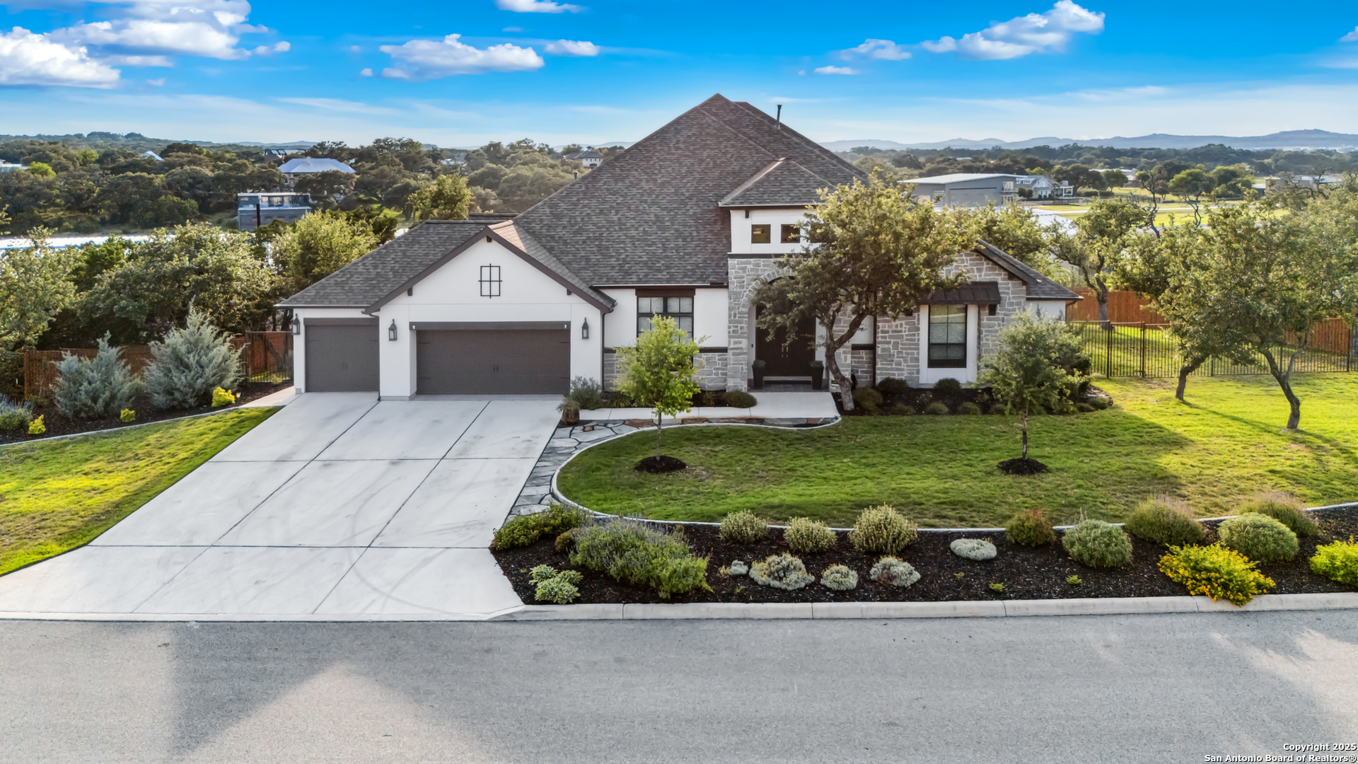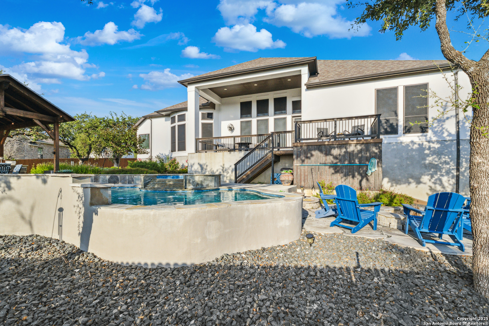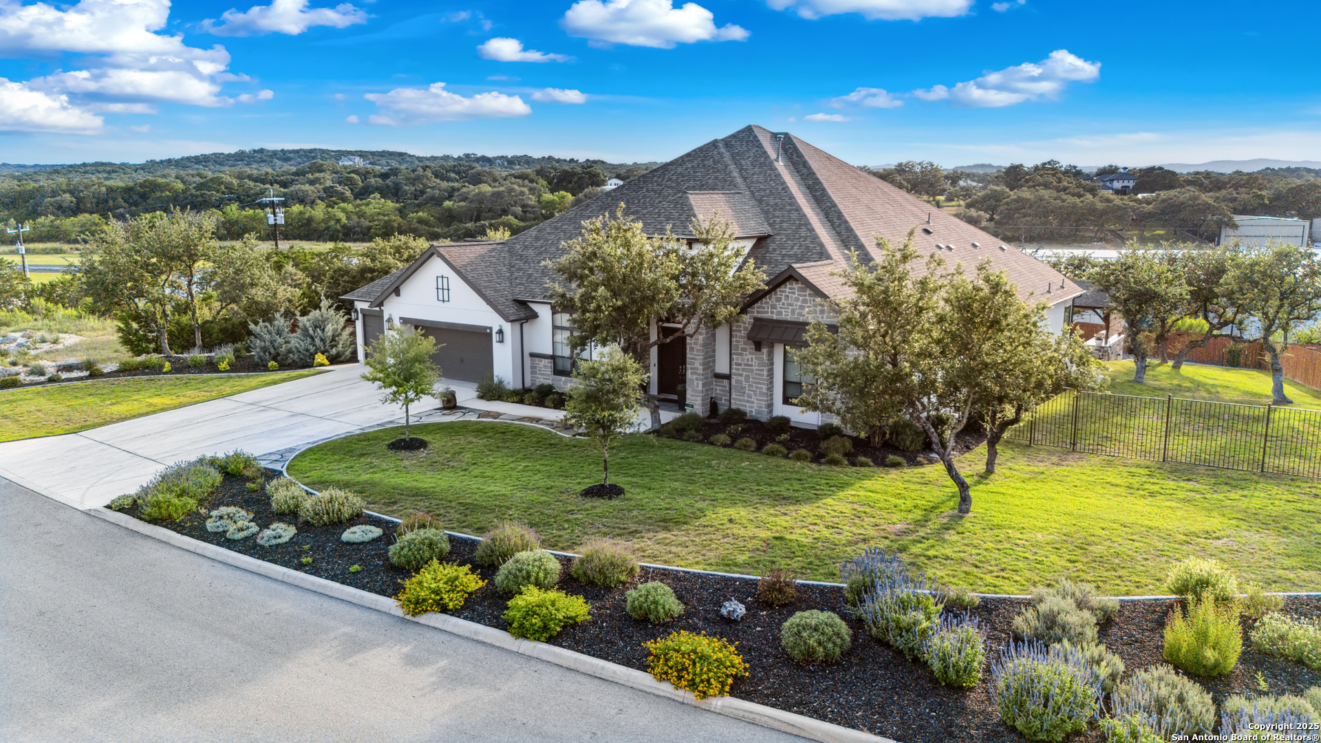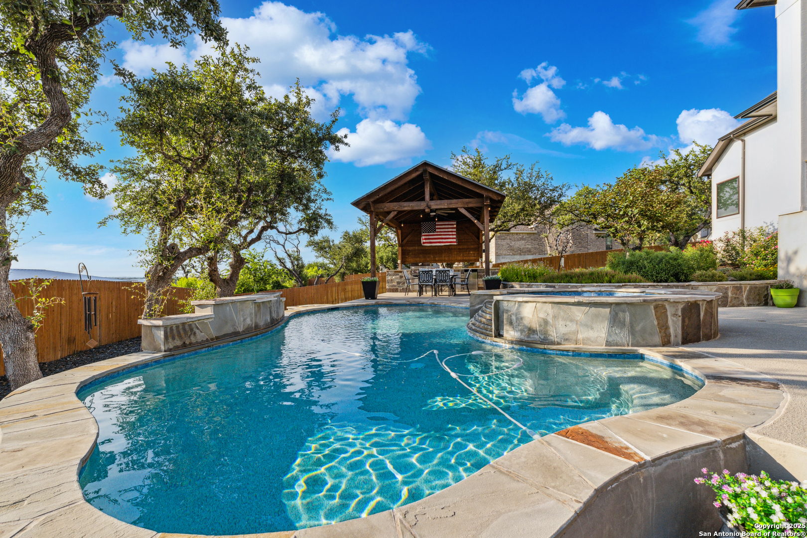 Welcome to the coveted Balcones Creek gated community in Boerne, where elegance, comfort, and exceptional craftsmanship come together in a truly one-of-a-kind home. From the moment you arrive, you'll be impressed by the meticulous attention to detail from the grand curb appeal to the thoughtfully designed interior spaces and 5 car garage with epoxy floors and overhead storage. Inside, expansive living areas are highlighted by soaring ceilings, luxury vinyl plank flooring, and a seamless flow that's perfect for everyday living and entertaining. Each oversized bedroom offers walk-in closets. The chef's kitchen includes a large walk-in pantry and cabinet lighting. The media room is a standout with double insulation and solid doors for an immersive theater experience. A hidden safe room adds a unique layer of security and functionality. Step outside to your half-acre personal resort, where more than $300K of professional xeriscaping and hardscaping create the ultimate outdoor retreat with bee and butterfly conservation in mind. Entertain in style with a custom-built pool, relaxing hot tub, fully equipped outdoor kitchen, cozy firepit, and a spacious covered patio providing generous gathering areas for all your guests. The home backs to Boerne Stage Airfield, a private airport serving local pilots and small aircraft with fixed-base operations and occasional community events. A service road separates the property from the airfield, and the home has been thoughtfully insulated for sound, offering peace and quiet while enjoying a truly unique setting. Learn more at boernestageairfield dot com. With timeless style, thoughtful upgrades, and unmatched outdoor living, this home is a true Hill Country masterpiece.