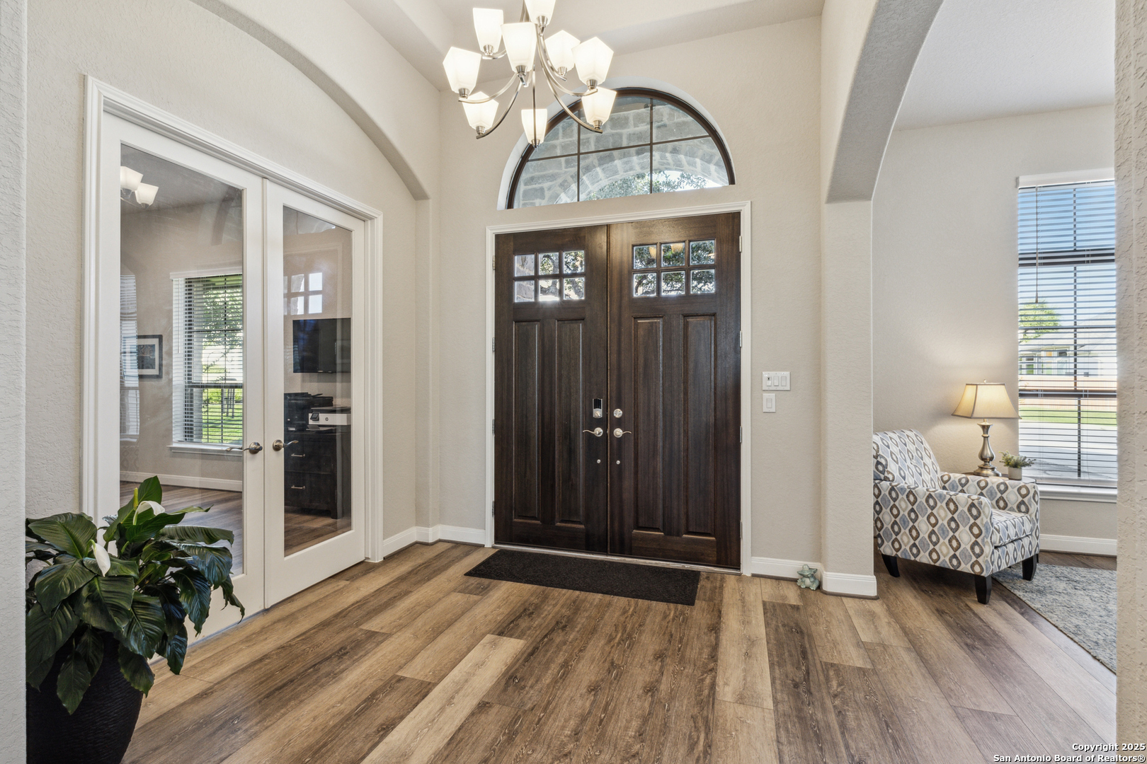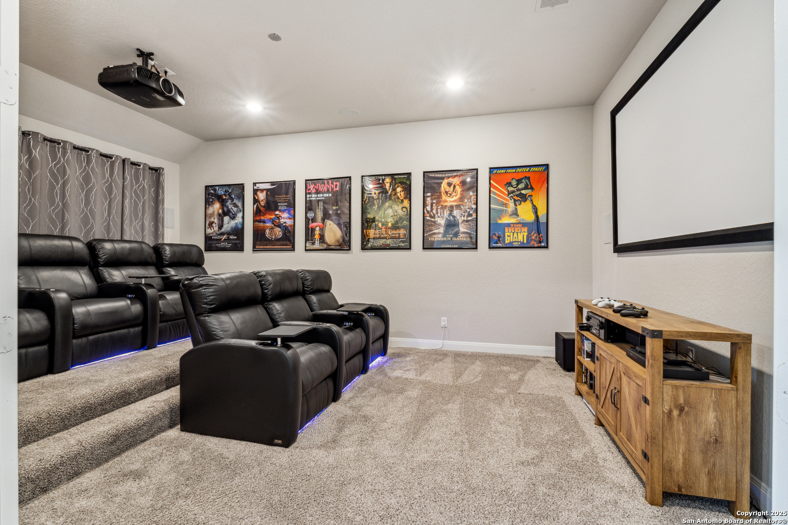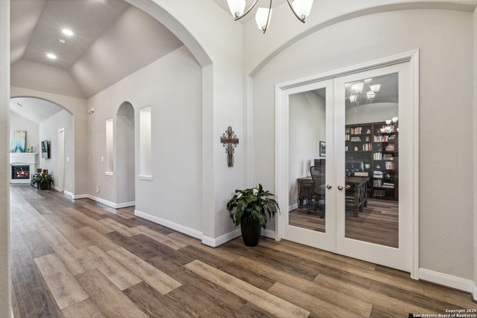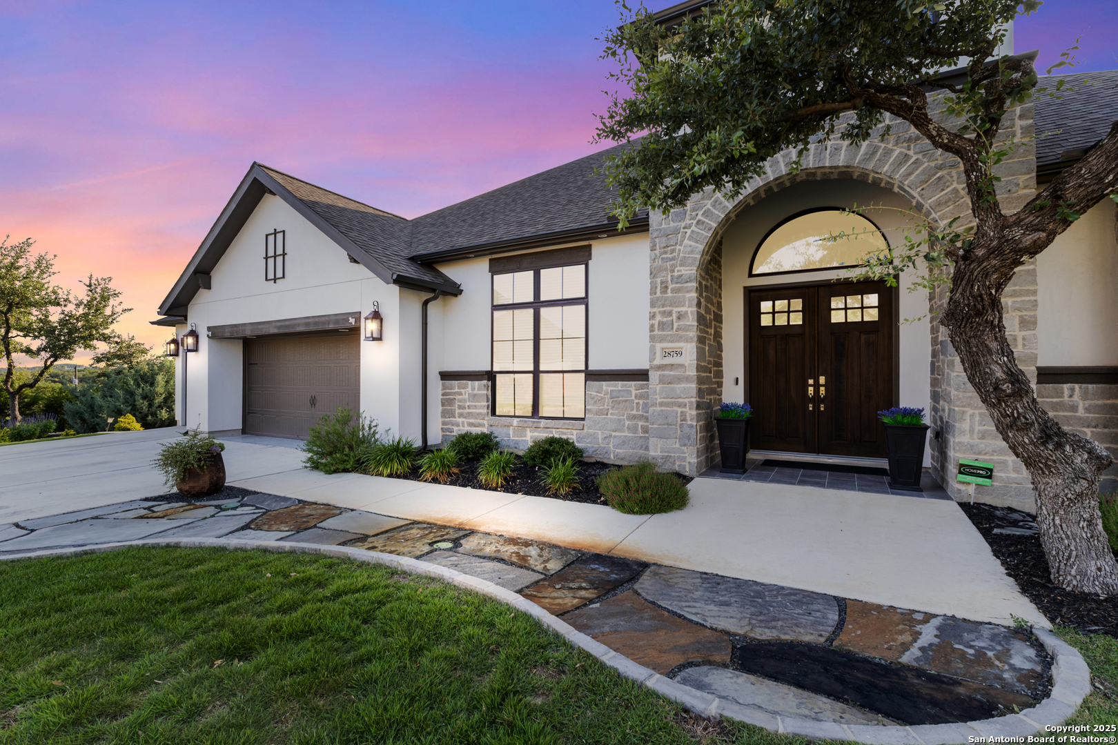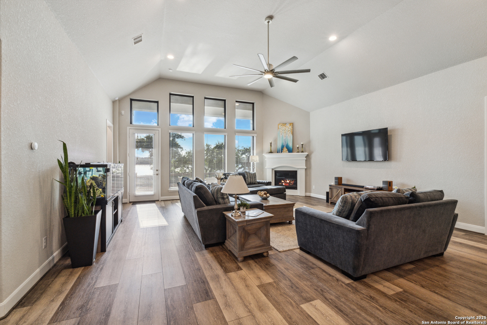 Welcome to the coveted Balcones Creek gated community in Boerne, where elegance, comfort, and exceptional craftsmanship come together in a truly one-of-a-kind home. From the moment you arrive, you'll be impressed by the meticulous attention to detail from the grand curb appeal to the thoughtfully designed interior spaces and 5 car garage with epoxy floors and overhead storage. Inside, expansive living areas are highlighted by soaring ceilings, luxury vinyl plank flooring, and a seamless flow that's perfect for everyday living and entertaining. Each oversized bedroom offers walk-in closets. The chef's kitchen includes a large walk-in pantry and cabinet lighting. The media room is a standout with double insulation and solid doors for an immersive theater experience. A hidden safe room adds a unique layer of security and functionality. Step outside to your half-acre personal resort, where more than $300K of professional xeriscaping and hardscaping create the ultimate outdoor retreat with bee and butterfly conservation in mind. Entertain in style with a custom-built pool, relaxing hot tub, fully equipped outdoor kitchen, cozy firepit, and a spacious covered patio providing generous gathering areas for all your guests. The home backs to Boerne Stage Airfield, a private airport serving local pilots and small aircraft with fixed-base operations and occasional community events. A service road separates the property from the airfield, and the home has been thoughtfully insulated for sound, offering peace and quiet while enjoying a truly unique setting. Learn more at boernestageairfield dot com. With timeless style, thoughtful upgrades, and unmatched outdoor living, this home is a true Hill Country masterpiece.