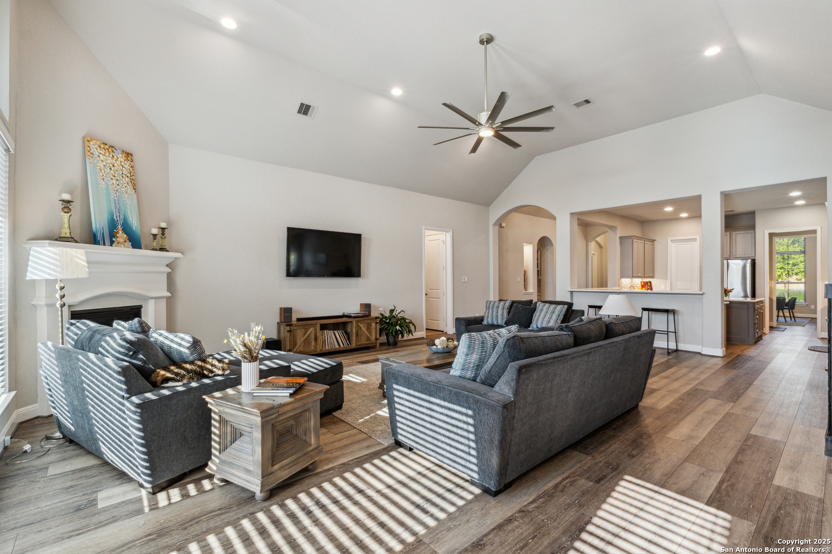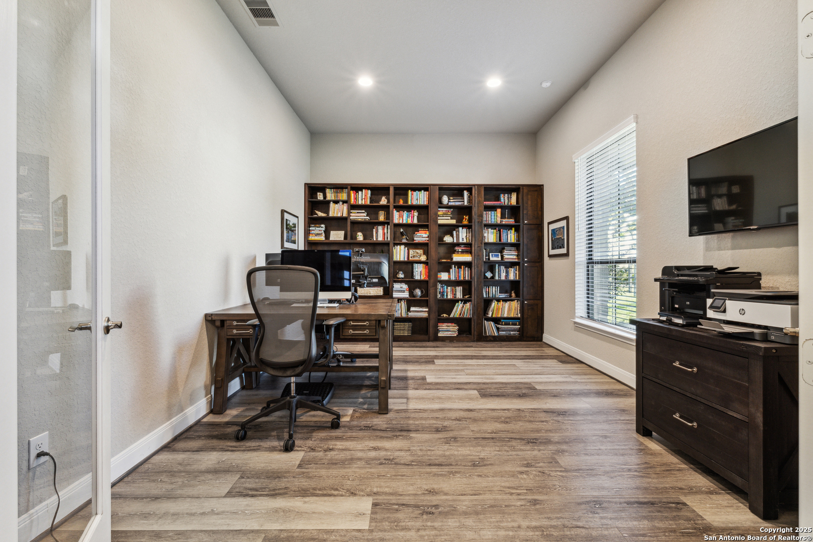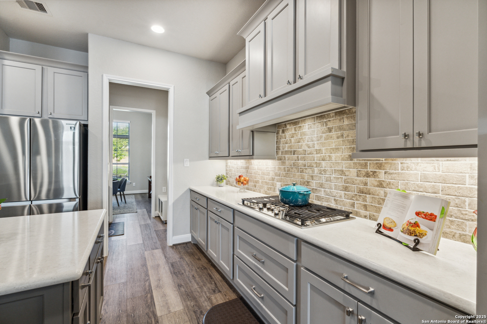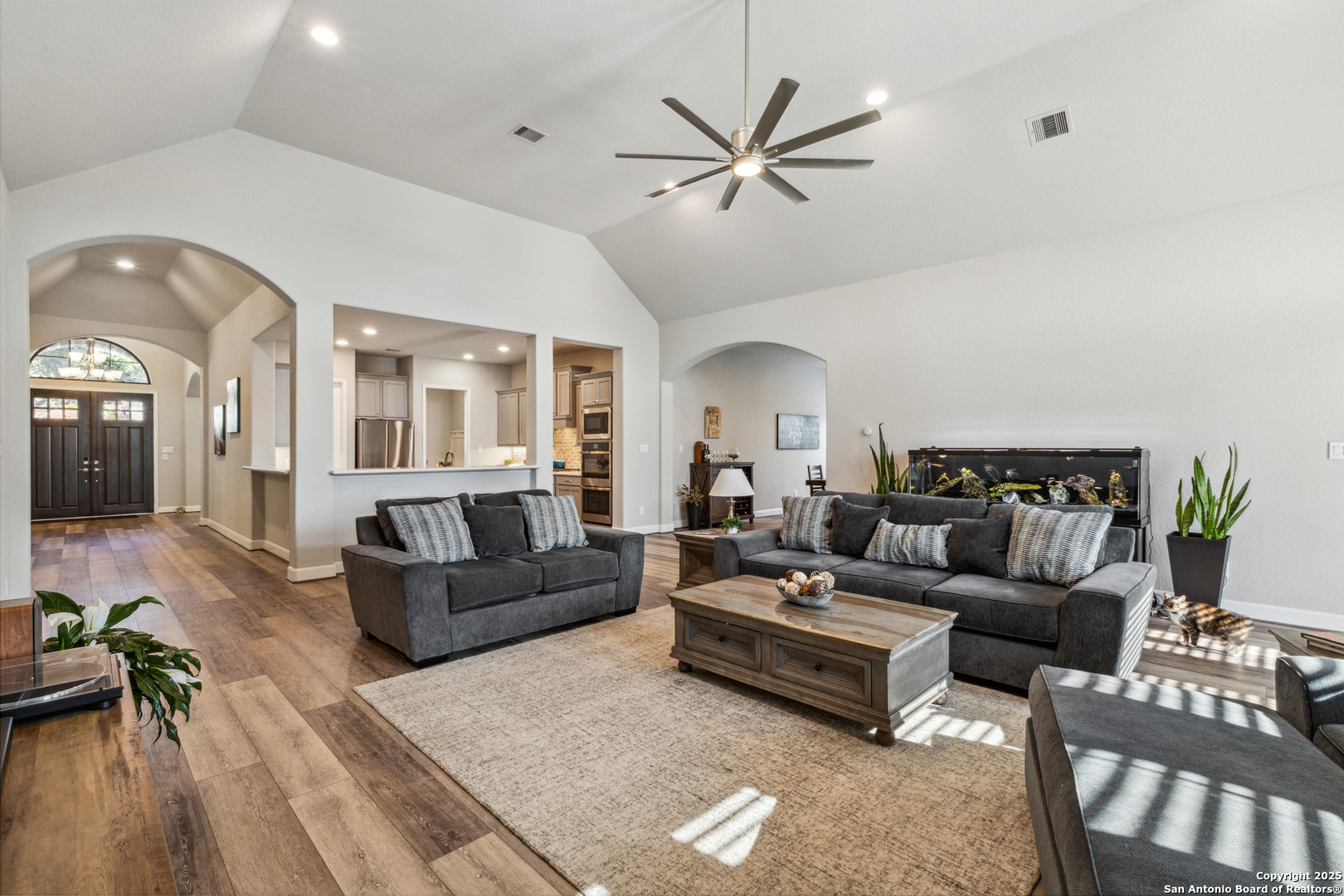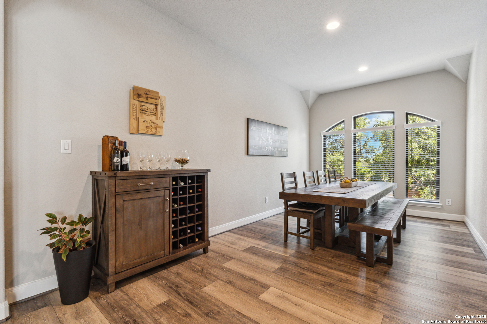 Welcome to the coveted Balcones Creek gated community in Boerne, where elegance, comfort, and exceptional craftsmanship come together in a truly one-of-a-kind home. From the moment you arrive, you'll be impressed by the meticulous attention to detail from the grand curb appeal to the thoughtfully designed interior spaces and 5 car garage with epoxy floors and overhead storage. Inside, expansive living areas are highlighted by soaring ceilings, luxury vinyl plank flooring, and a seamless flow that's perfect for everyday living and entertaining. Each oversized bedroom offers walk-in closets. The chef's kitchen includes a large walk-in pantry and cabinet lighting. The media room is a standout with double insulation and solid doors for an immersive theater experience. A hidden safe room adds a unique layer of security and functionality. Step outside to your half-acre personal resort, where more than $300K of professional xeriscaping and hardscaping create the ultimate outdoor retreat with bee and butterfly conservation in mind. Entertain in style with a custom-built pool, relaxing hot tub, fully equipped outdoor kitchen, cozy firepit, and a spacious covered patio providing generous gathering areas for all your guests. The home backs to Boerne Stage Airfield, a private airport serving local pilots and small aircraft with fixed-base operations and occasional community events. A service road separates the property from the airfield, and the home has been thoughtfully insulated for sound, offering peace and quiet while enjoying a truly unique setting. Learn more at boernestageairfield dot com. With timeless style, thoughtful upgrades, and unmatched outdoor living, this home is a true Hill Country masterpiece.