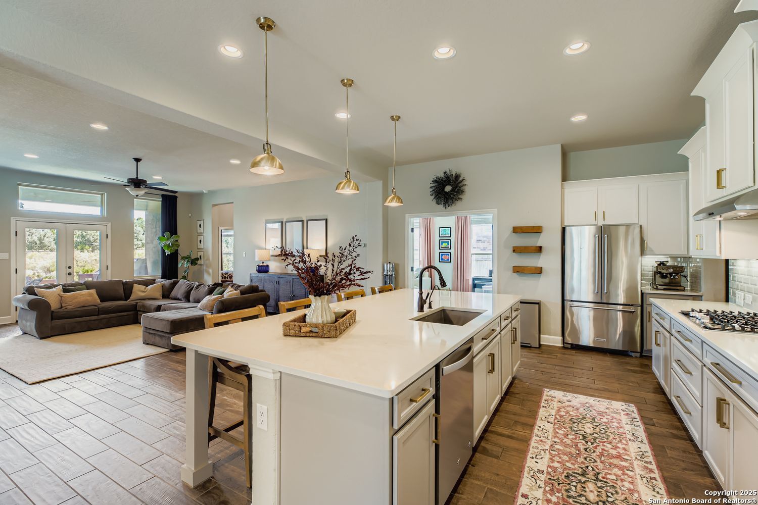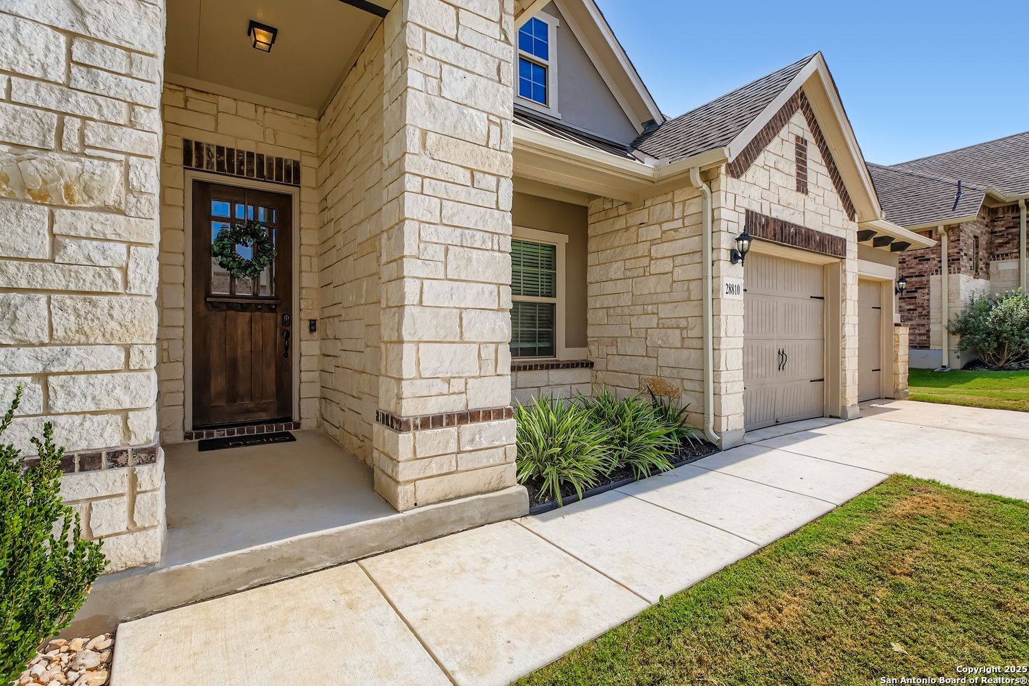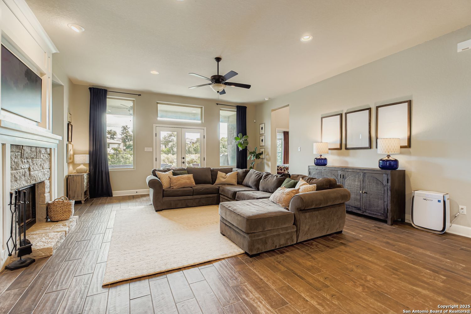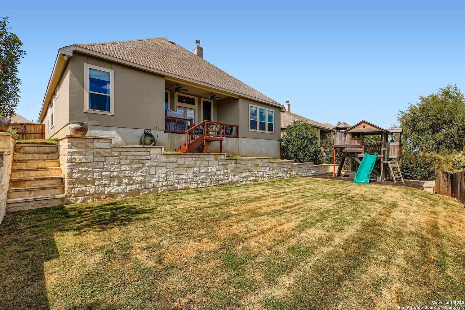 Welcome to your dream home in the highly sought-after Sunday Creek at Kinder Ranch! This meticulously maintained 4-bedroom, 3.5-bathroom one-story beauty offers luxury, functionality, and space for everyone. Step inside to find wood-look tile floors flowing through the main living areas, adding warmth and durability. The chef's kitchen is a showstopper with an oversized island, gas cooking, and designer touches throughout - perfect for hosting and everyday living. Enjoy the elegance of custom wainscoting in both the dining and living rooms, and take advantage of the multiple bonus spaces, including a private office, flex room off the kitchen/living area, and a fully equipped media room complete with movie chairs! The spacious primary suite is thoughtfully separated from the secondary bedrooms and features a large ensuite bath, offering the perfect retreat. Outside, entertain with ease under the covered patio, surrounded by professionally designed landscaping and a fun playscape that makes the backyard enjoyable for all ages. Located minutes from top-rated schools, quaint Bulverde shops, and local dining, this home offers the perfect blend of comfort and convenience.