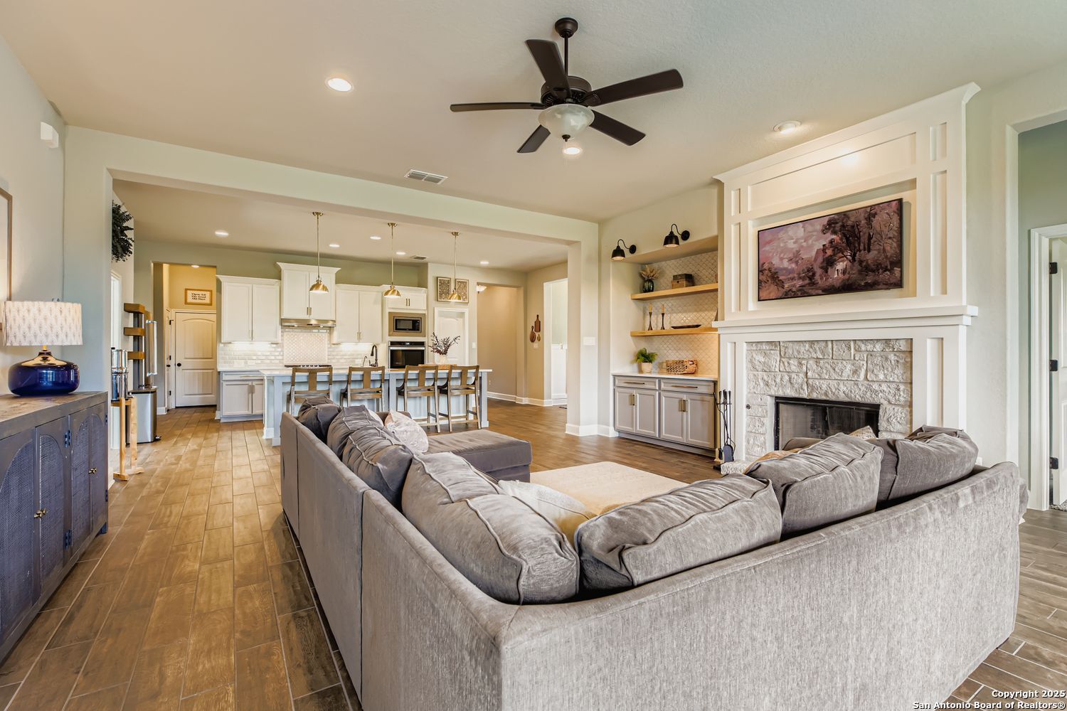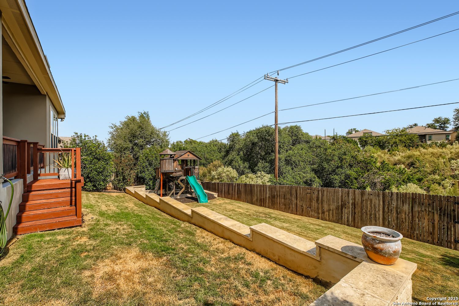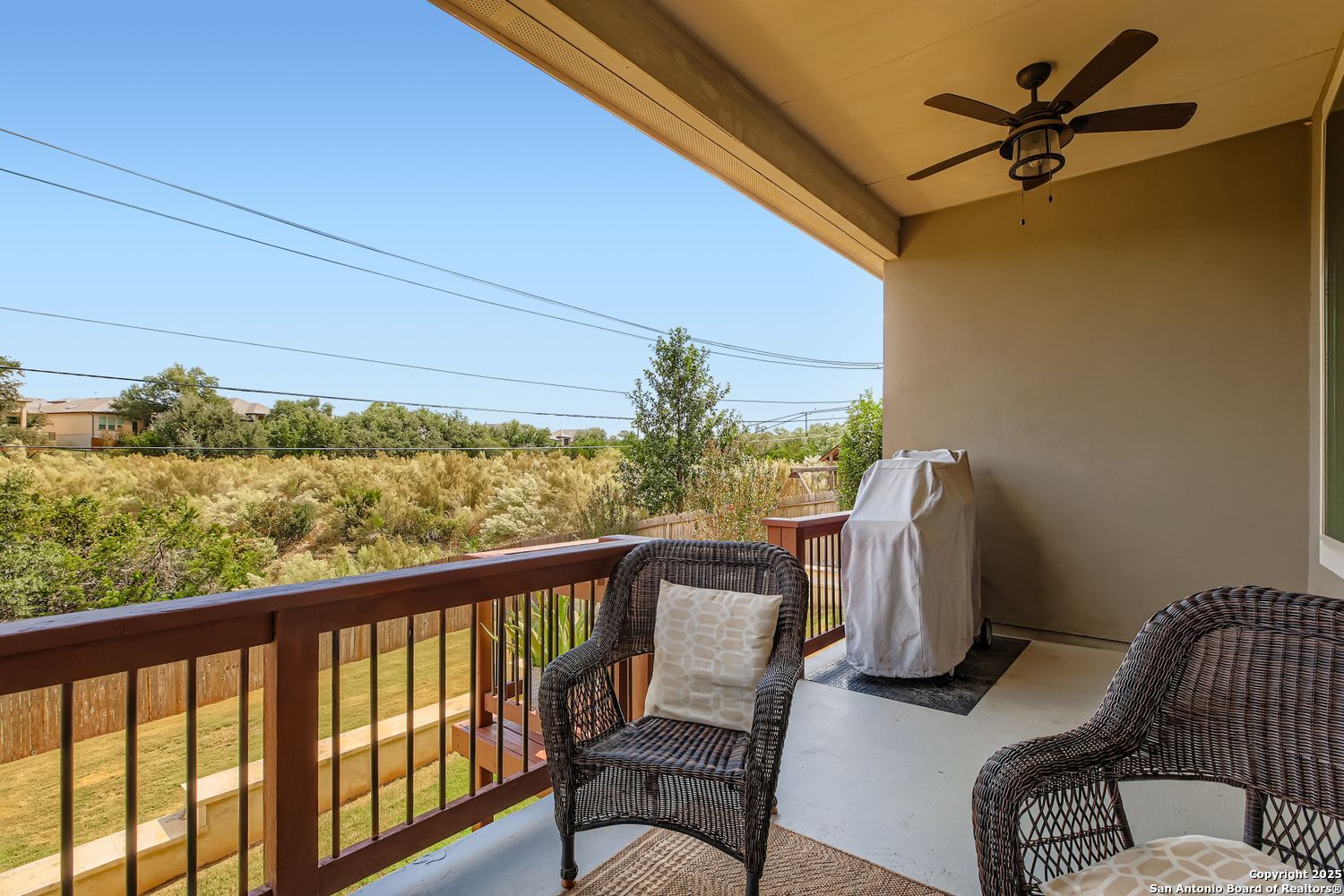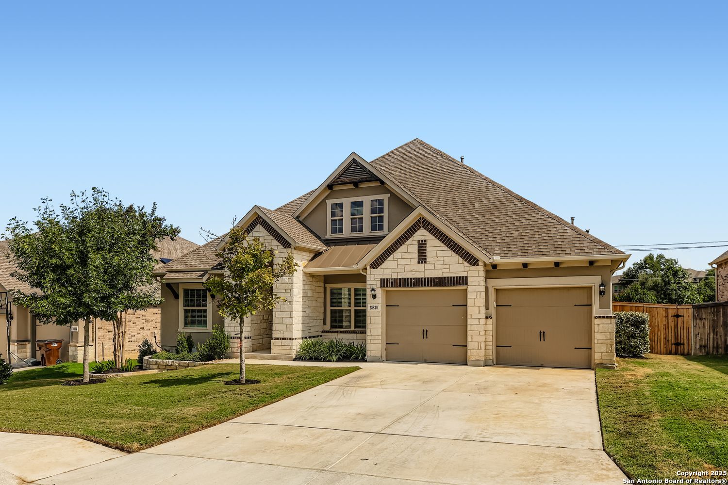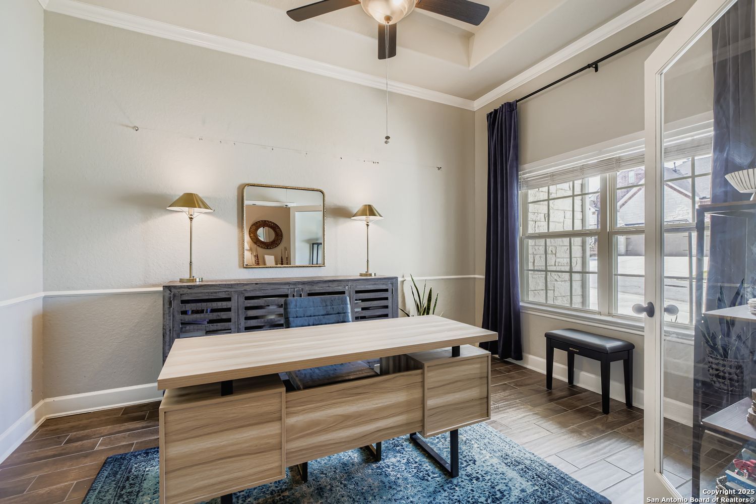 Welcome to your dream home in the highly sought-after Sunday Creek at Kinder Ranch! This meticulously maintained 4-bedroom, 3.5-bathroom one-story beauty offers luxury, functionality, and space for everyone. Step inside to find wood-look tile floors flowing through the main living areas, adding warmth and durability. The chef's kitchen is a showstopper with an oversized island, gas cooking, and designer touches throughout - perfect for hosting and everyday living. Enjoy the elegance of custom wainscoting in both the dining and living rooms, and take advantage of the multiple bonus spaces, including a private office, flex room off the kitchen/living area, and a fully equipped media room complete with movie chairs! The spacious primary suite is thoughtfully separated from the secondary bedrooms and features a large ensuite bath, offering the perfect retreat. Outside, entertain with ease under the covered patio, surrounded by professionally designed landscaping and a fun playscape that makes the backyard enjoyable for all ages. Located minutes from top-rated schools, quaint Bulverde shops, and local dining, this home offers the perfect blend of comfort and convenience.
