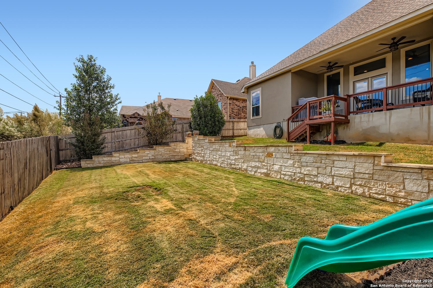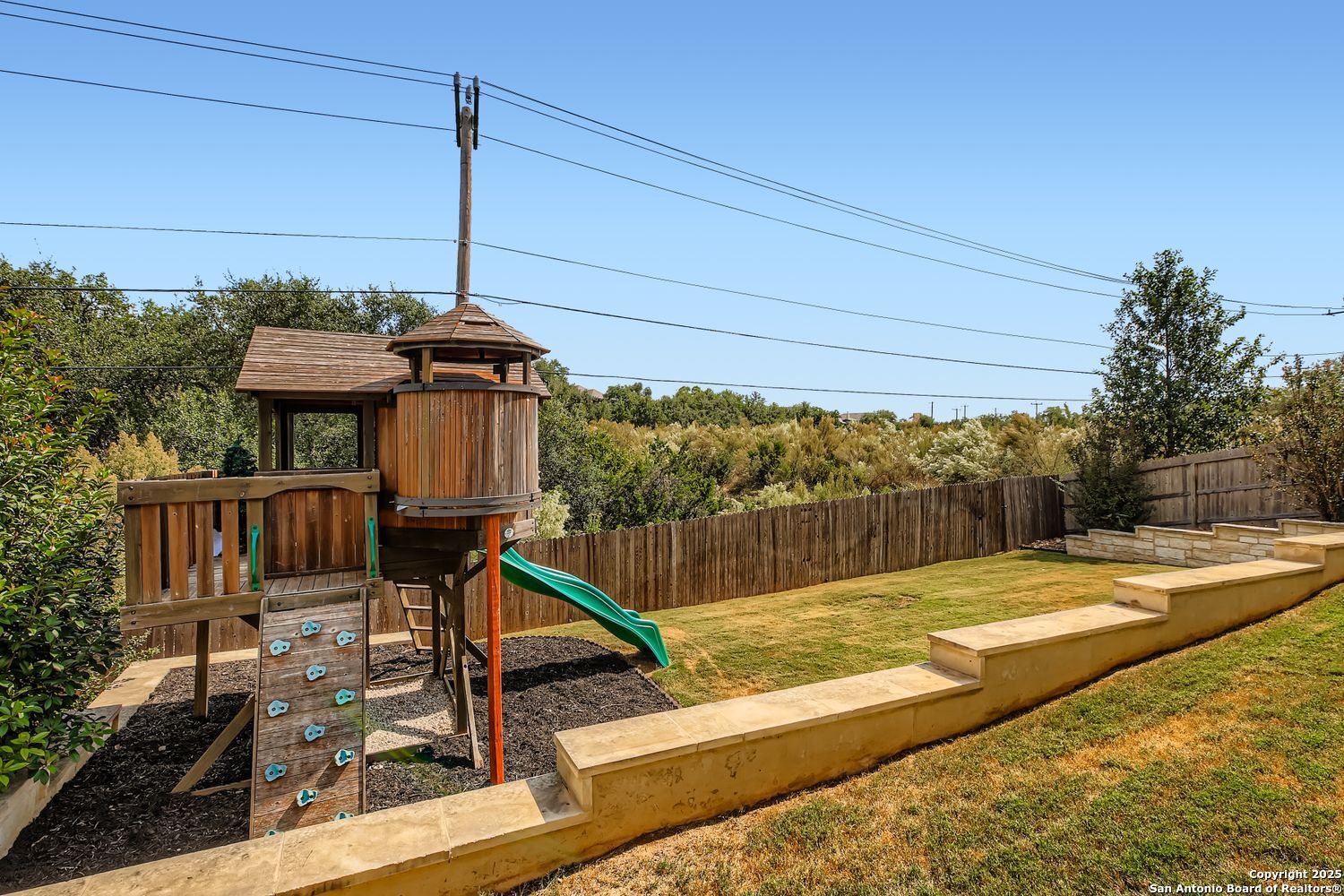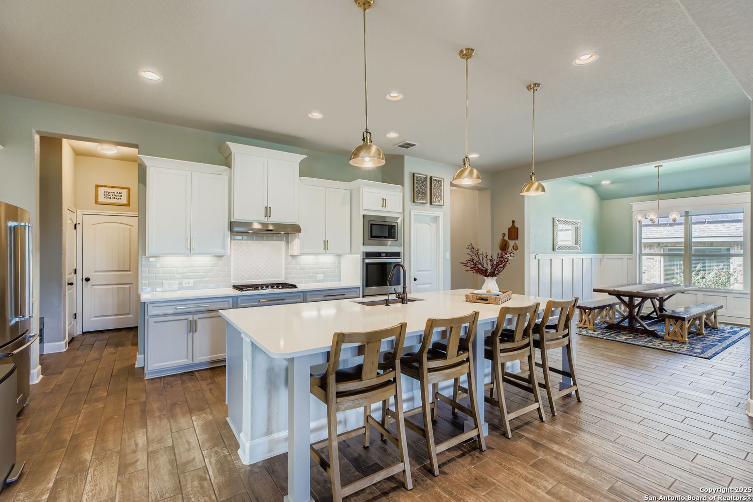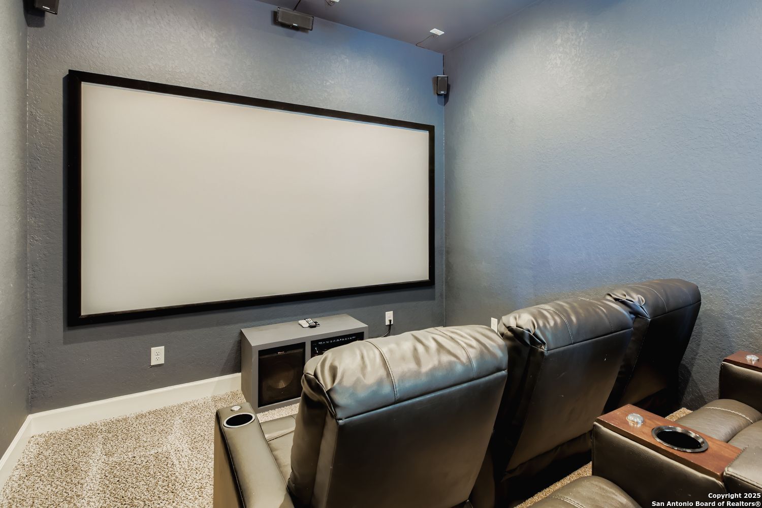 Welcome to your dream home in the highly sought-after Sunday Creek at Kinder Ranch! This meticulously maintained 4-bedroom, 3.5-bathroom one-story beauty offers luxury, functionality, and space for everyone. Step inside to find wood-look tile floors flowing through the main living areas, adding warmth and durability. The chef's kitchen is a showstopper with an oversized island, gas cooking, and designer touches throughout - perfect for hosting and everyday living. Enjoy the elegance of custom wainscoting in both the dining and living rooms, and take advantage of the multiple bonus spaces, including a private office, flex room off the kitchen/living area, and a fully equipped media room complete with movie chairs! The spacious primary suite is thoughtfully separated from the secondary bedrooms and features a large ensuite bath, offering the perfect retreat. Outside, entertain with ease under the covered patio, surrounded by professionally designed landscaping and a fun playscape that makes the backyard enjoyable for all ages. Located minutes from top-rated schools, quaint Bulverde shops, and local dining, this home offers the perfect blend of comfort and convenience.