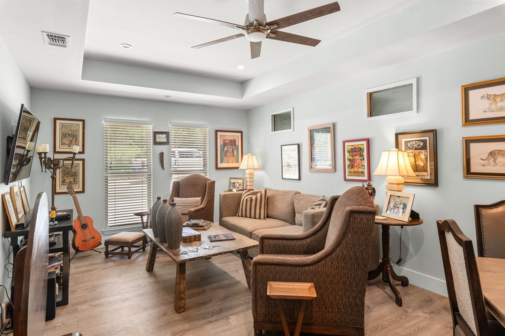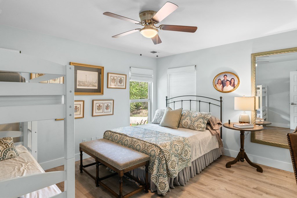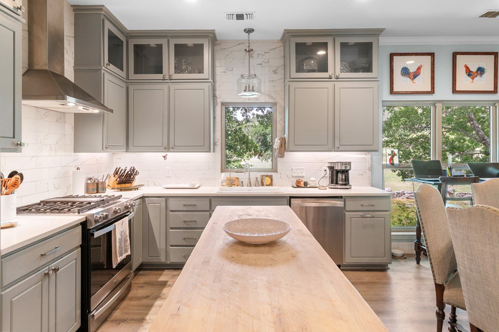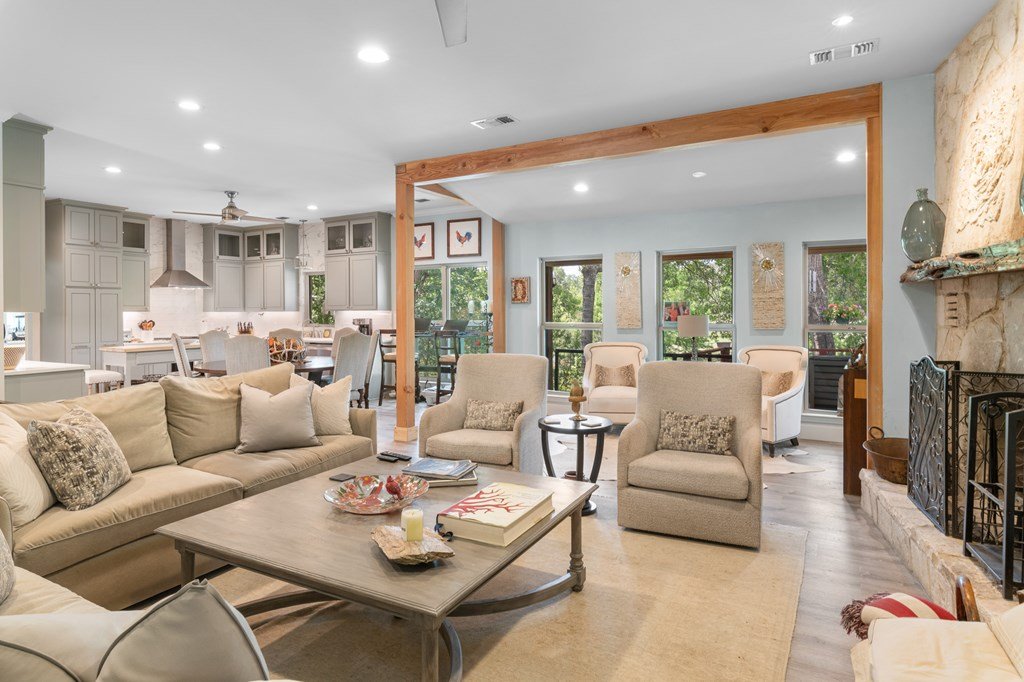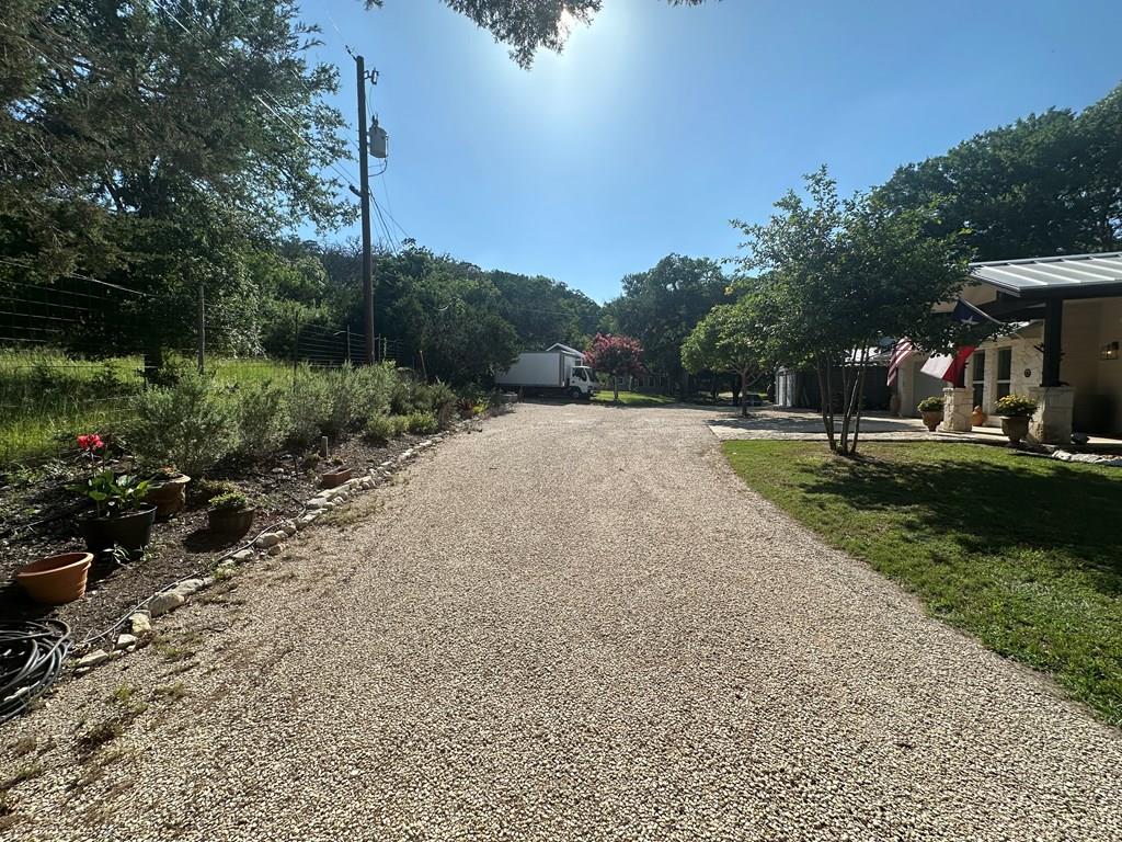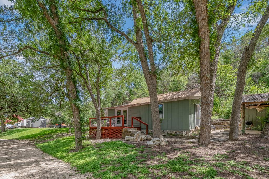 WELCOME TO YOUR HILL COUNTRY PARADISE! This Stunning home is perfectly perched above its own private spring-fed pond offering tranquility, natural beauty, & an unmatched Texas lifestyle. On 4.93 park-like acres, this 1 story 3/2.5 home combines timeless Hill Country charm with thoughtful modern updates. Step into the heart of the home-a chef's kitchen featuring a gas range, abundant cabinetry, natural light & a spacious eat-in dining area. The open floor plan flows seamlessly into the living area anchored by a WB fireplace for cozy evenings. A flex room provides versatile space for a home office, hobby room, or guest area. The primary suite is a private retreat, offering an updated bath with dual vanities, walk-in shower, soaking tub, w/in closet, direct access to the deep covered back porch & sparkling heated swimming pool, perfect for indoor-outdoor living & entertaining. Outdoors, enjoy ample living space mature trees & the serenity of abundant wildlife & nature. Fish, kayak, or canoe in your own pond. 2/1 guest house with income producing potential (current rental income: $21,600 annual) Other features include large utility, storage building, green house, large garage & carport. RV Hook ups, Water storage tank, Gated entry, chipped sealed driveway, larger neighbors, extremely private. See list of recent updates and features.