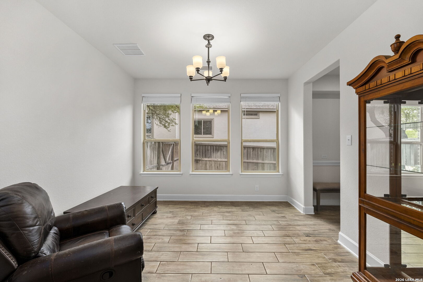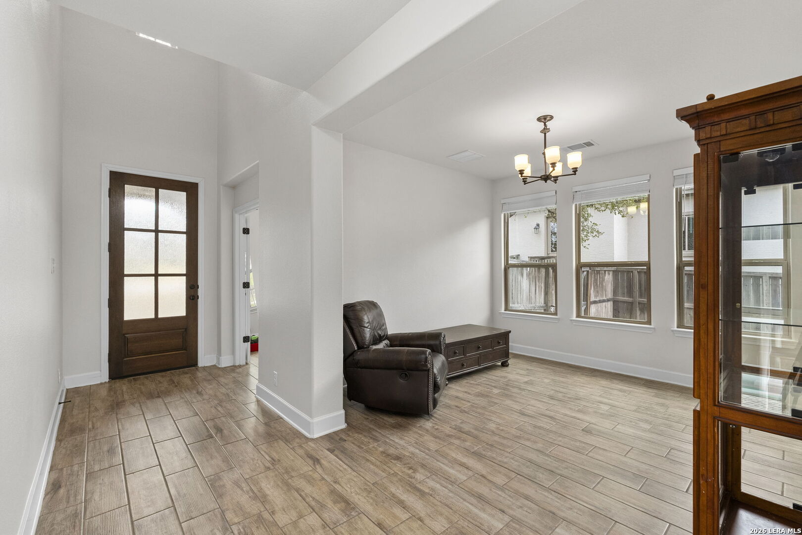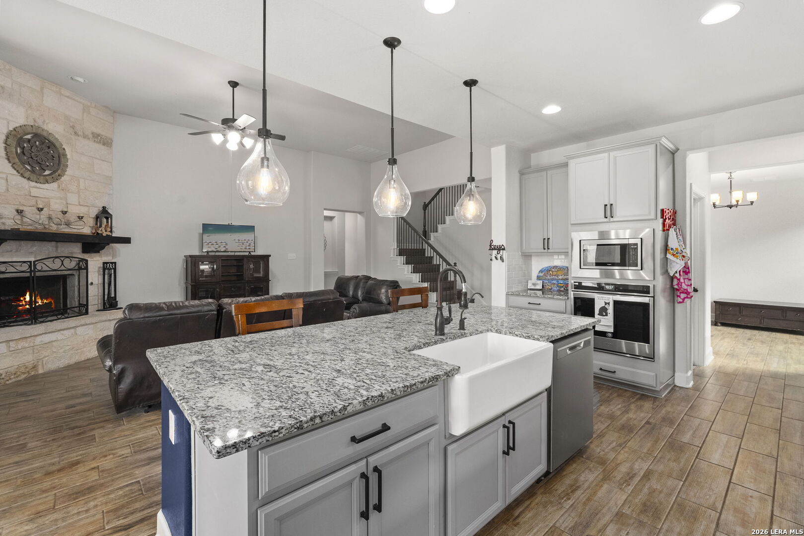 This impressive 4 bedroom, 3.5 bathroom home welcomes you through a foyer with access to a private office or flex room and a comfortable sitting area before opening into a stunning living room anchored by a dramatic floor to ceiling stone fireplace. The open layout flows seamlessly into the kitchen and dining areas, where the eat in kitchen features a large island, abundant counter space, ample storage, and a walk in pantry. The dining room is bathed in natural light from windows on multiple sides, creating a bright and inviting atmosphere. The primary bedroom is spacious and well appointed, with an ensuite bathroom offering a double vanity, a standing shower with built in bench, a large soaking tub, and a generous walk in closet with shelving. Upstairs, additional bedrooms feature large walk in closets and flexible layouts suitable for family, guests, or office use. Outdoor living is enhanced by a deck and covered seating area, providing the perfect setting for relaxing or entertaining.