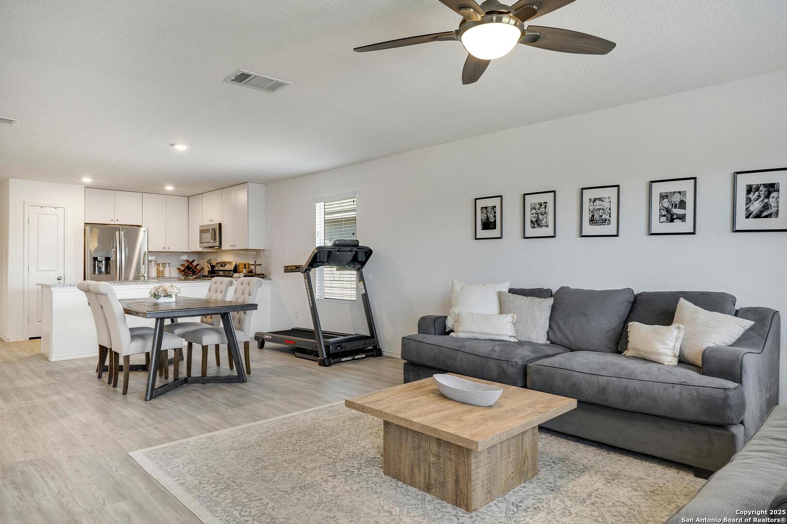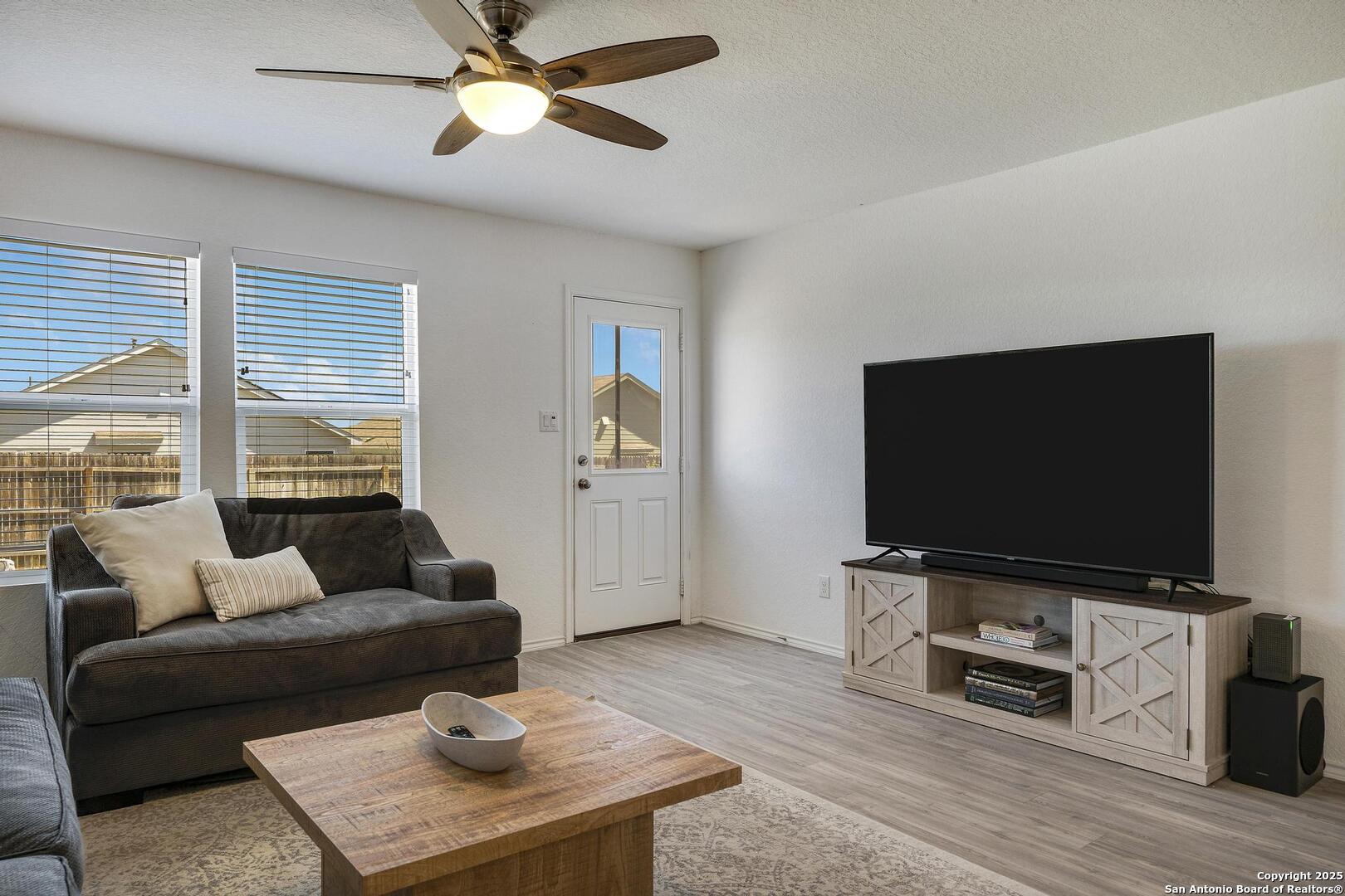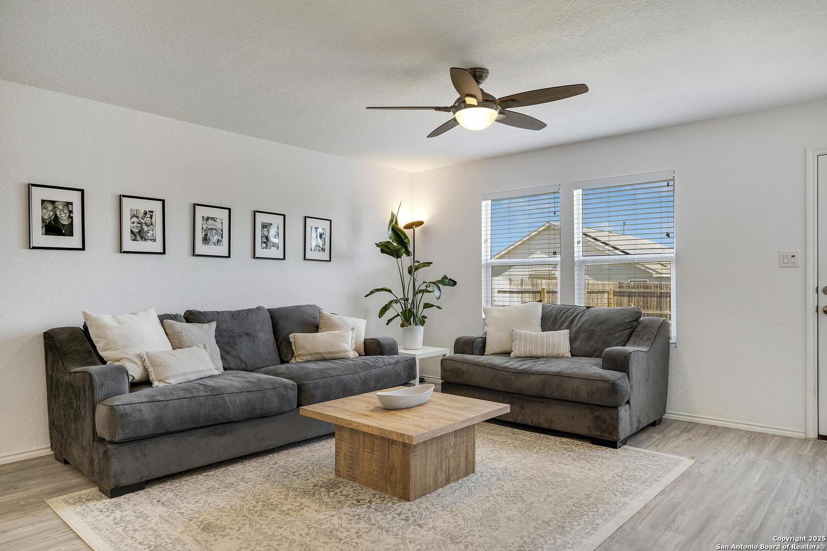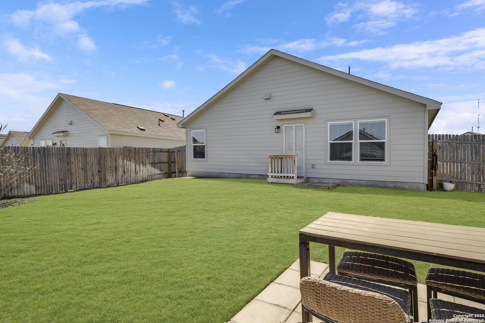 Welcome to your dream home in the heart of New Braunfels! Located in the sought-after Voss Farms community, this beautifully designed, Energy Star Certified 3-bedroom, 2-bathroom home blends modern comfort with thoughtful upgrades throughout. Built in 2022 by Lennar, it features a bright, open-concept layout with stylish finishes, including an island kitchen with gas cooking, a breakfast bar, solid countertops, custom backsplash, and elegant cabinetry. The split floor plan offers added privacy, with the primary suite boasting a spacious walk-in closet. Designed for energy efficiency, this home includes solar panels, natural gas heating, a tankless water heater, and smart features like a thermostat compatible with Alexa, a Ring doorbell, and a smart garage opener. Additional upgrades include ceiling fans in the living room and primary bedroom, blinds on every window, full-yard irrigation with a sprinkler system, a landscaped backyard, and a garage equipped with full lighting and a ceiling storage rack. Step outside to enjoy your private fenced backyard or explore the community amenities, including a pool, scenic walking trails, and the upcoming Zipp Family Sports Park. With easy access to IH-35, you're just minutes from downtown New Braunfels, the Guadalupe River, the Gruene Historic District, and the area's best dining and shopping. This home is the perfect blend of style, functionality, and location-ready to welcome you home.