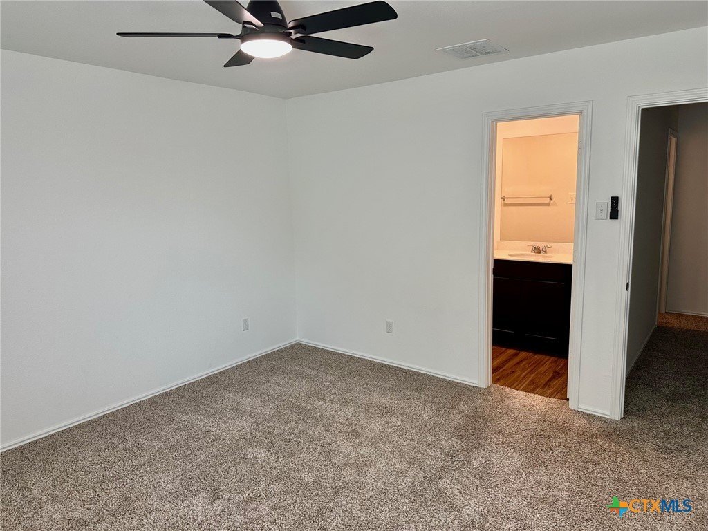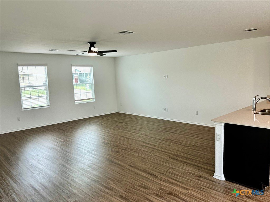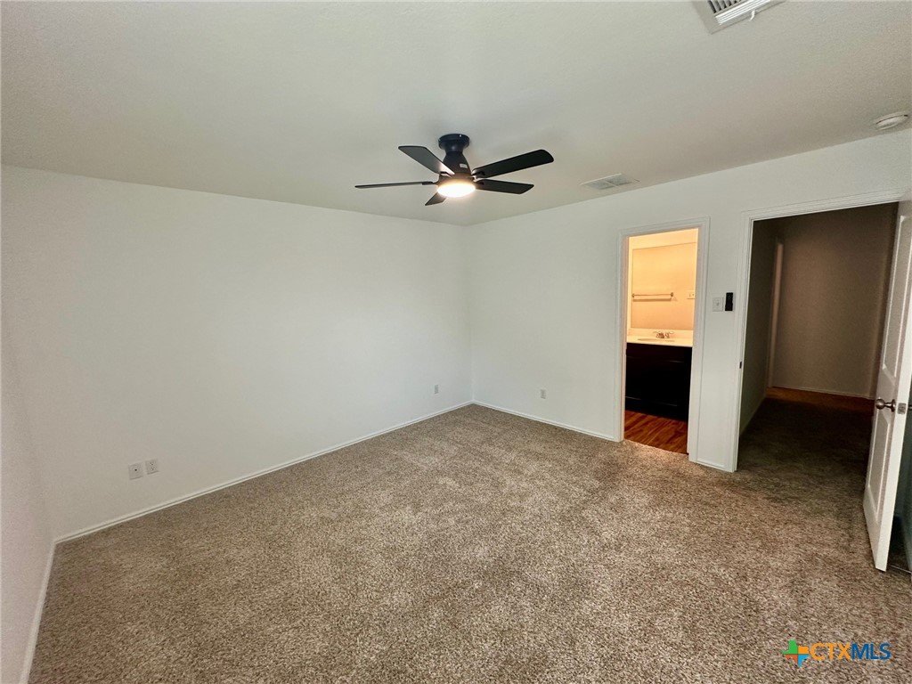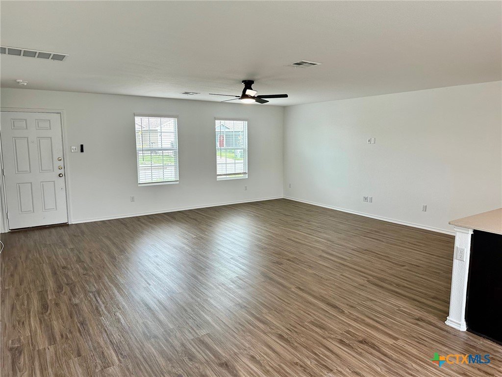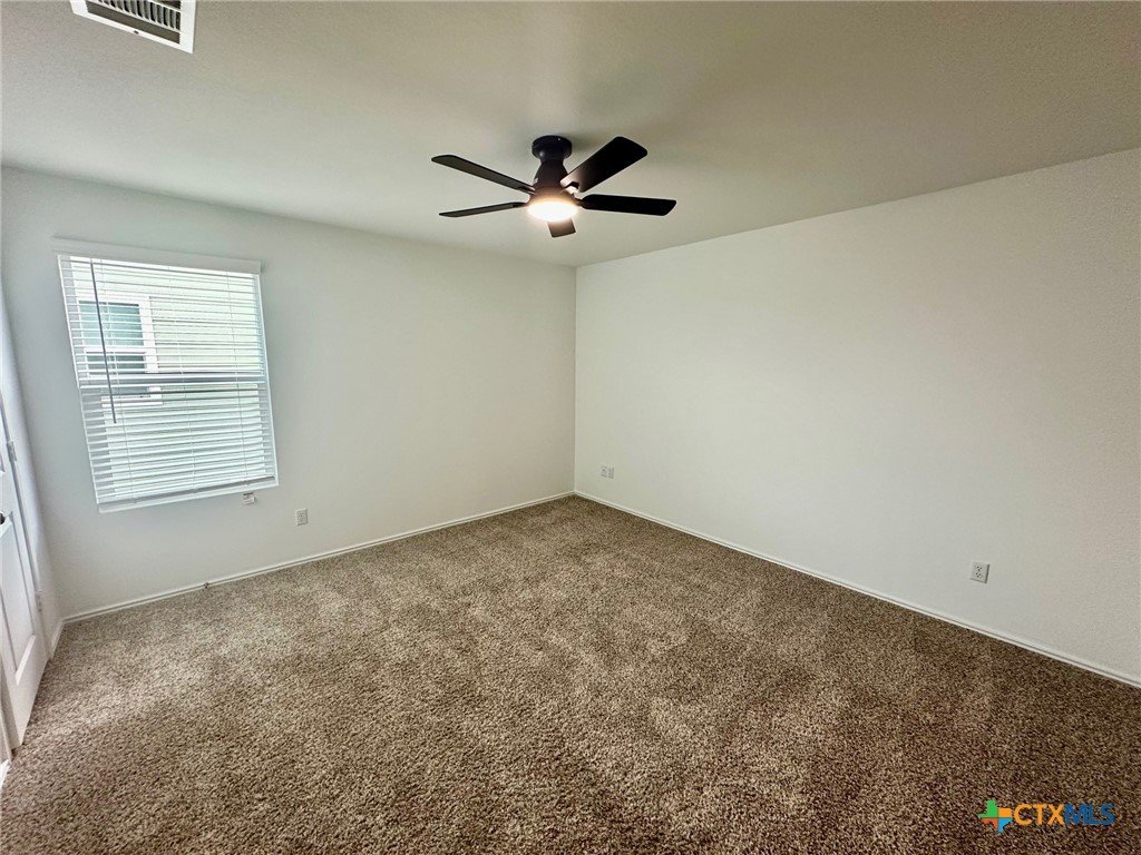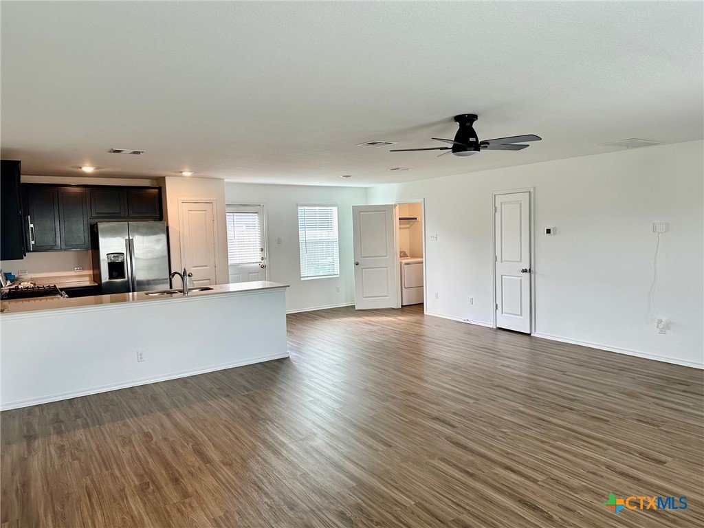 A nice two-story home that has a spacious open floorplan shared between the family room, dining room and kitchen on the first floor. All laminate wood-like flooring downstairs. Carpet upstairs. The second floor has all 3 bedrooms and including primary suite featuring a private bedroom. Comes with stainless steel appliances. Also, full size washer/dryer included. Huge fully fenced backyard. Fresh interior paint throughout the home. Ceiling fans in all rooms. There is a park with playground and picnic area. Ready for immediate move-in!