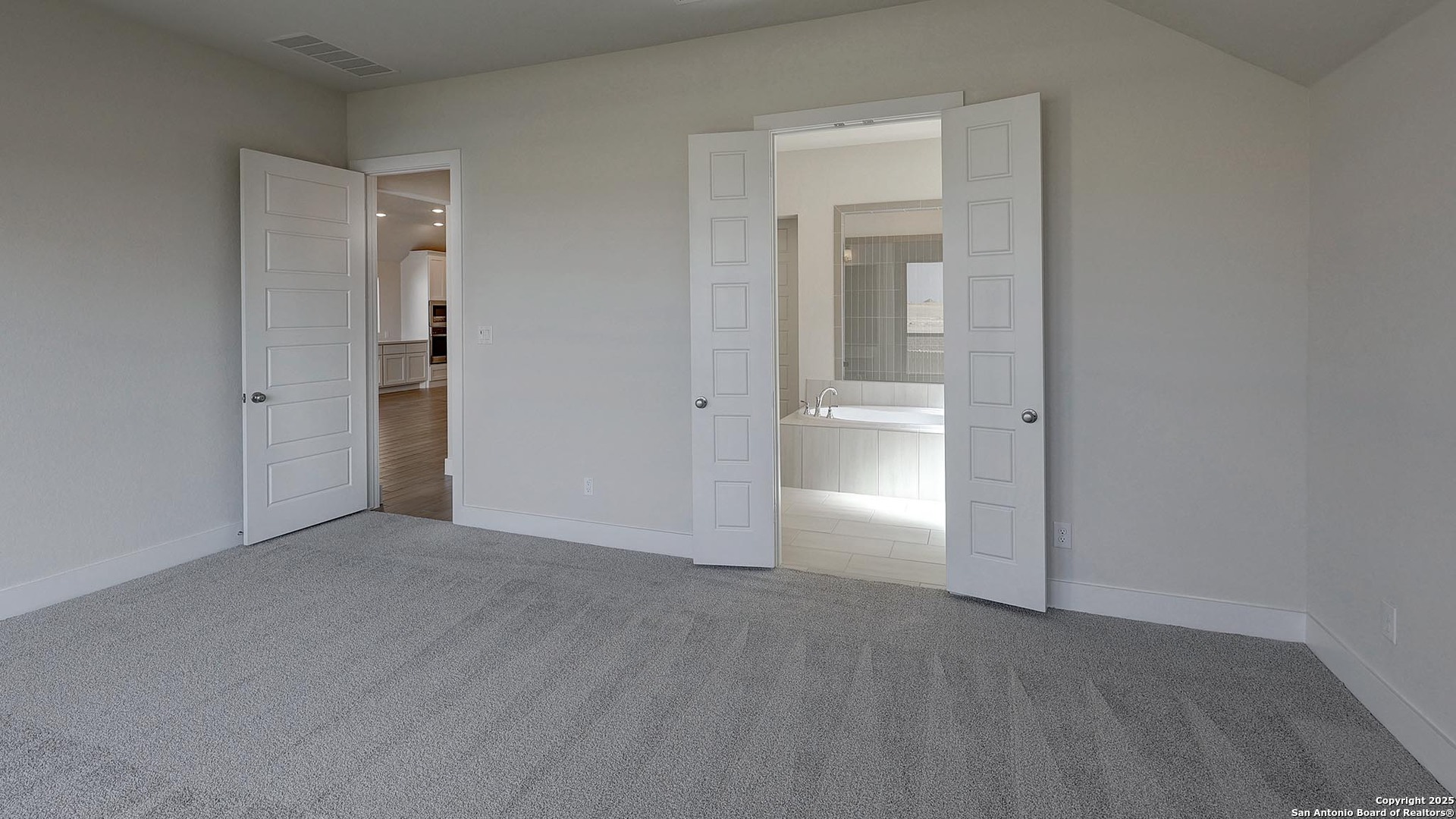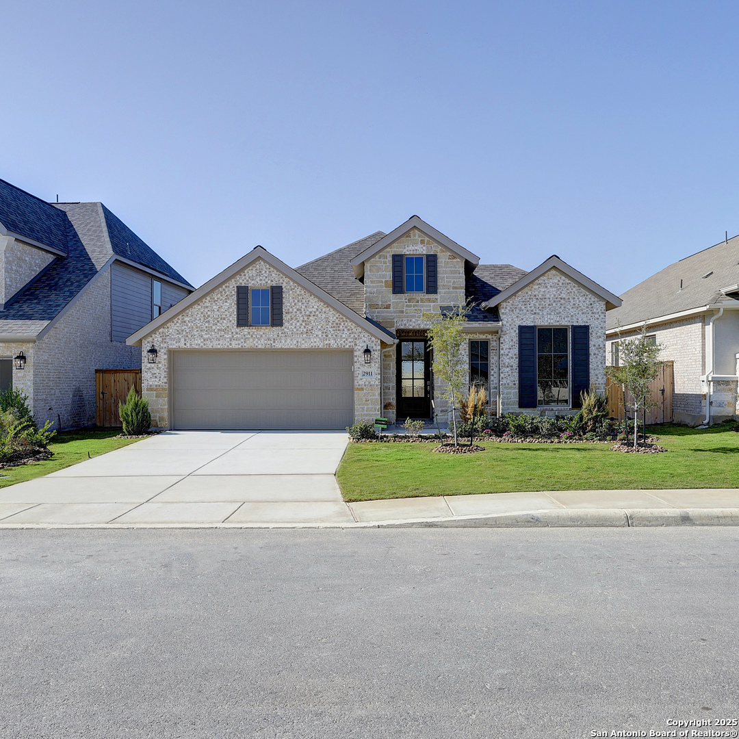 Extended entryway with 12-foot ceilings. Game room with French doors frame the entry. Spacious family room with a sliding glass door. Open kitchen offers an island with built-in seating space, 5-burner gas cooktop and a corner walk-in pantry. Primary suite with a wall of windows. Dual vanities, garden tub, separate glass enclosed shower and two walk-in closets in the primary bath. Guest suite just off the extended entry with a full bathroom and walk-in closet. Secondary bedrooms with walk-in closets. Utility room with private access to the primary bathroom. Extended covered backyard patio and landscaping features a 5-zone sprinkler system. Mud room just off the two-car garage.