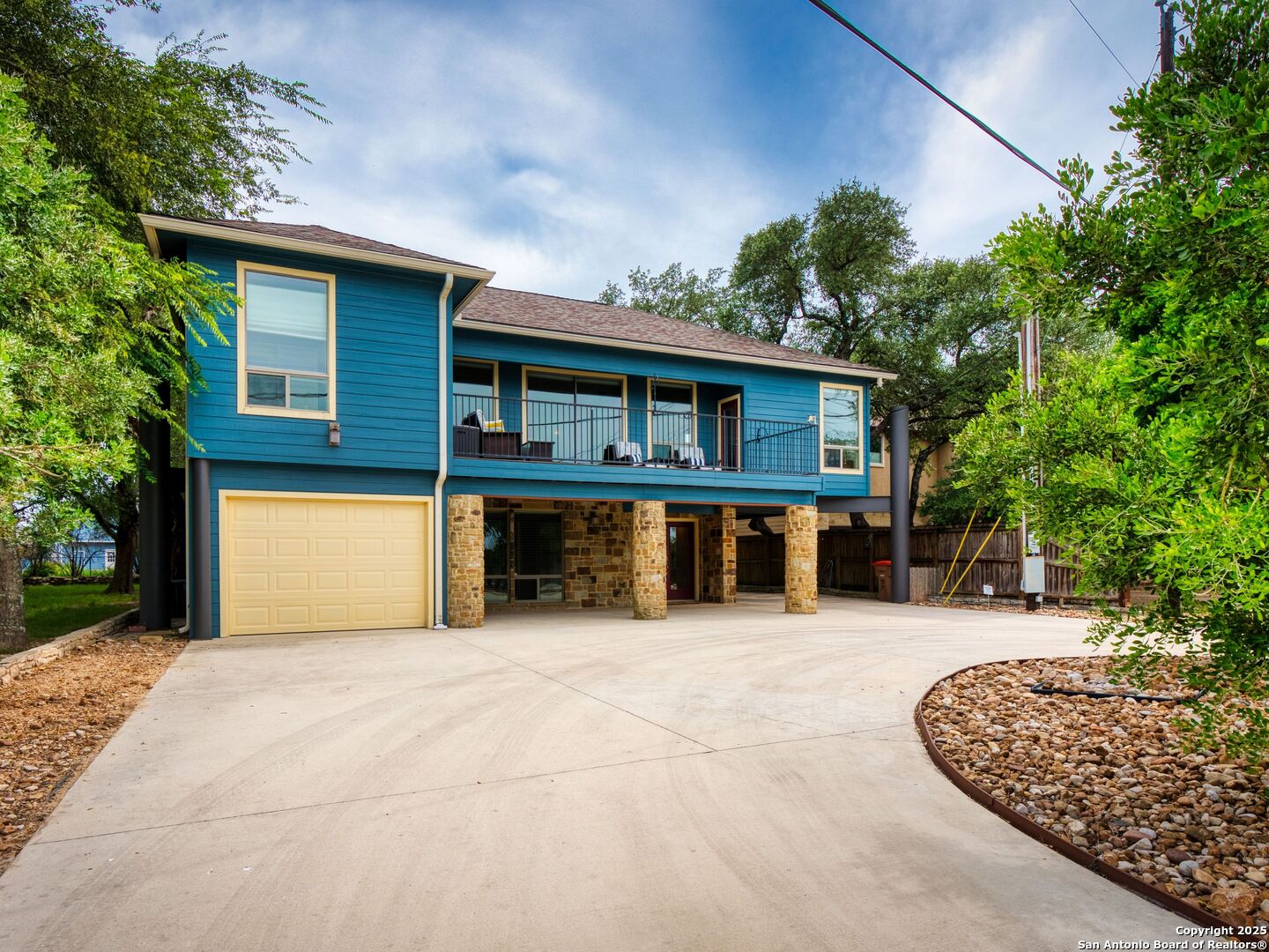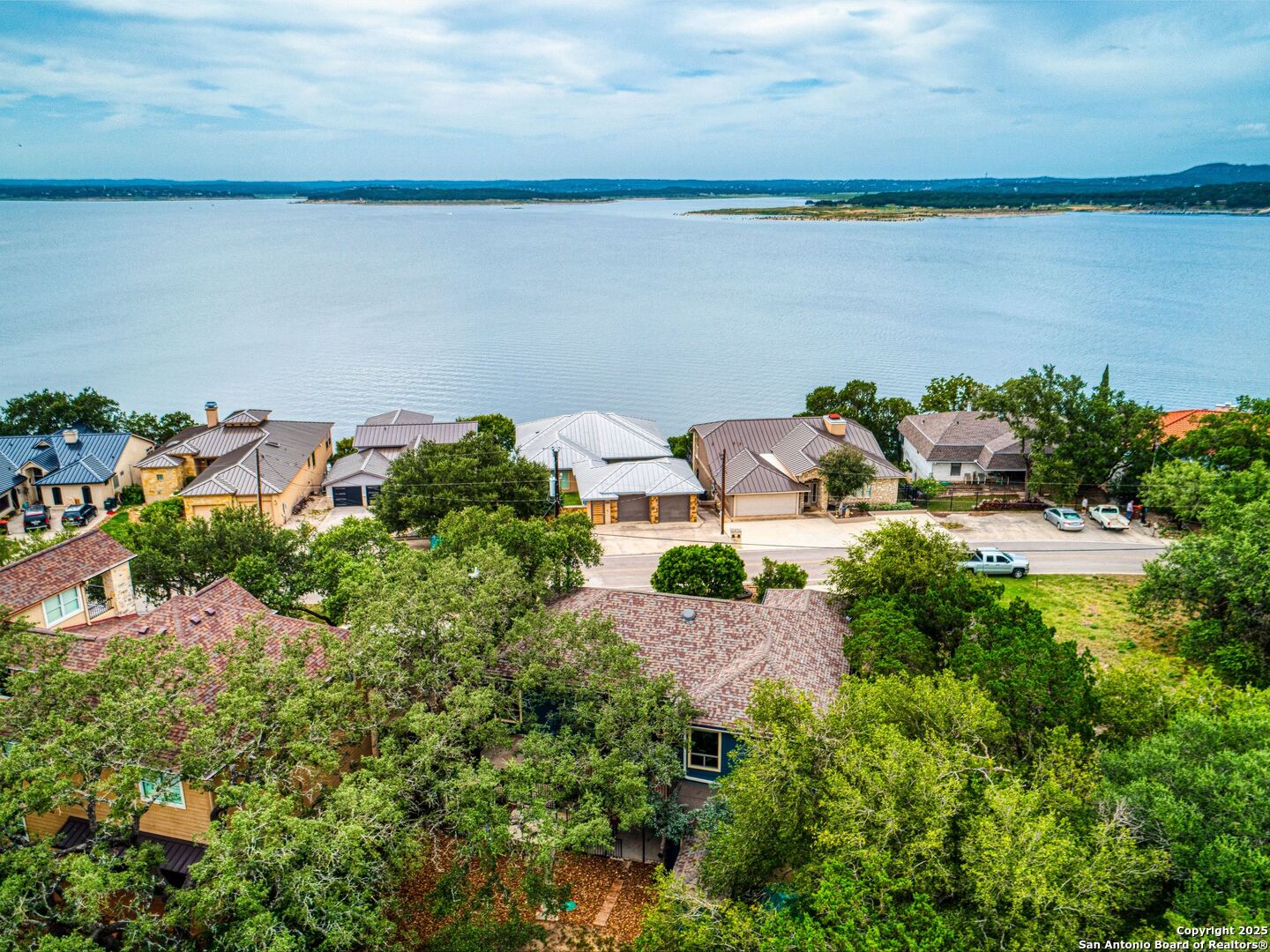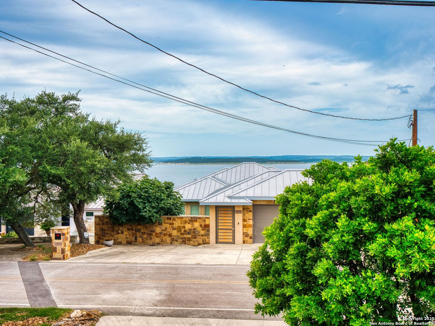 Experience lake living at its finest in this beautifully updated Canyon Lake retreat, just steps from Boat Ramp 2 in the highly desirable Canyon Lake Village West community. This home is steel constructed and designed to showcase its incredible lake views with an elevated reverse floor plan that maximizes the scenery from the main living areas and upstairs bedrooms. The property can be enjoyed as a full time residence or a short term rental investment. Step out onto the expansive front balcony and take in the panoramic blues of Canyon Lake, perfect for morning coffee or sunset gatherings. The back balcony offers a peaceful setting overlooking a fully fenced yard. Inside, you'll find an inviting open concept layout featuring a bright and airy living, dining, and kitchen space with soaring ceilings and abundant natural light. The primary suite opens directly onto the front balcony and includes a spacious walk in closet, dual storage options, and a private ensuite bath. Two additional bedrooms are connected by a Jack and Jill bath, with one also offering balcony access. Downstairs, a private elevator takes you to a flexible fourth bedroom or secondary living area. The space is complete with its own bathroom, a coffee bar, and direct outdoor access. Additional highlights include a newer roof, updated flooring downstairs, and full community amenities including a pool, tennis courts, park, and a clubhouse. Whether you're looking for a serene getaway, an Airbnb investment, or a full time residence, this home offers it all. Just minutes from Whitewater Amphitheater, the Guadalupe River, and the charming towns of New Braunfels, Wimberley, and San Antonio.