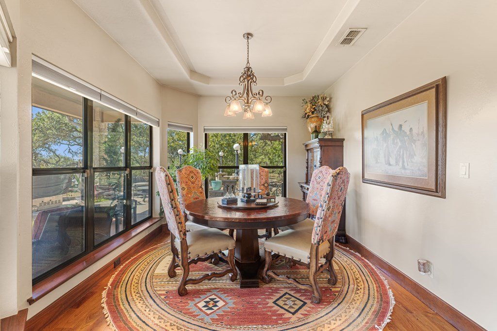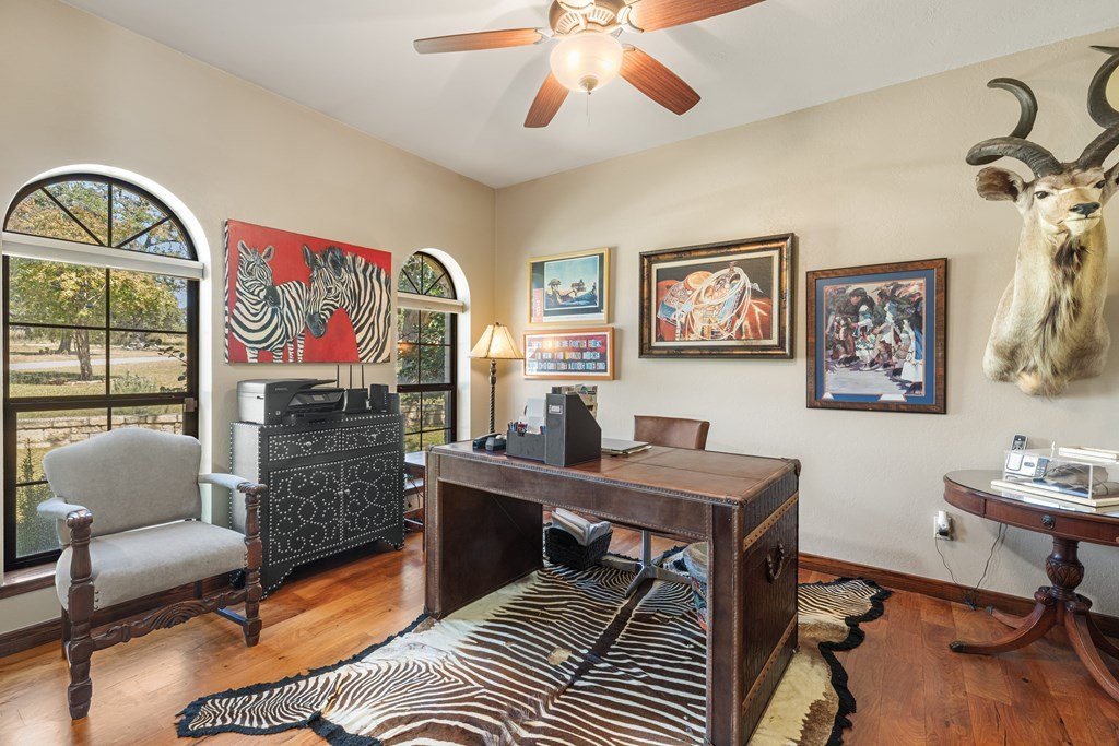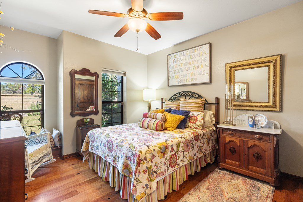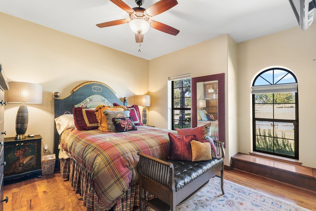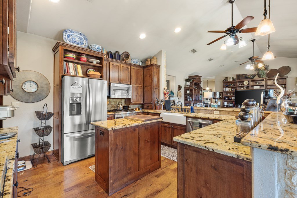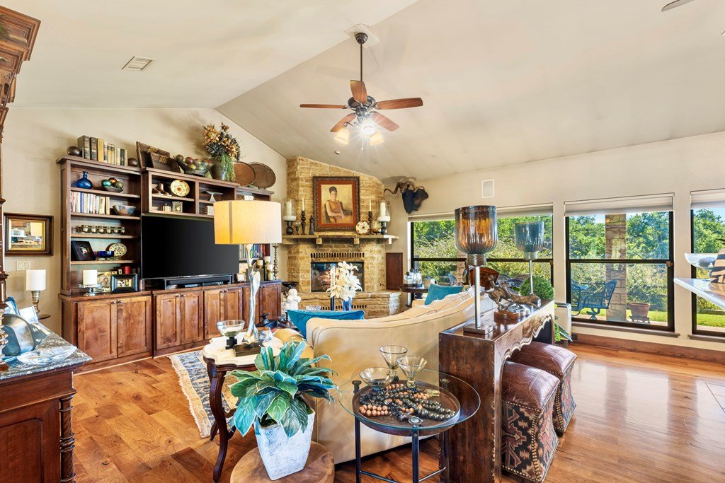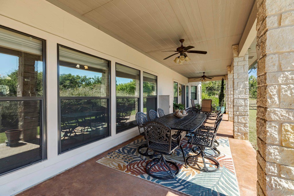 Nestled in the serene Hill Country, this picturesque 3-bedroom, 2 1/2-bath home is a tranquil retreat located just 14 miles from Main Street in Fredericksburg. Situated on 25 acres within the Lasso Ranch subdivision, the property offers unparalleled privacy amidst the grandeur of towering Oak trees. Boasting a newly installed metal roof, the home features a spacious kitchen with a generously sized walk-in pantry, a charming covered patio with a BBQ and entertainment area, and a luxurious primary suite with an expansive walk-in closet and tub. Additionally, a cozy fireplace and an extra room suitable for use as an office or storage add to the allure of this exceptional property. The well-maintained grounds surrounding the home are adorned with exquisite landscaping, enhancing the property's beauty. A new well pump has been recently replaced (60 GPM). This Hill Country-style home is a must-see!