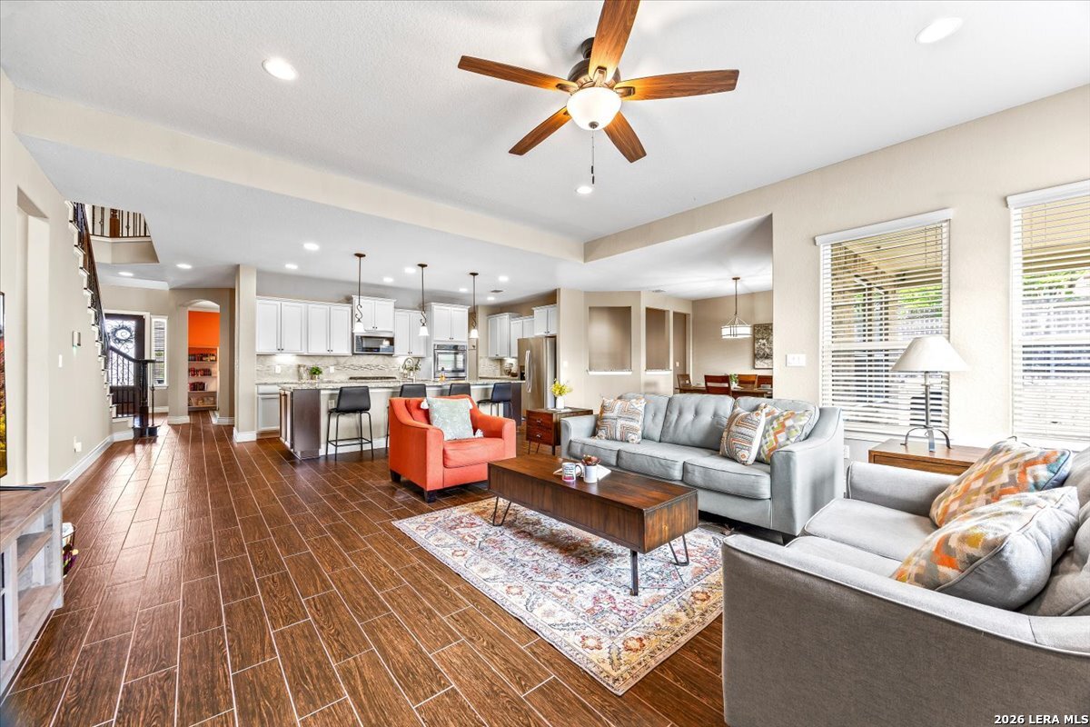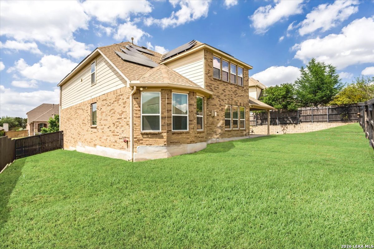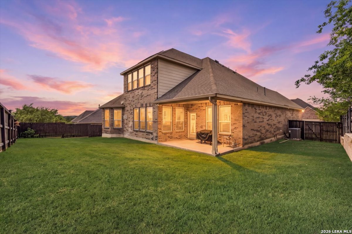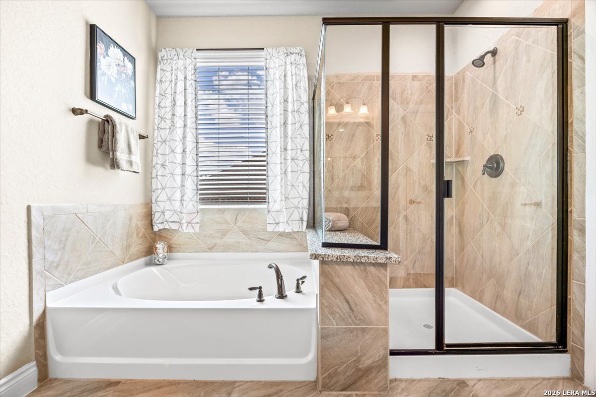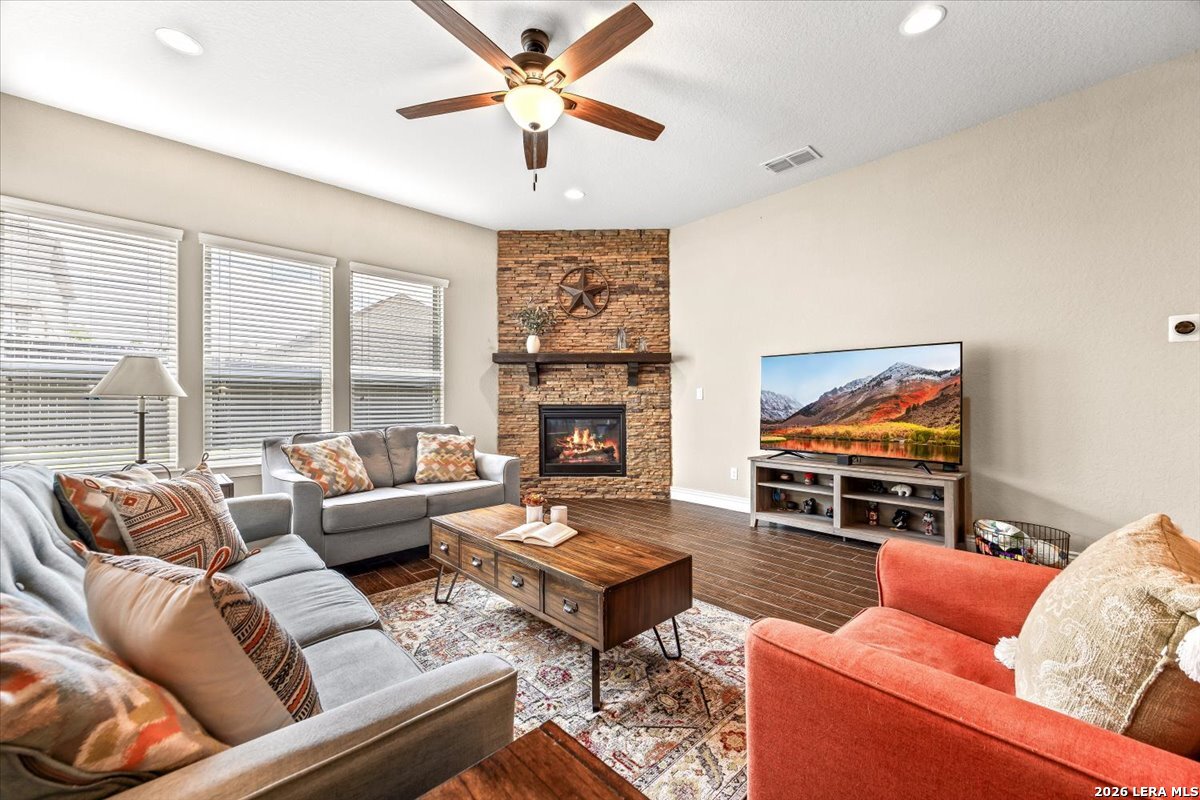 Beautifully maintained home in the gated Heights of Indian Springs, located in North San Antonio along the 281 corridor and zoned to Indian Springs Elementary and Pieper High School in highly acclaimed Comal ISD-with NO city taxes. This thoughtfully designed 4-bedroom, 3.5-bath home with study, gameroom, and media room offers a highly functional layout and features a rare tandem 3-car garage, providing exceptional space for extra vehicles, storage, a home gym, or workshop. From the moment you arrive, you'll notice the charming curb appeal, elevated entry, and inviting front porch, leading into a home filled with natural light, soaring ceilings, and rich wood-look tile flooring throughout the main living areas. The flexible floor plan includes the primary suite and a secondary bedroom downstairs, ideal for guests or multi-generational living, along with a private study with glass doors-perfect for working from home. The open-concept layout is ideal for everyday living and entertaining, centered around a chef's kitchen featuring a large granite island, built-in stainless steel appliances, gas cooking, double ovens, a walk-in pantry, and abundant cabinetry. The kitchen flows seamlessly into the dining and family room, where you'll find a floor-to-ceiling stone fireplace and oversized windows overlooking the backyard. The primary suite offers a relaxing retreat with a bay window sitting area and a spa-like bathroom featuring dual vanities, granite countertops, soaking tub, walk-in shower, and a generous walk-in closet. Upstairs, enjoy a large gameroom and dedicated media room, providing flexible space for movie nights, entertaining, or a separate retreat for family and guests. Step outside to a covered back patio and spacious backyard, perfect for relaxing or hosting gatherings. Features excellent amenities, including a pool, playground, dog park, and brand-new pickleball courts. Move-in ready with premium features, no city taxes, and an unbeatable location-this home truly checks all the boxes.