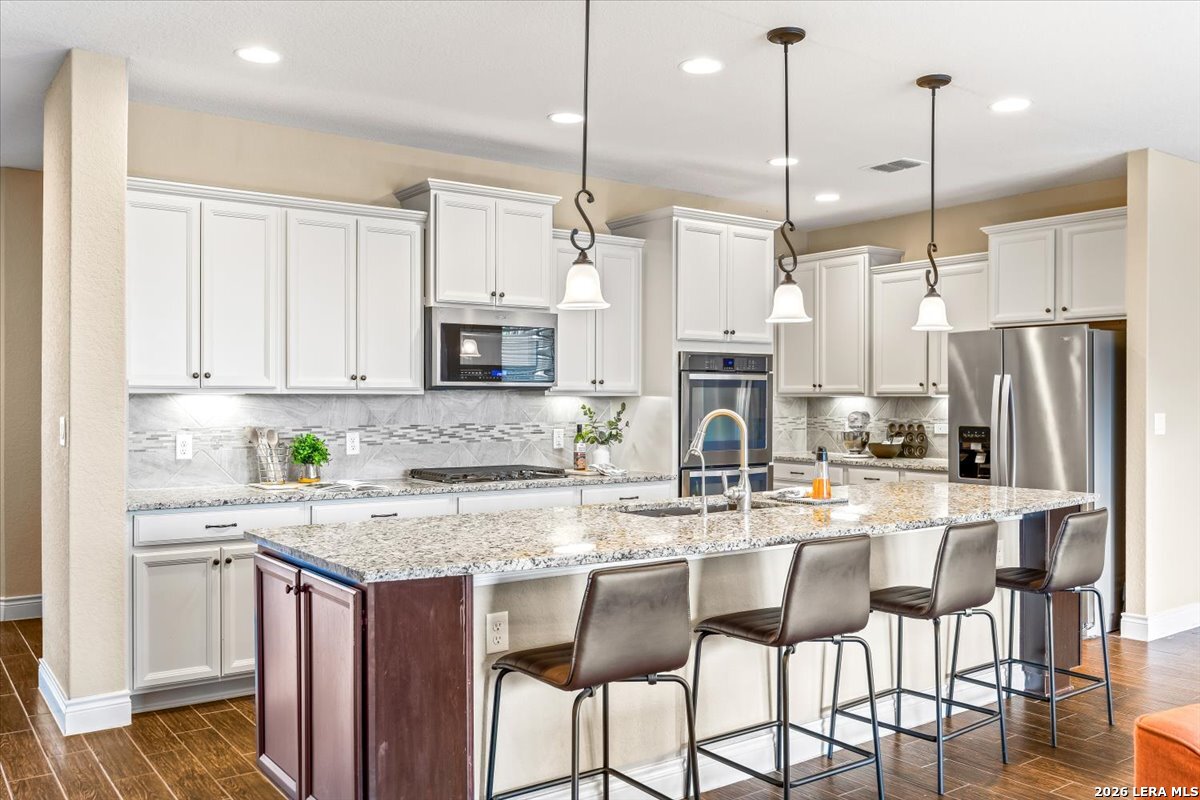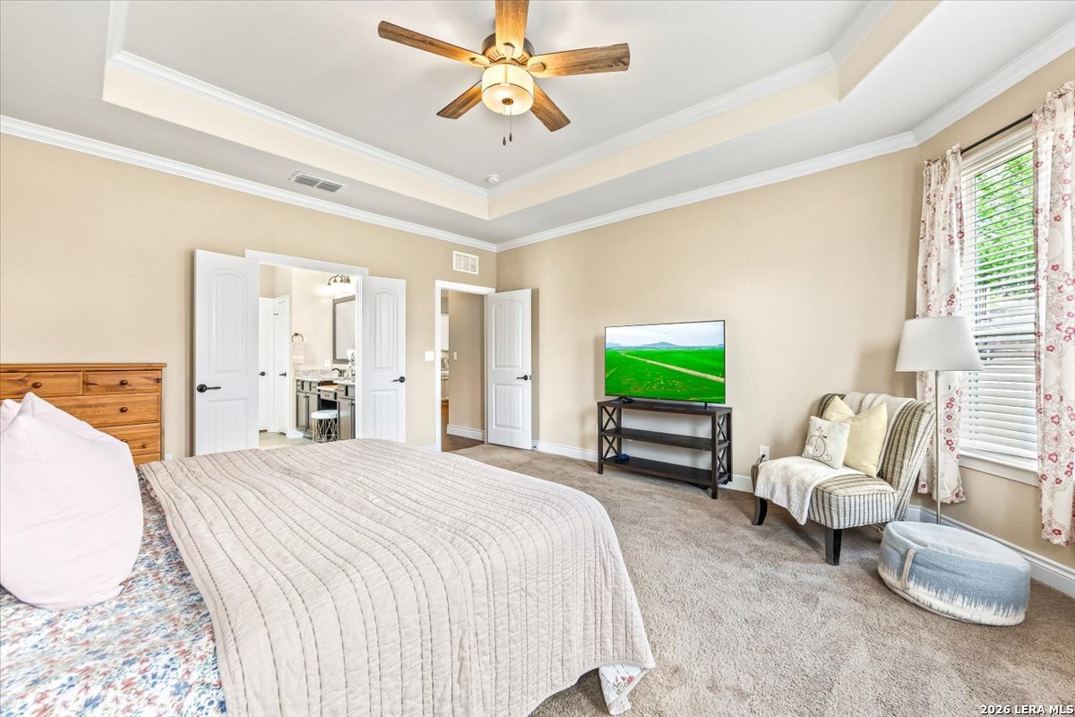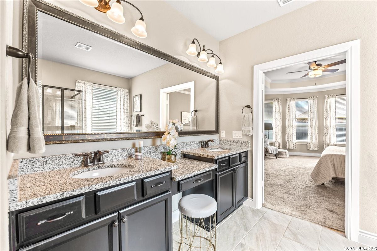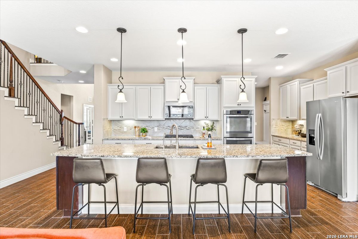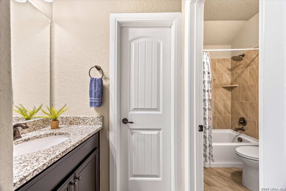 Beautifully maintained home in the gated Heights of Indian Springs, located in North San Antonio along the 281 corridor and zoned to Indian Springs Elementary and Pieper High School in highly acclaimed Comal ISD-with NO city taxes. This thoughtfully designed 4-bedroom, 3.5-bath home with study, gameroom, and media room offers a highly functional layout and features a rare tandem 3-car garage, providing exceptional space for extra vehicles, storage, a home gym, or workshop. From the moment you arrive, you'll notice the charming curb appeal, elevated entry, and inviting front porch, leading into a home filled with natural light, soaring ceilings, and rich wood-look tile flooring throughout the main living areas. The flexible floor plan includes the primary suite and a secondary bedroom downstairs, ideal for guests or multi-generational living, along with a private study with glass doors-perfect for working from home. The open-concept layout is ideal for everyday living and entertaining, centered around a chef's kitchen featuring a large granite island, built-in stainless steel appliances, gas cooking, double ovens, a walk-in pantry, and abundant cabinetry. The kitchen flows seamlessly into the dining and family room, where you'll find a floor-to-ceiling stone fireplace and oversized windows overlooking the backyard. The primary suite offers a relaxing retreat with a bay window sitting area and a spa-like bathroom featuring dual vanities, granite countertops, soaking tub, walk-in shower, and a generous walk-in closet. Upstairs, enjoy a large gameroom and dedicated media room, providing flexible space for movie nights, entertaining, or a separate retreat for family and guests. Step outside to a covered back patio and spacious backyard, perfect for relaxing or hosting gatherings. Features excellent amenities, including a pool, playground, dog park, and brand-new pickleball courts. Move-in ready with premium features, no city taxes, and an unbeatable location-this home truly checks all the boxes.