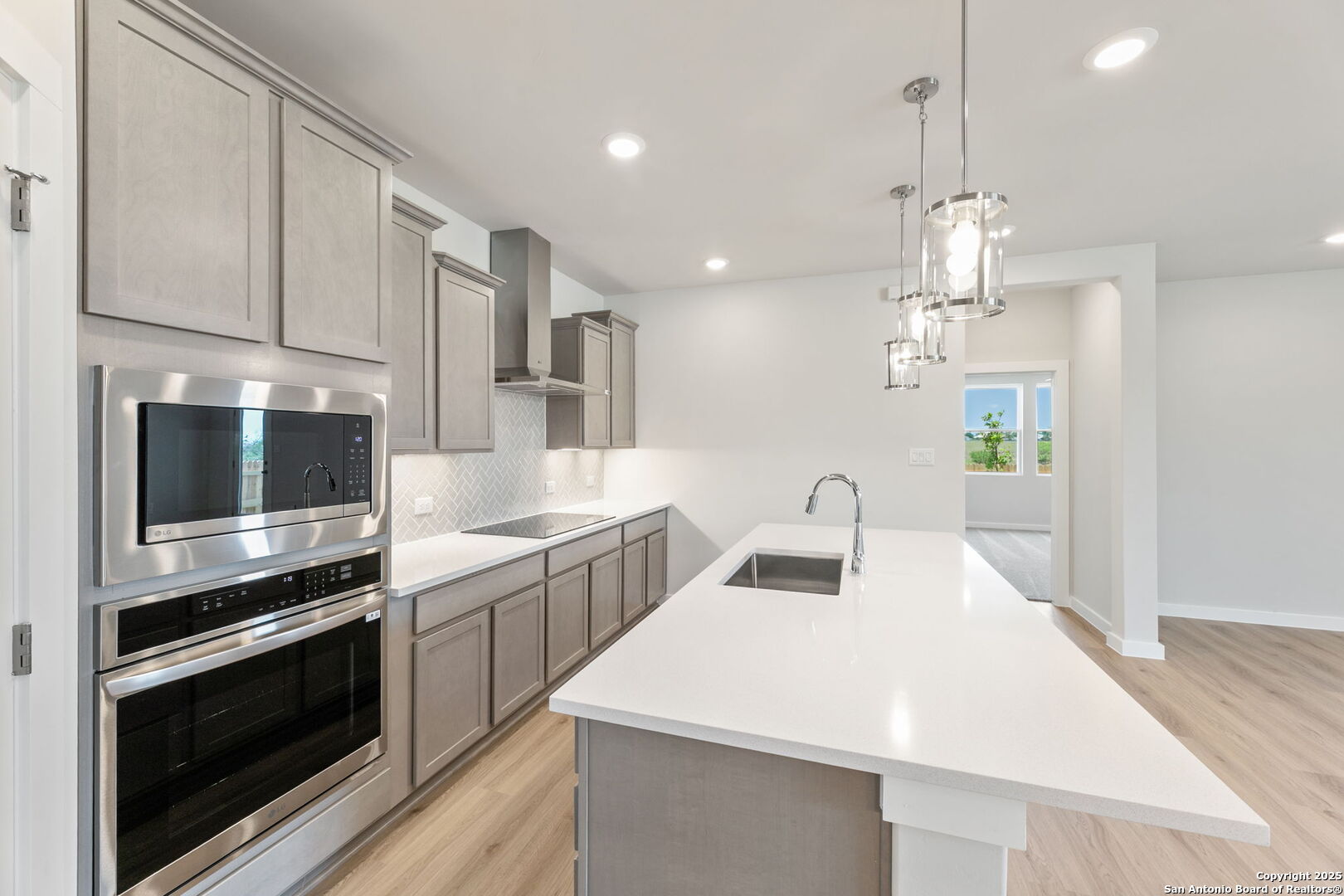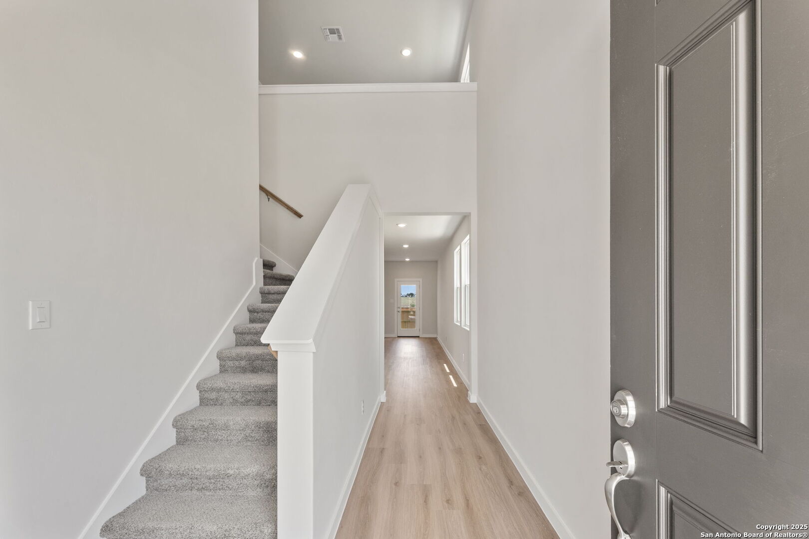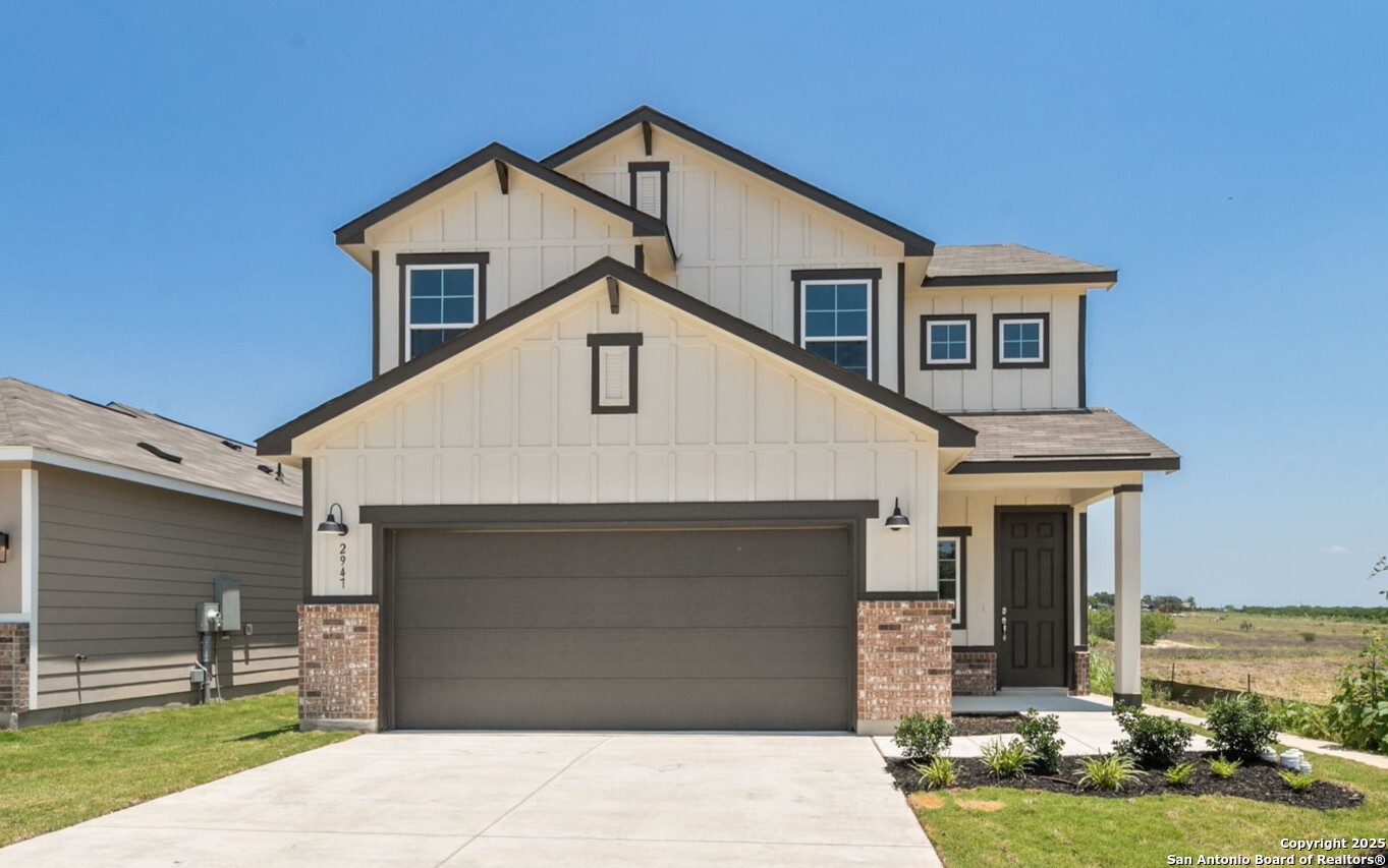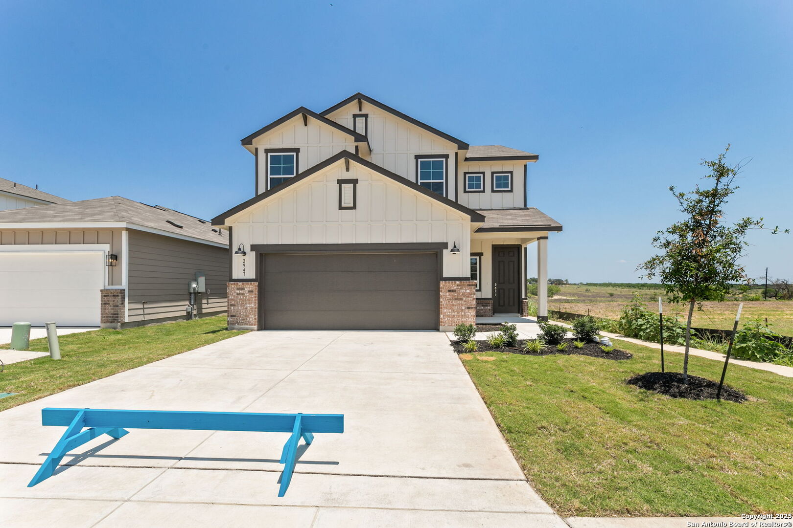 Nestled on a quiet street, the Colorado floor plan stands out with its Modern Farmhouse elevation, blending ornate details and brick accents for a charming yet sophisticated look. With only one neighbor to the side and none behind, you'll enjoy a sense of space and privacy that's hard to find. Step through the 8-foot front door, and a grand entryway greets you with soaring ceilings and an abundance of natural light. The home's warm, sophisticated finishes create an inviting atmosphere from the moment you arrive. Luxury vinyl plank flooring stretches throughout the main living areas, offering both durability and elegance. At the heart of the home, the Great Room makes an unforgettable impression. Designed for both comfort and style, this expansive space is perfect for gathering with family and friends. A ceiling fan with light and four additional LED disc lights ensure the room stays bright and inviting-whether you're hosting a lively get-together or winding down in the evening. A flat-mounted TV prep has already been installed, complete with a concealed conduit that keeps cords out of sight-so your entertainment setup looks just as sleek as the rest of the home. The gourmet kitchen seamlessly blends function and beauty. White quartz countertops and rich, gray-stained cabinetry create a striking contrast, while an elegant chevron-pattern backsplash in a warm greige tone adds refined texture. A sleek electric cooktop, built-in microwave and oven with stainless steel finish make meal prep effortless. Pendant lighting over the island enhances the space, while under-cabinet lighting provides a soft glow and highlights the designer finishes. A walk-in pantry keeps everything neatly stored. Tucked away on the main level, the owner's retreat is a private sanctuary. A tray ceiling adds architectural elegance, while four additional LED disc lights provide the perfect balance of brightness and ambiance. The deluxe shower is a true luxury, featuring large-format tile with the look of marble veining, a mudset tile floor, a built-in bench seat, and tile to the ceiling for a high-end, spa-like feel. The ensuite bath includes a double vanity with white quartz countertops, tall vanity height, a private commode, and a linen closet, along with a spacious walk-in closet with built-in shelving for effortless organization. Upstairs, the loft area overlooks the grand entry and offers a flexible space for a second living area, playroom, or home office. The three secondary bedrooms are all generously sized, with one featuring a walk-in closet. A shared bathroom is designed for convenience, with a double vanity topped with white quartz and a separate door to the tub and commode area, making it easy for multiple people to get ready at once. Smart storage and thoughtful details are found throughout the home. The spacious laundry room includes extra shelving and a hanging rod, helping keep everyday tasks organized. Plus, the home is pre-plumbed for a water softener, ensuring softer water for your laundry-helping clothes last longer and stay brighter. A large coat closet near the front entry and garage serves as the perfect drop zone, and the powder bath is tucked away for privacy, keeping main living areas uncluttered. Step outside to your covered patio, where you can relax and enjoy the peaceful surroundings. With no neighbors behind and none on the patio side, this outdoor space offers true privacy-whether you're sipping coffee in the morning or unwinding in the evening. Every detail of this home was selected with modern luxury, warmth, and everyday livability in mind. Come experience it for yourself-schedule a tour at our Hakes Brothers model home today!