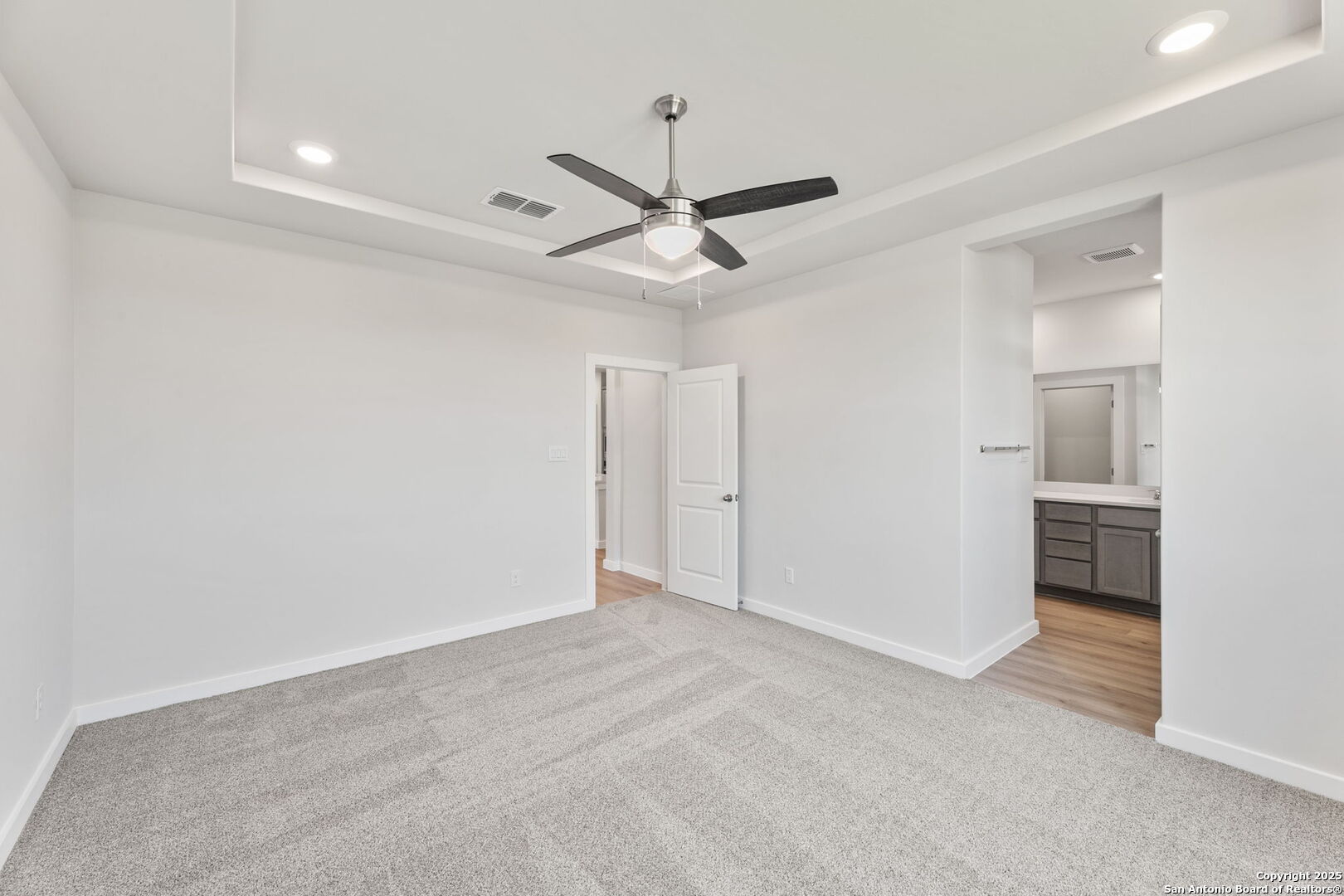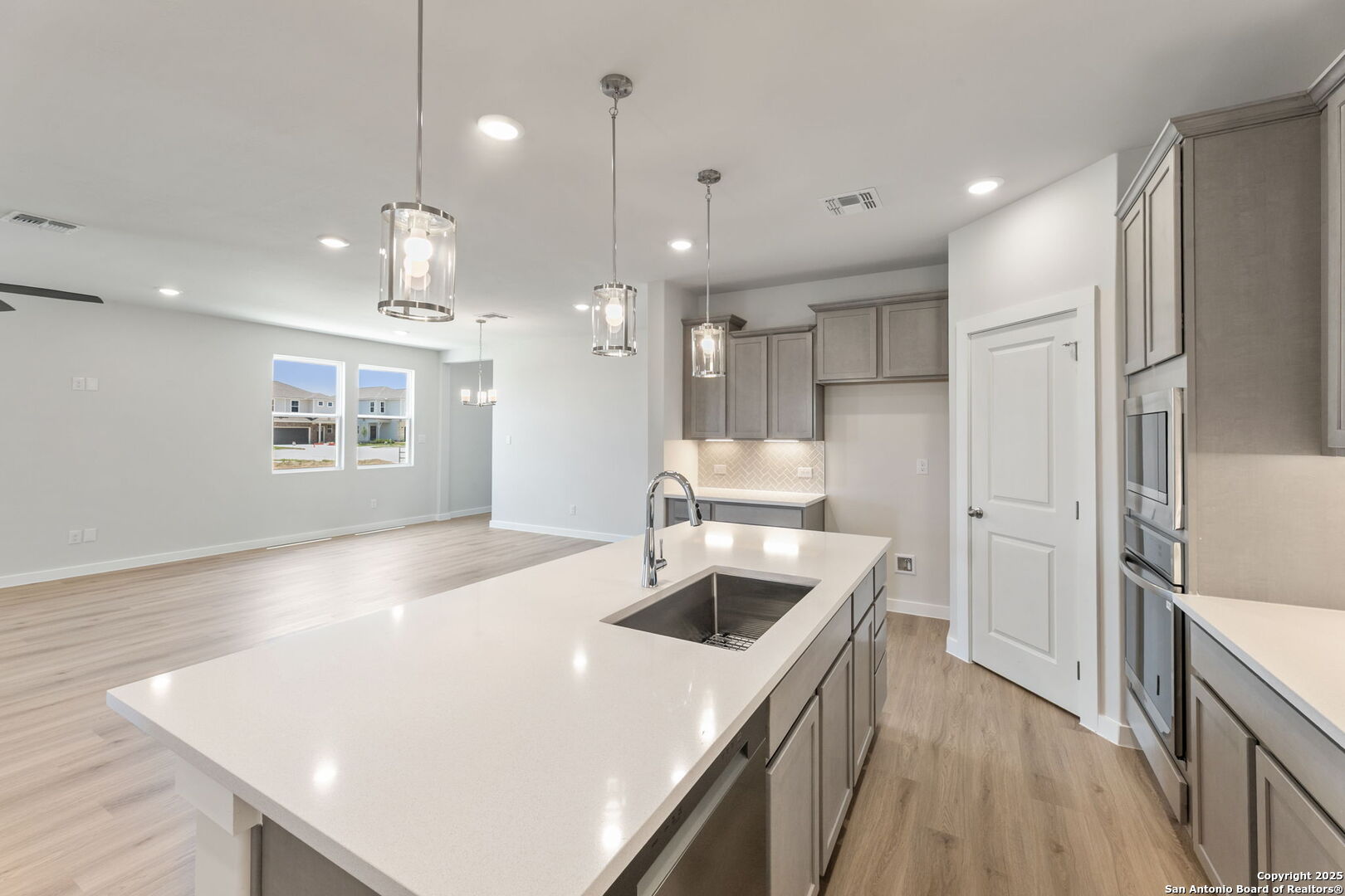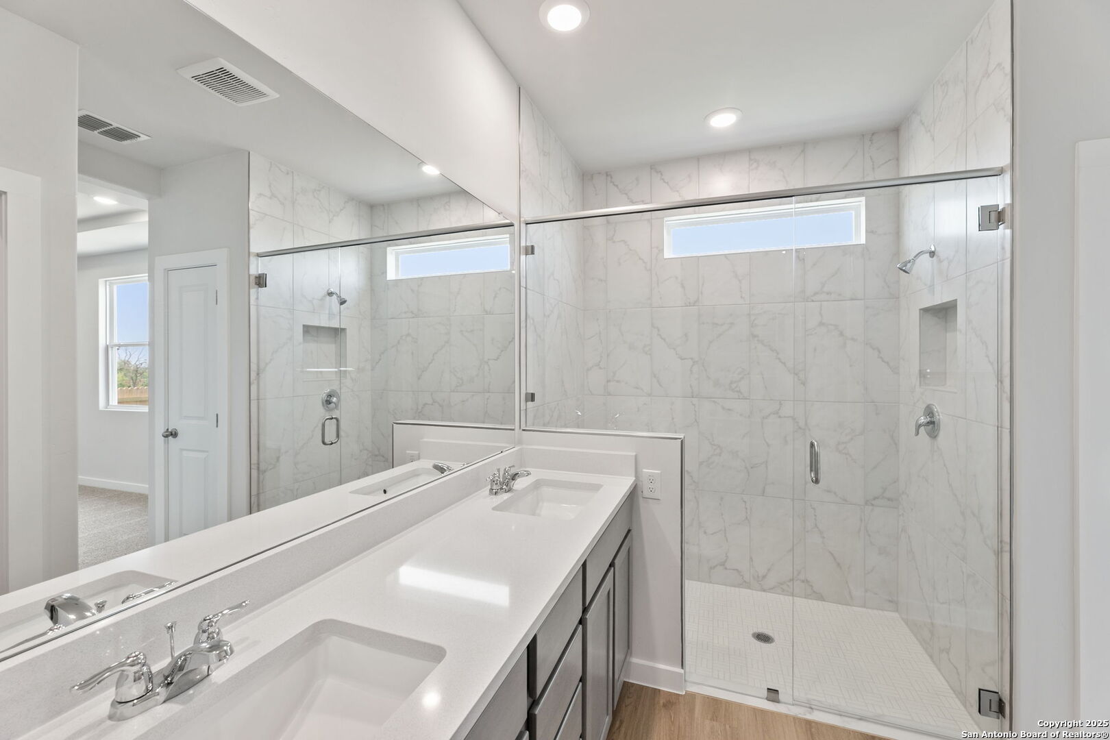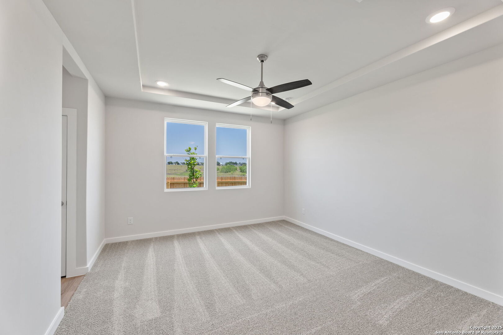 Nestled on a quiet street, the Colorado floor plan stands out with its Modern Farmhouse elevation, blending ornate details and brick accents for a charming yet sophisticated look. With only one neighbor to the side and none behind, you'll enjoy a sense of space and privacy that's hard to find. Step through the 8-foot front door, and a grand entryway greets you with soaring ceilings and an abundance of natural light. The home's warm, sophisticated finishes create an inviting atmosphere from the moment you arrive. Luxury vinyl plank flooring stretches throughout the main living areas, offering both durability and elegance. At the heart of the home, the Great Room makes an unforgettable impression. Designed for both comfort and style, this expansive space is perfect for gathering with family and friends. A ceiling fan with light and four additional LED disc lights ensure the room stays bright and inviting-whether you're hosting a lively get-together or winding down in the evening. A flat-mounted TV prep has already been installed, complete with a concealed conduit that keeps cords out of sight-so your entertainment setup looks just as sleek as the rest of the home. The gourmet kitchen seamlessly blends function and beauty. White quartz countertops and rich, gray-stained cabinetry create a striking contrast, while an elegant chevron-pattern backsplash in a warm greige tone adds refined texture. A sleek electric cooktop, built-in microwave and oven with stainless steel finish make meal prep effortless. Pendant lighting over the island enhances the space, while under-cabinet lighting provides a soft glow and highlights the designer finishes. A walk-in pantry keeps everything neatly stored. Tucked away on the main level, the owner's retreat is a private sanctuary. A tray ceiling adds architectural elegance, while four additional LED disc lights provide the perfect balance of brightness and ambiance. The deluxe shower is a true luxury, featuring large-format tile with the look of marble veining, a mudset tile floor, a built-in bench seat, and tile to the ceiling for a high-end, spa-like feel. The ensuite bath includes a double vanity with white quartz countertops, tall vanity height, a private commode, and a linen closet, along with a spacious walk-in closet with built-in shelving for effortless organization. Upstairs, the loft area overlooks the grand entry and offers a flexible space for a second living area, playroom, or home office. The three secondary bedrooms are all generously sized, with one featuring a walk-in closet. A shared bathroom is designed for convenience, with a double vanity topped with white quartz and a separate door to the tub and commode area, making it easy for multiple people to get ready at once. Smart storage and thoughtful details are found throughout the home. The spacious laundry room includes extra shelving and a hanging rod, helping keep everyday tasks organized. Plus, the home is pre-plumbed for a water softener, ensuring softer water for your laundry-helping clothes last longer and stay brighter. A large coat closet near the front entry and garage serves as the perfect drop zone, and the powder bath is tucked away for privacy, keeping main living areas uncluttered. Step outside to your covered patio, where you can relax and enjoy the peaceful surroundings. With no neighbors behind and none on the patio side, this outdoor space offers true privacy-whether you're sipping coffee in the morning or unwinding in the evening. Every detail of this home was selected with modern luxury, warmth, and everyday livability in mind. Come experience it for yourself-schedule a tour at our Hakes Brothers model home today!