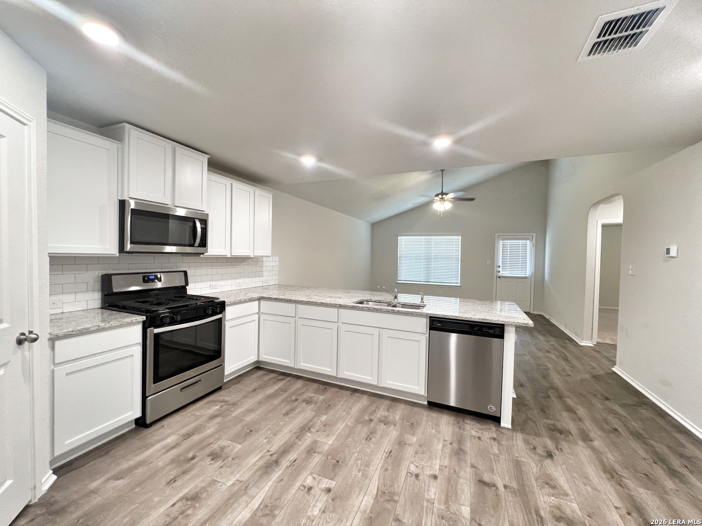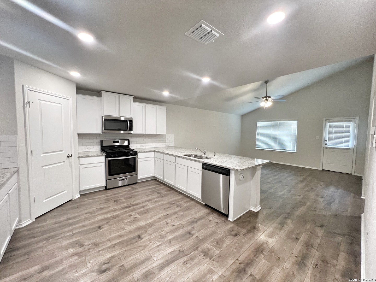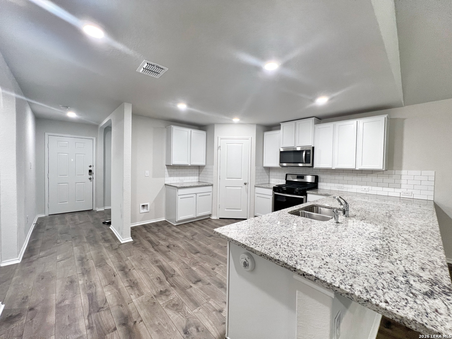 Welcome to this stunning two-story home that offers a perfect blend of style, comfort, and modern living. Step inside and be greeted by the freshly painted walls that exude a sense of freshness and elegance throughout. With 4 bedroom, 2.5 baths, this home provide ample space for both daily living & entertaining. As you enter through the front door, you'll immediately notice the thoughtfully designed separate dining area, located to the left of the entryway. The combination of the open kitchen with a breakfast bar, granite countertops, a gas stove/range, and its connection to the living room with 9ft ceilings & laminate flooring, creates an inviting & functional space for both culinary pursuits & relaxation. The private main bedroom suite is located downstairs off the LR & offers dual vanities, separate tub & shower, ceramic tile flooring, walk-in closet w/shelving. A 1/2 bath is located off the LR & an oversized utility room is located off the kitchen by the stairs. The second floor includes a spacious game room or office area, a second full bath, & three large secondary bedrooms with walk-in closets. Step into the generous size backyard, combined with the inviting covered patio, creates an outdoor space for relaxation, entertainment and enjoying the beauty of nature. Neighborhood amenities include: pool, splash pad, fitness center, sports court, dog park & nature walk trails. Located off Hwy 281, near FM 1863, easy access to shopping, popular local restaurants, entertainment, and more. This home is a MUST SEE. Photos are from when home was vacant. Home will be available for move in May 1, 2026