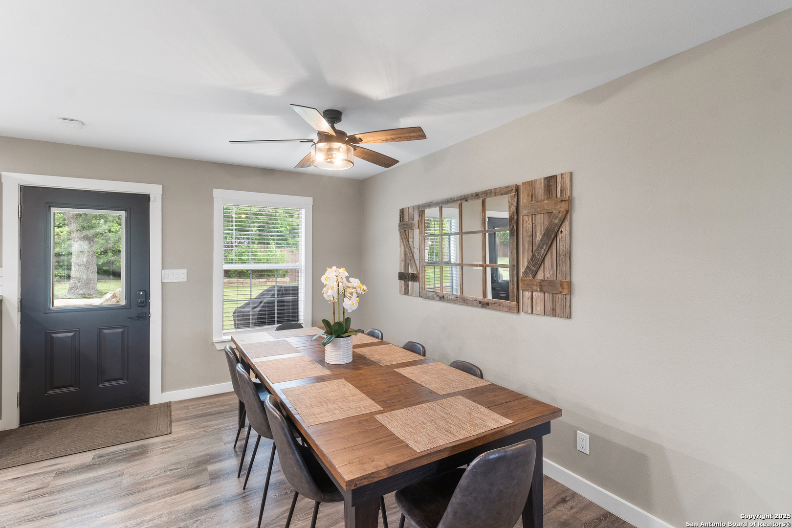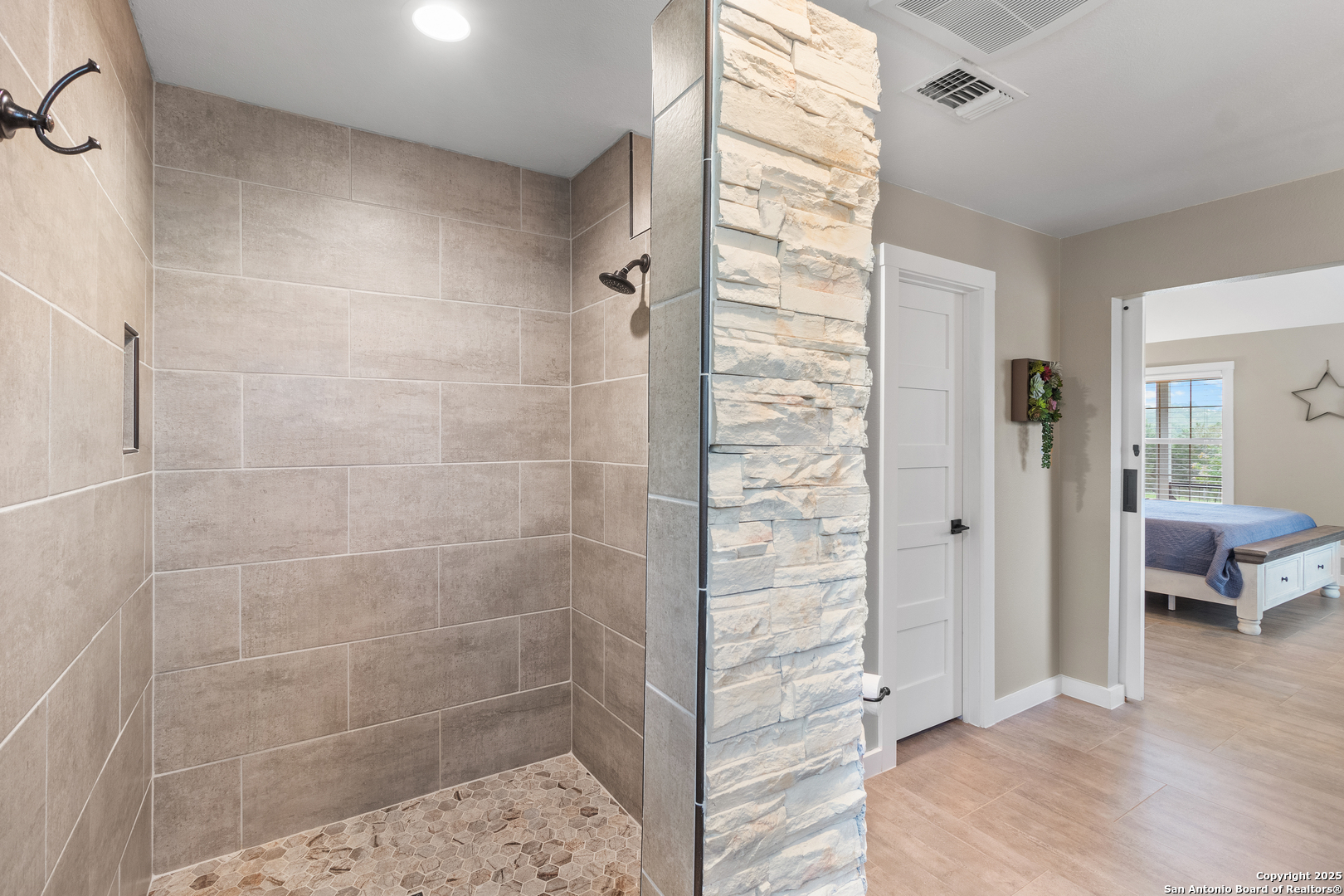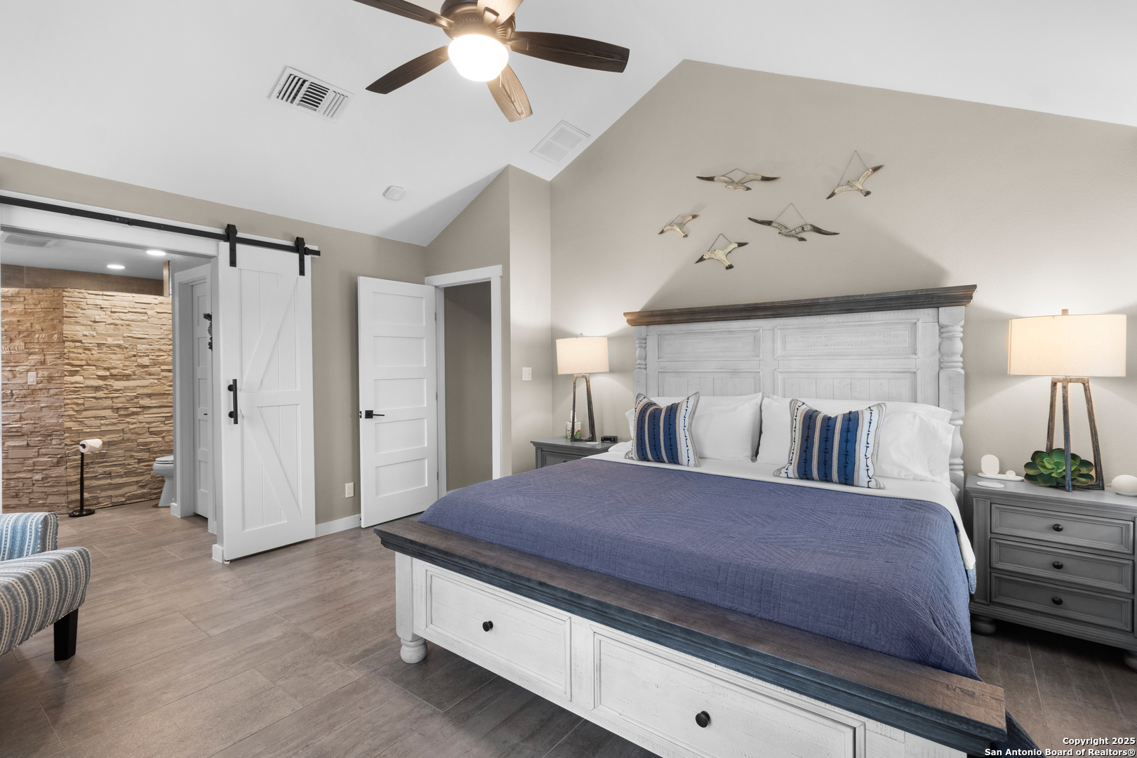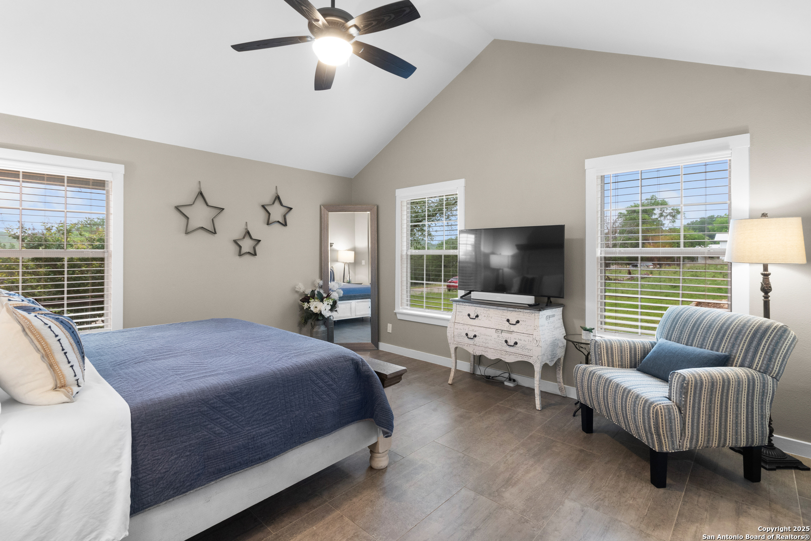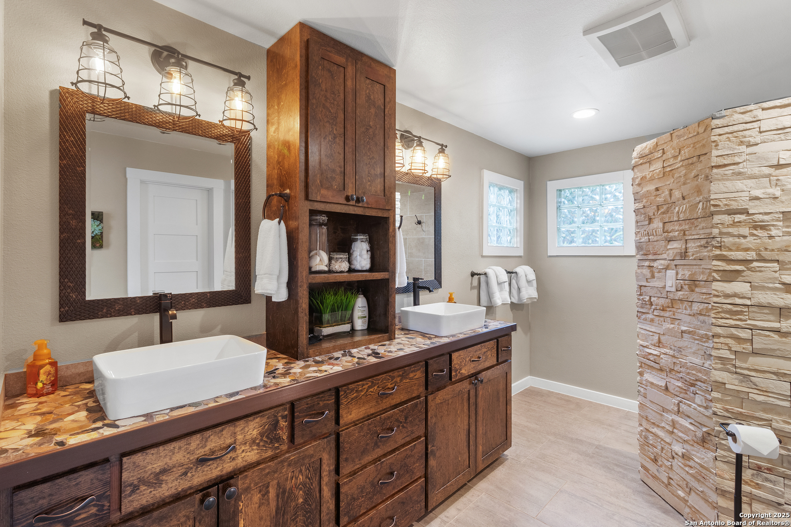 Immaculate Texas Hill Country Retreat with Smart Home Features & Stunning Outdoor Living Nestled just outside of Bandera's city limits. This beautifully updated 4-bedroom, 2-bathroom home on .379 acres is the perfect blend of modern comfort and Hill Country charm. Offering smart home features, a spacious split floorplan, and impeccable seller upgrades, this home is truly a standout. Inside, the living room is a cozy yet spacious, designed for both relaxation and entertaining. With vaulted ceilings and stunning touches like a gorgeous rock fireplace featuring an electric fireplace insert, this room exudes warmth and character. A stylish wall-mounted TV above the fireplace offers the perfect focal point. The shiplap accents add a touch of rustic charm. The chef's kitchen is a true showstopper with quartz countertops, a subway tile backsplash, a hidden reveal stainless sink, a large walk-in pantry/laundry room, and a kitchen bar area-perfect for hosting guests or enjoying a casual meal. The open flow between the kitchen, dining, and living areas creates a perfect atmosphere for gatherings. The primary bedroom suite is a private retreat with vaulted ceilings and an abundance of natural light. A charming sliding barn door leads to the master bathroom, which has been elegantly remodeled with new tile, a dual custom vanity, and a huge custom limestone rock walk-in shower-the ultimate in relaxation and style. The split floorplan also includes a large guest suite with private outdoor access-ideal for visitors or multi-generational living. Additional two bedrooms, both with vaulted ceilings, are versatile spaces that can easily be transformed into an office or workout room. Step outside to find a professionally landscaped yard with new trees, crepe myrtles, and new plantings. Zoysia drought-tolerant grass ensures a lush lawn with minimal upkeep with the new sprinkler system. Enjoy the outdoors with several living areas, including a covered front porch, a firepit area, and a grassy patio with chaise lounges to soak in the sun. There's also a patio just off the kitchen perfect for barbecuing and entertaining guests, as well as a dog run/kennel with a doghouse-perfect for pet owners. Additional features solar-powered motion-sensor pathway lights, new window and gutter screens, and an outdoor storage building. The home's energy efficiency has been enhanced with added blown insulation, while oak trees on the property provide both beauty and shade. For even more space, the adjacent .356-acre lot (Lot #8) is also available for purchase. This lot has been cleared and is ideal for a buffer zone or for future development-offering endless possibilities. This home is move-in ready and offers the perfect combination of luxury, privacy, and convenience.
