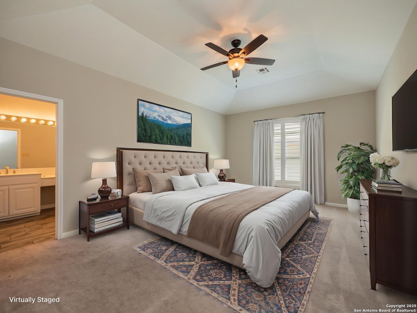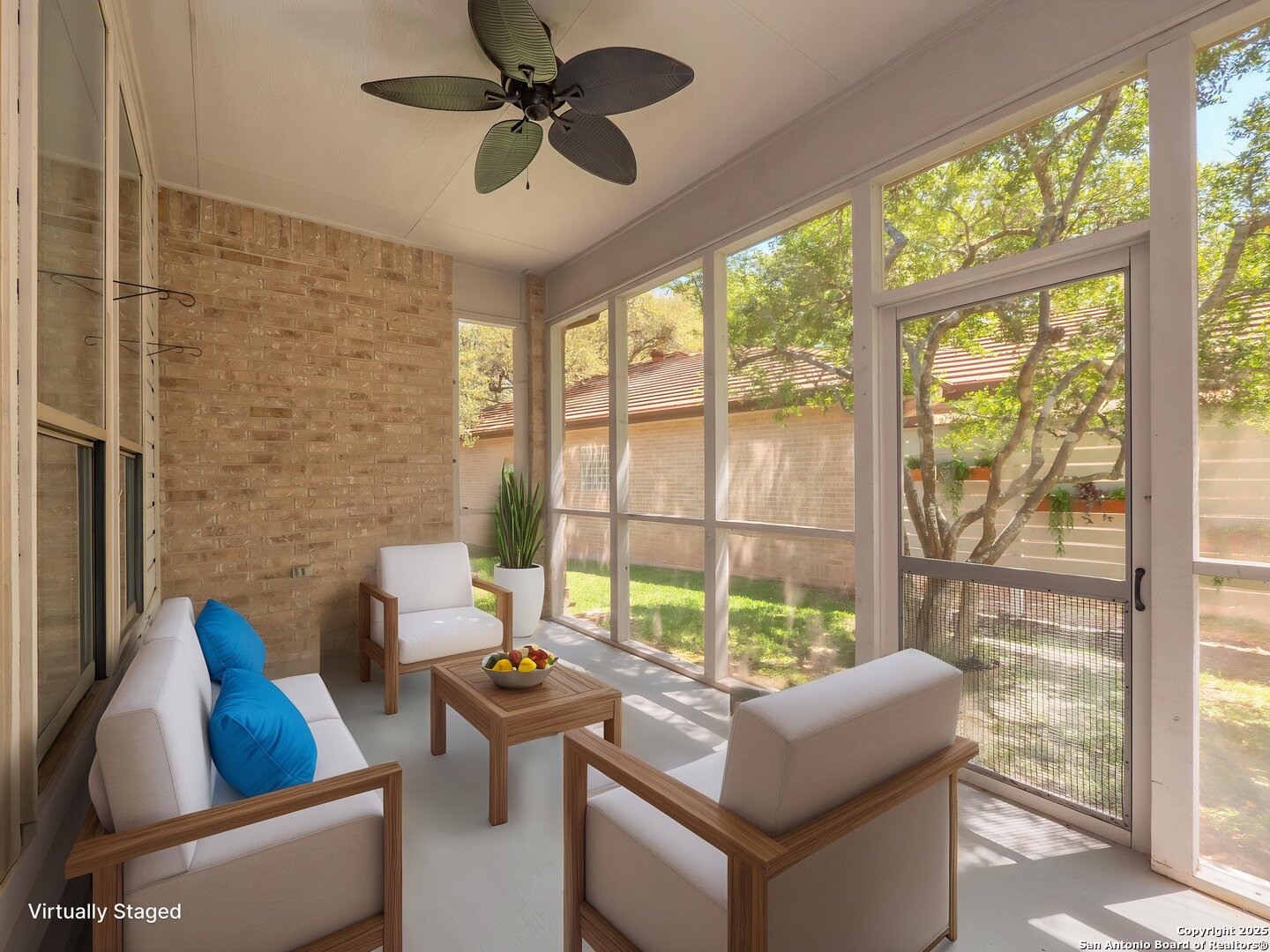 Nestled next to the prestigious Fair Oaks Ranch Country Club, this beautifully maintained 3-bedroom, 2-bathroom garden home offers the perfect blend of comfort, convenience, and style. With 2,179 sq. ft. of living space on a low-maintenance 0.18-acre lot in a sought-after zero-lot-line neighborhood, this one-story gem is designed for modern living. This home features a cozy living room with a fireplace and crown molding, which flows seamlessly into a separate dining room with elegant crown molding as well. The kitchen boasts granite countertops, a tiled backsplash, and an eat-in breakfast bar, making it perfect for both casual meals and entertaining. The flooring in the living room, office, kitchen, dining room, and hallway is luxury vinyl plank, combining beauty with practicality. The oversized primary suite is a true retreat, offering ample space and an ensuite bathroom. This bathroom features dual vanities, a garden tub, a separate walk-in shower, and a massive walk-in closet with organized shelving, plus a secondary closet for even more storage. The baths and utility rooms are finished with stylish wood-look tile, adding a modern touch to the space. Step outside to the covered, screened patio with a ceiling fan, perfect for enjoying the outdoors in comfort. The home has been meticulously maintained, with fresh interior paint and newer appliances throughout. It is move-in ready and includes an owned water softener for added convenience. With the AC unit replaced in 2022 and the water heater in 2023, you can rest assured that the home is in excellent condition. The home is part of two HOAs, totaling $1,500 per year, with lawn maintenance included for ease of living. The community is also golf cart friendly, allowing you to conveniently cruise around the neighborhood or to the nearby country club in your golf cart. Situated in a prime location, you'll have access to the exclusive Fair Oaks Ranch Country Club (membership required), where you can enjoy world-class amenities. This property is also within reach of highly acclaimed Boerne schools and close to premier shopping destinations like The Rim and La Cantera. Additionally, it is a short drive to USAA and UTSA, making this the ideal location for leisure and convenience. Come experience the lifestyle you've always dreamed of at the Ranch-where luxury, tranquility, and convenience meet. Schedule your showing today!