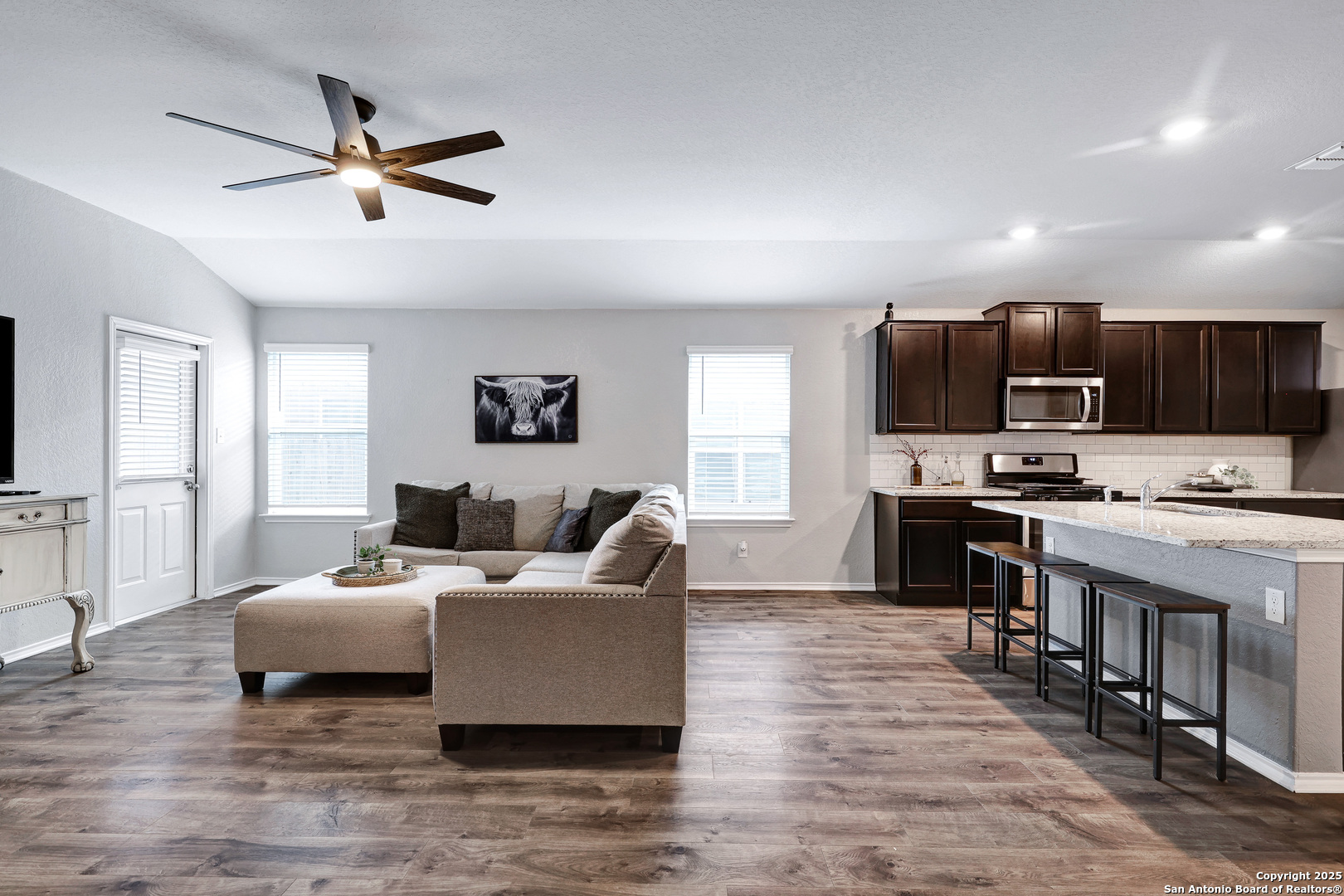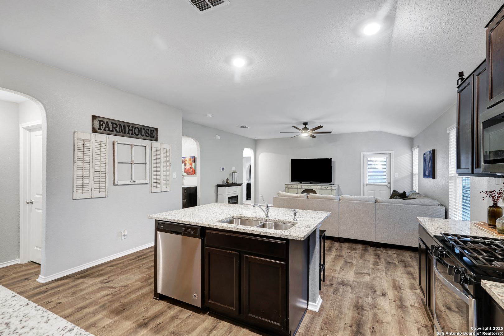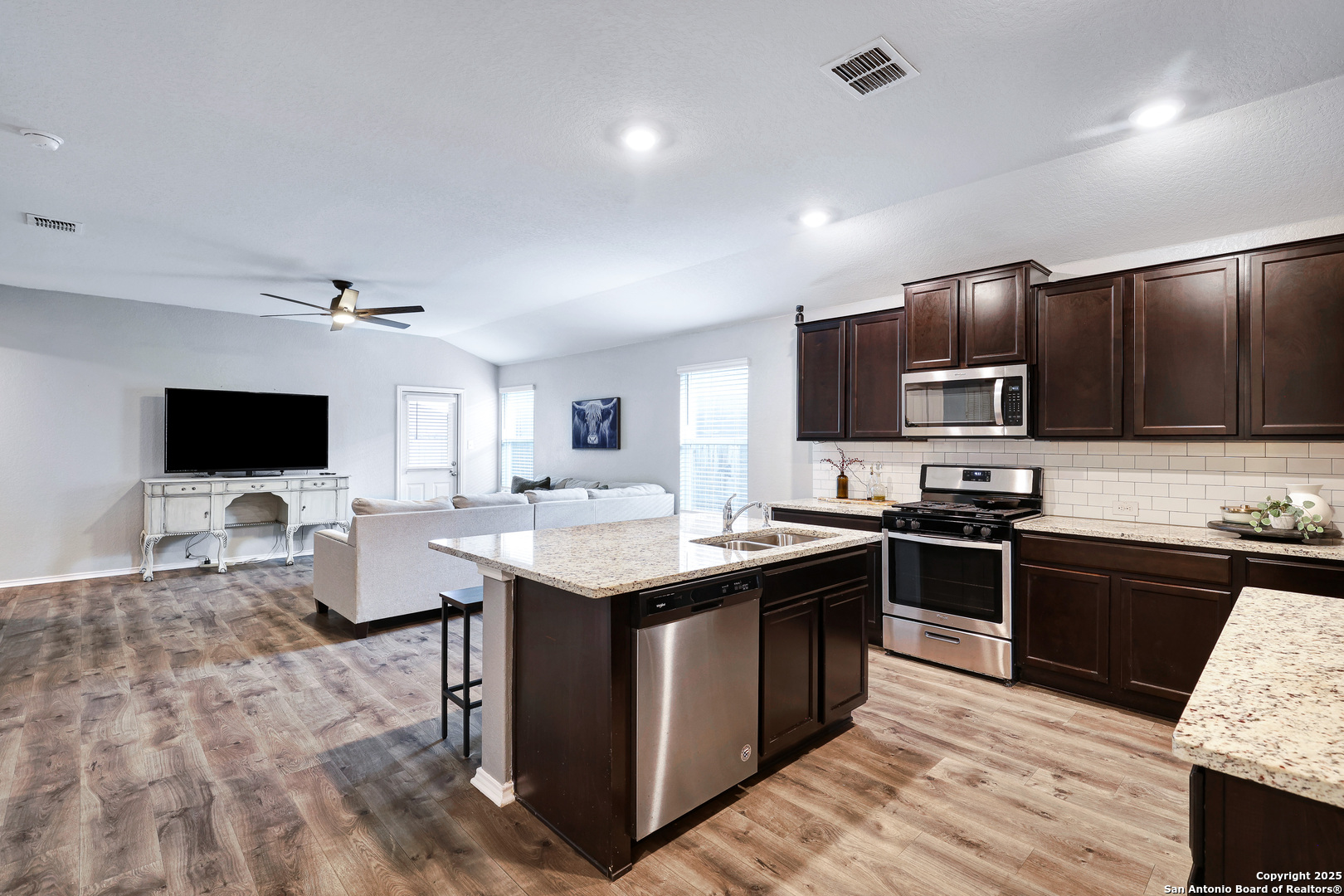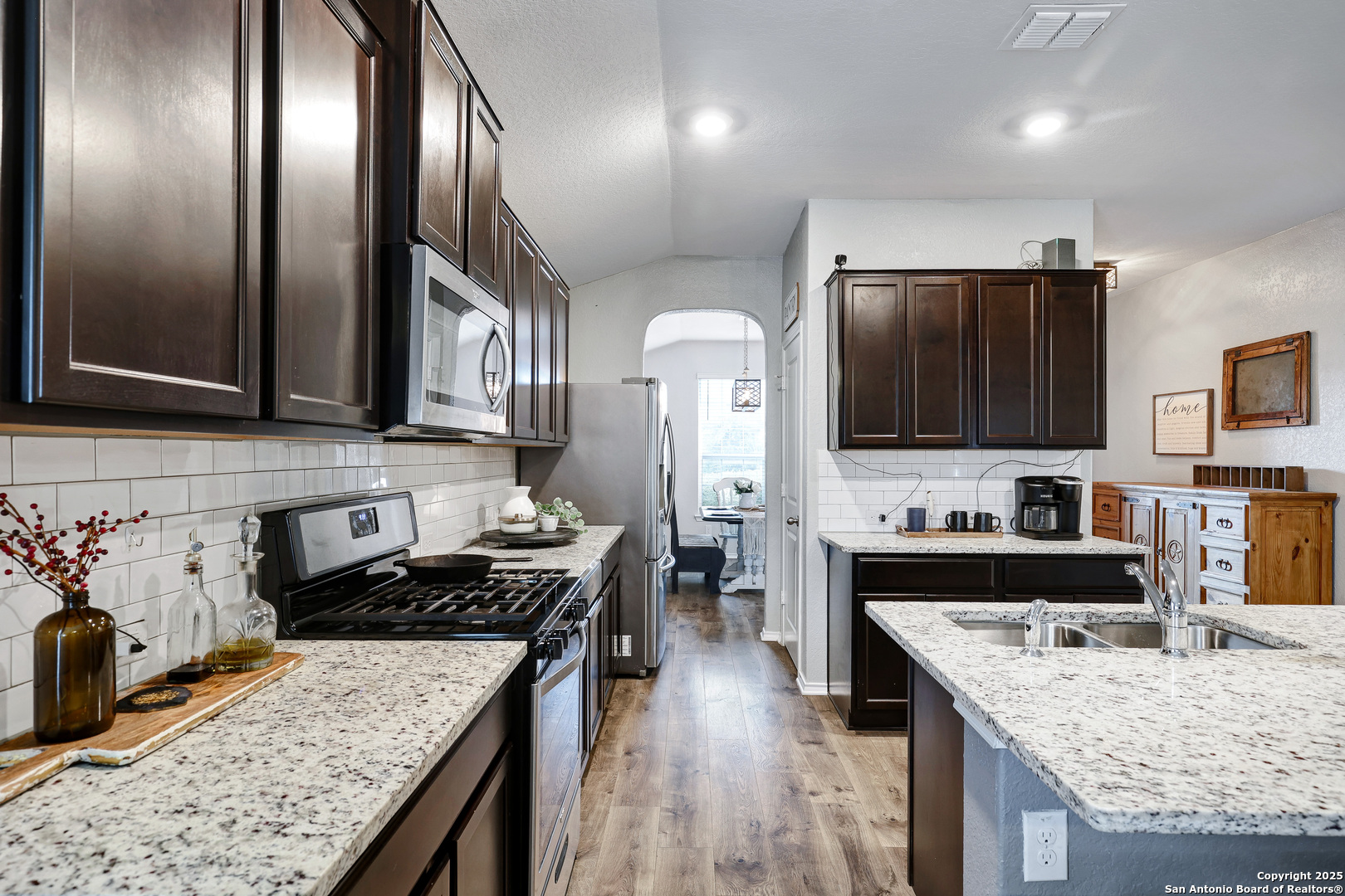 This charming 3bedroom, 2bath home offers both style & functionality. The versatile formal dining room can easily serve as a home office, creating flexibility to fit your needs. Designed w/ an open floor plan, this home boasts luxury vinyl flooring throughout the main living areas, blending durability w/ modern appeal. The kitchen is the heart of the home, featuring a large breakfast bar, granite countertops, stainless steel appliances, & gas cooking. The private primary suite is separate from the secondary bedrooms & includes a walk-in shower, a soaking garden tub, double vanity & walk-in closet. Enjoy the benefits of a vibrant community w/ access to a neighborhood pool, splash pad, & playground!