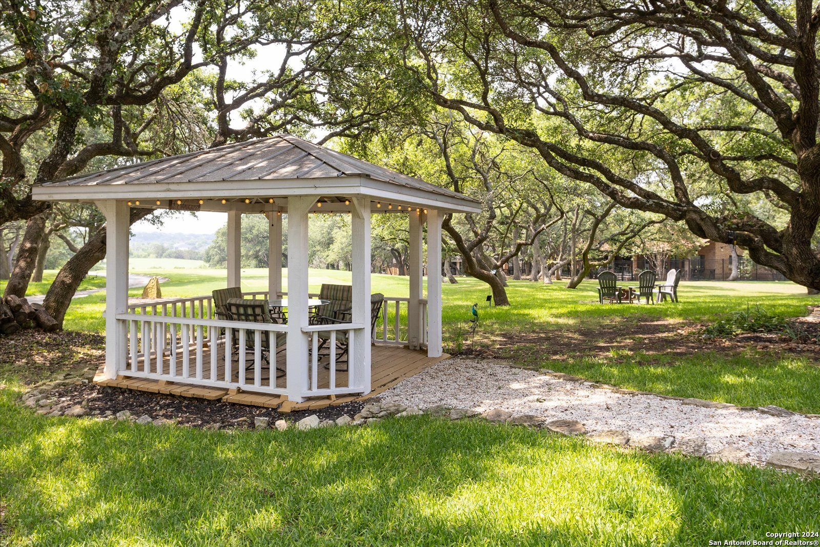 Well known curb appeal on this 5 bedroom Southern charmer located on a 1/2 acre golf course lot Fair Oaks Ranch. Boasting exceptional views of 3 different holes on the Live Oak course. A short walk to the country club, pools, & fitness center, this is an ideal location and easy commute to SA or Boerne. This traditional floor plan has inviting & separate spaces with plenty of room for comfortable living & entertaining. Lots of outdoor living options with both downstairs & upstairs full-length front porches, the exceptional back porch overlooking the #8 tee box & beyond, as well as the beautiful backyard gazebo. Interior spaces offer 2 fireplaces, 2 large dining areas, living room and family room, primary on main level, with 4 bedrooms & 2 baths upstairs. A huge walk-in attic that could easily be converted to additional square footage, whether it be a media room, play room, art studio, or fitness. Attached workshop accessed through garage contains an oversized heated/cooled utility room. Formal dining could be utilized as a study, as originally designed. 2-Car Garage with additional golf cart garage. Invisible fencing around entire perimeter of property, also room for fencing in backyard, as well as room for a pool!