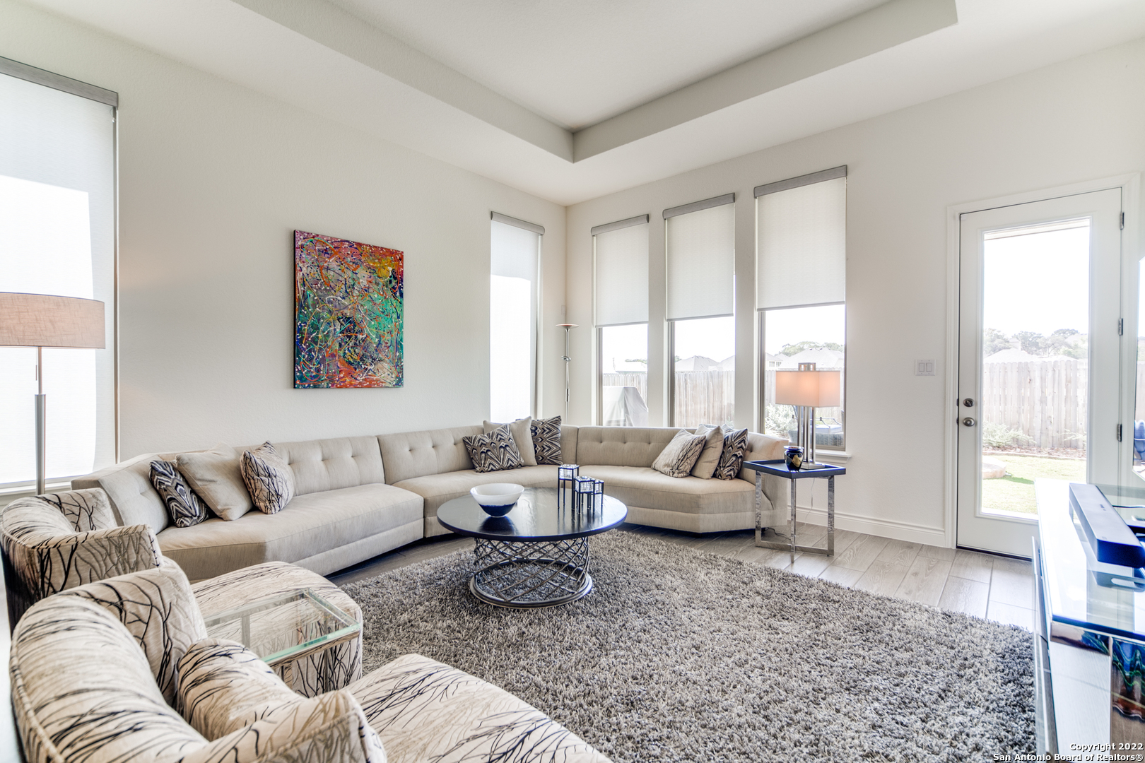 SHOWS LIKE A MODEL! Stunning one-story contemporary/transitional home located in a wonderful neighborhood convenient to both Boerne and San Antonio. This lightly lived-In home offers numerous upgrades, including an Aprilaire air purification system, upgraded tile and flooring throughout, and automatic controls on all window coverings. A private office and spacious hallway lead to an open-concept living area featuring an Island breakfast bar-perfect for everyday living and entertaining. Enjoy the beautifully designed outdoor fire pit and professionally landscaped yard. Located in the award-winning Boerne ISO, Ideal for a growing family. Just minutes from H-E-8, shopping, and dining, and situated in the highly desirable Fair Oaks Ranch area. Golf and other amenities are nearby at Fair Oaks Ranch Country Club (membership required). This exceptional home truly has it all - come see it to believe it!