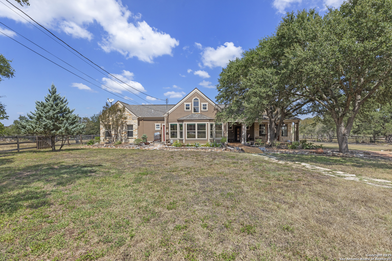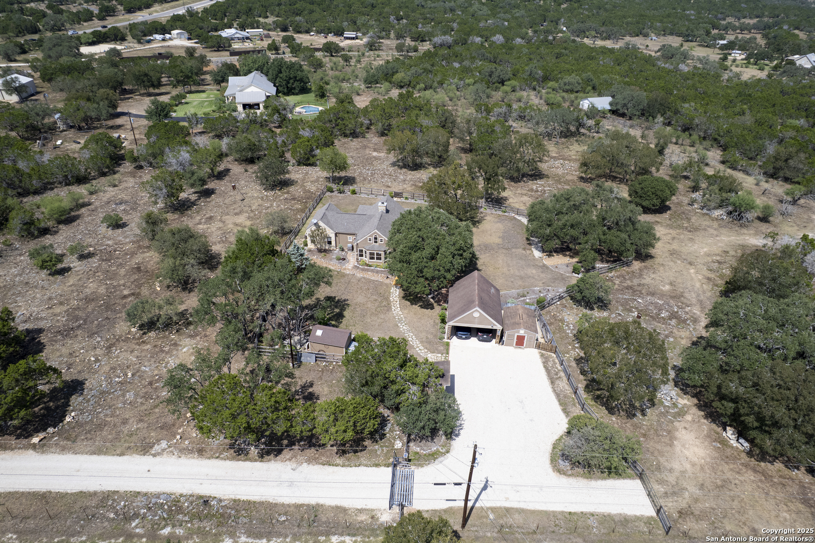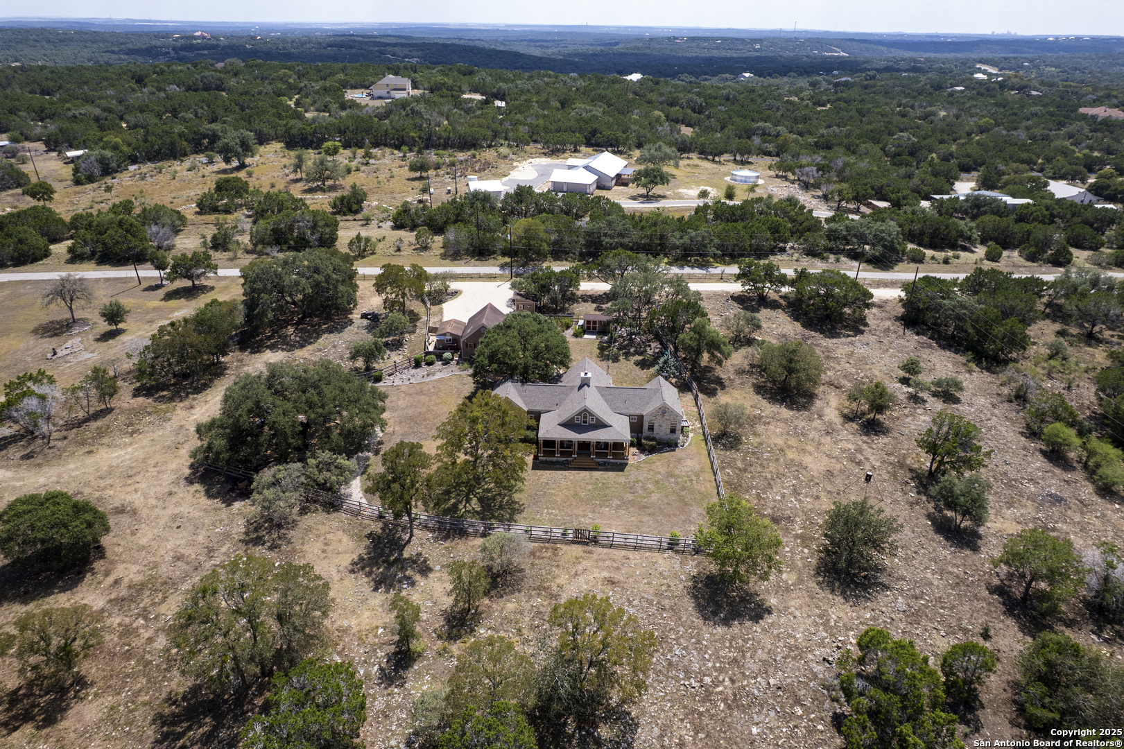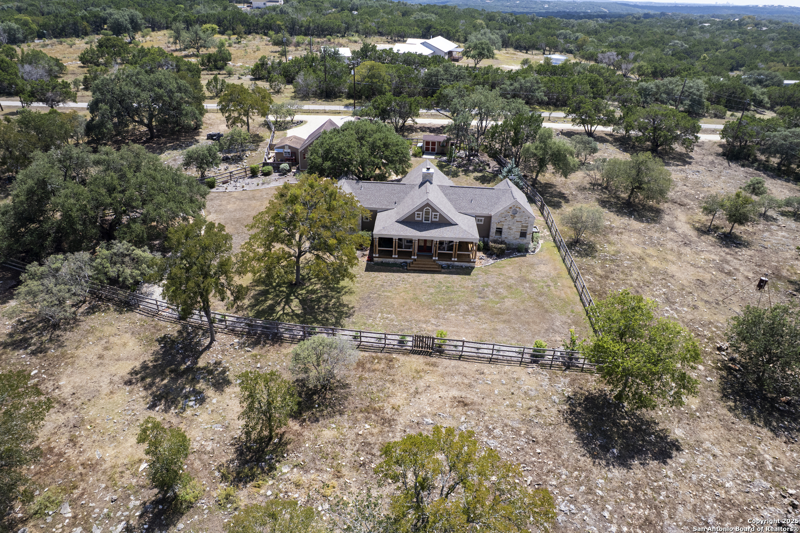 Welcome to this serene Hill Country ranch-style home, nestled on a peaceful 5.33-acre estate in New Braunfels, and with no HOA. Thoughtfully positioned at the center of the lot, this single-story, 3-bedroom, 2-bathroom home offers 2,087 square feet of bright, open living space surrounded by nature - the perfect blend of comfort, privacy, and rural charm. Step inside and you'll immediately notice the abundance of natural light pouring through panoramic double-pane windows in every room - offering stunning 360 views of the property. The spacious living room is warm and welcoming, with a vaulted ceiling, engineered hardwood floors and a striking stone fireplace that anchors the space. The island kitchen includes Vicostone Quartz counters, eat-in dining area, and views of the backyard, while the primary suite is a private retreat - featuring patio access, vaulted ceilings, a walk-in closet, and an ensuite bath with dual vanity areas and a recently updated walk-in shower. Two additional bedrooms, a walk-in pantry, laundry room, and storage area complete the layout, all with abundant windows and views of the outdoors. Outside, enjoy the wraparound front porch and covered back patio, or take a moment to relax on the secluded stone sitting area, tucked under a massive oak tree - a beautiful place to gather and relax with family and friends. The one-acre homestead includes both the 1/2-acre (.2 mile) chip-sealed driveway and the 1/2-acre fenced home site, which is beautifully landscaped with native plants and mature trees. The remaining 4.33 acres consist of open pasture currently leased to a neighboring rancher for grazing their longhorn cattle and mules - allowing you to maintain the agricultural exemption on that portion of the land and benefit from reduced property taxes. Nature lovers will appreciate frequent visits from deer, foxes, wild turkeys, rabbits, roadrunners, and even peacocks. In spring, the landscape comes alive with wildflowers, and sunsets here are nothing short of magical. Additional exterior features include: detached 2-car carport with large storage rooms on either side, workshop shed with electricity, expanded garden shed & well house, LED lighting, new attic storage above carport, private well and septic system, and chip-and-seal driveway (approx. 0.2 mi) with dual electronic gates for added privacy and convenience. While this home feels like a true countryside escape, you're just minutes away from retail, restaurants, grocery stores, medical facilities, and entertainment. It's the best of both worlds - peaceful and secluded, yet close to everything you need.