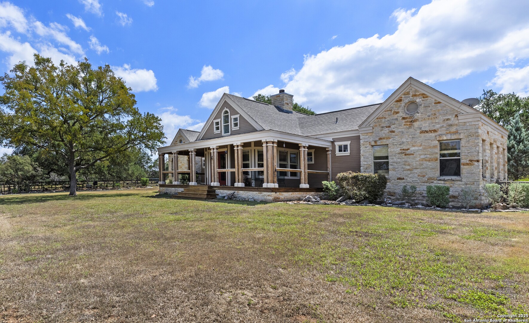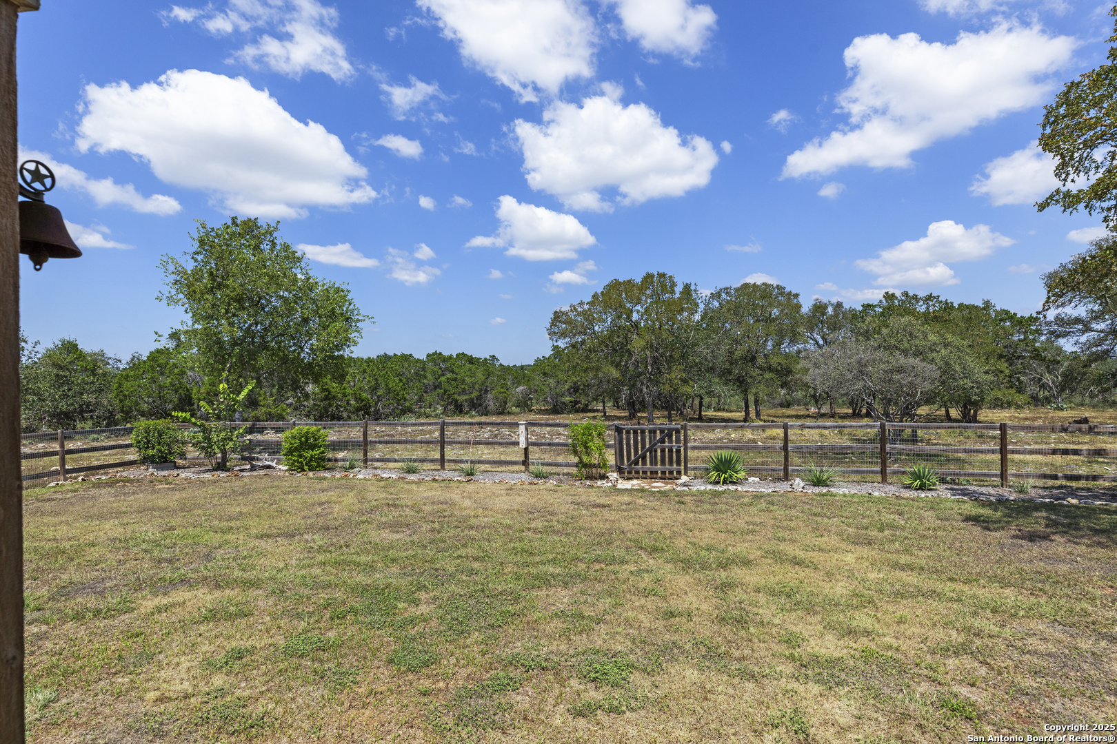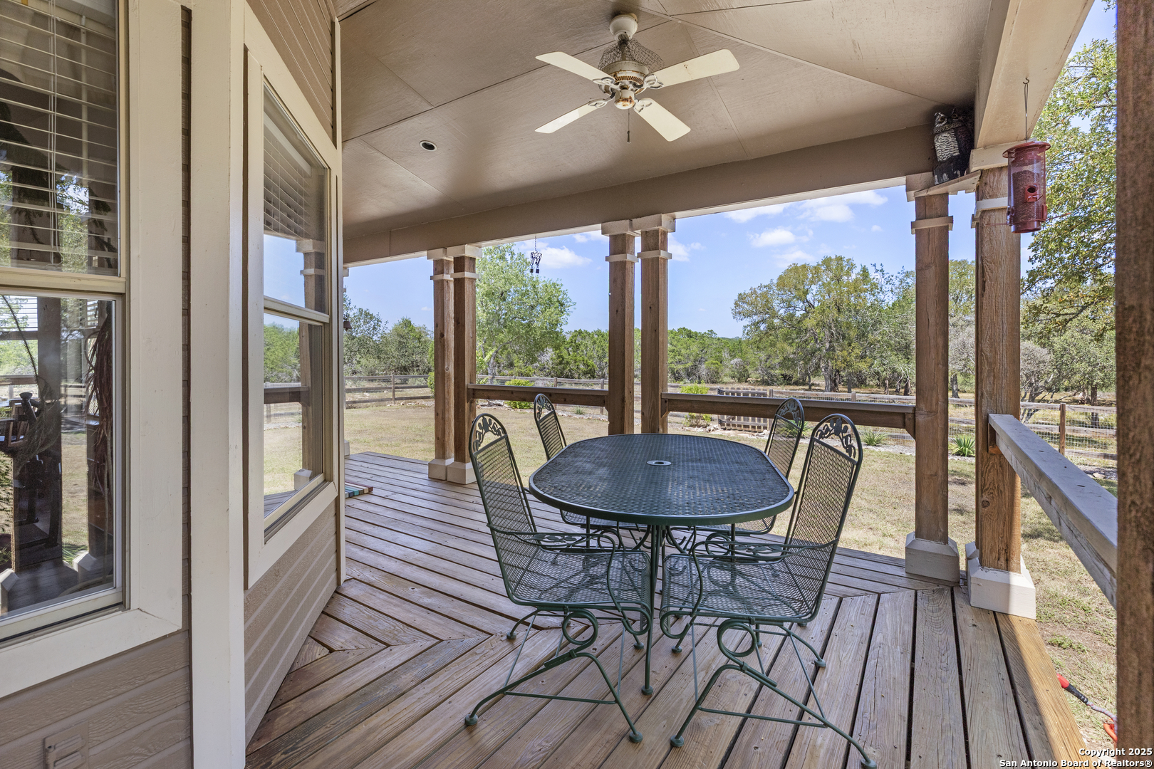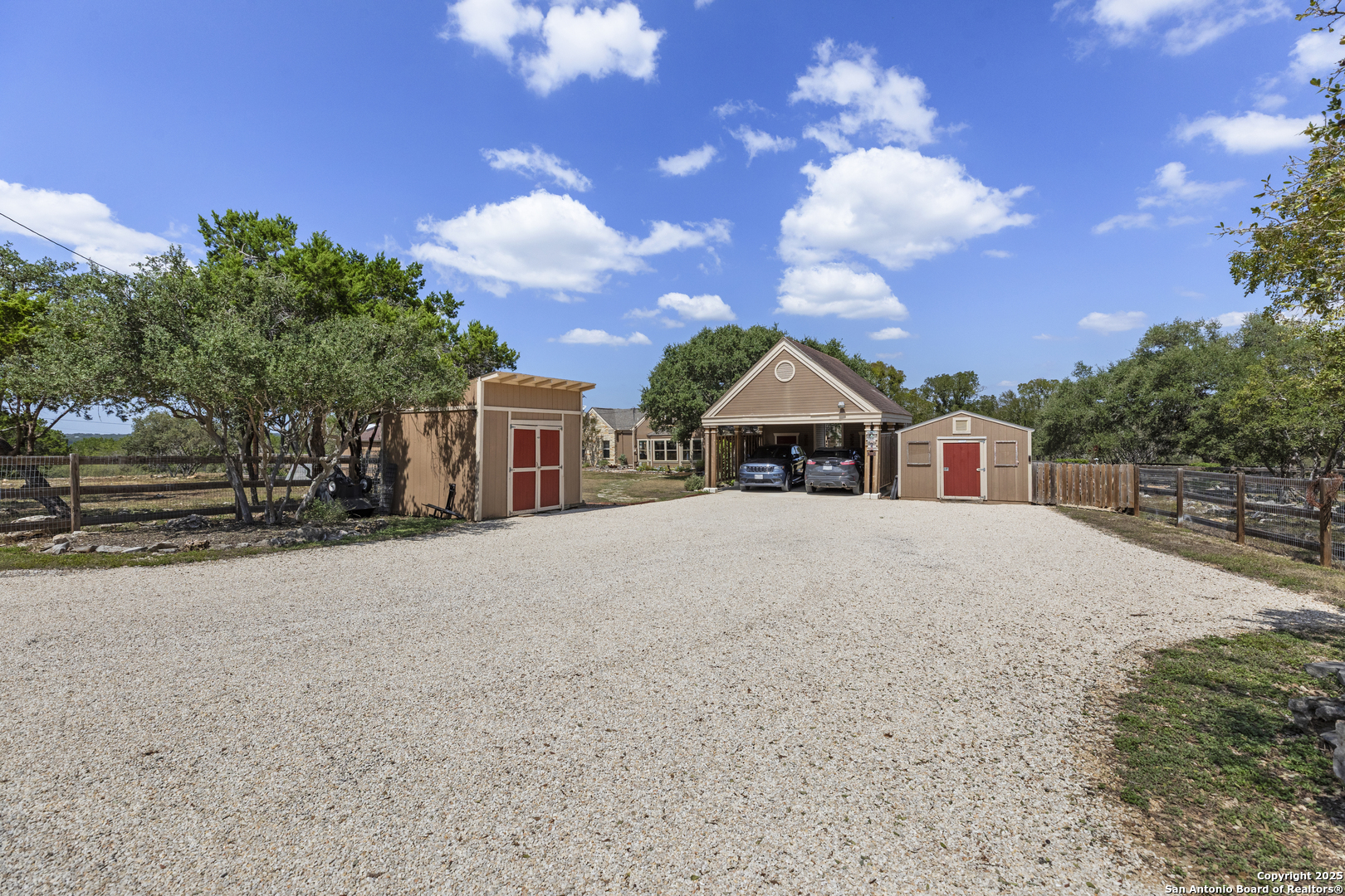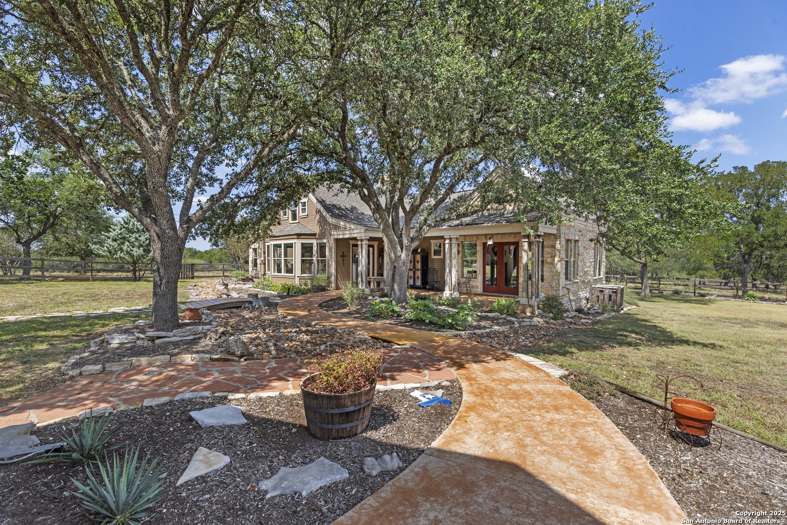 Welcome to this serene Hill Country ranch-style home, nestled on a peaceful 5.33-acre estate in New Braunfels, and with no HOA. Thoughtfully positioned at the center of the lot, this single-story, 3-bedroom, 2-bathroom home offers 2,087 square feet of bright, open living space surrounded by nature - the perfect blend of comfort, privacy, and rural charm. Step inside and you'll immediately notice the abundance of natural light pouring through panoramic double-pane windows in every room - offering stunning 360 views of the property. The spacious living room is warm and welcoming, with a vaulted ceiling, engineered hardwood floors and a striking stone fireplace that anchors the space. The island kitchen includes Vicostone Quartz counters, eat-in dining area, and views of the backyard, while the primary suite is a private retreat - featuring patio access, vaulted ceilings, a walk-in closet, and an ensuite bath with dual vanity areas and a recently updated walk-in shower. Two additional bedrooms, a walk-in pantry, laundry room, and storage area complete the layout, all with abundant windows and views of the outdoors. Outside, enjoy the wraparound front porch and covered back patio, or take a moment to relax on the secluded stone sitting area, tucked under a massive oak tree - a beautiful place to gather and relax with family and friends. The one-acre homestead includes both the 1/2-acre (.2 mile) chip-sealed driveway and the 1/2-acre fenced home site, which is beautifully landscaped with native plants and mature trees. The remaining 4.33 acres consist of open pasture currently leased to a neighboring rancher for grazing their longhorn cattle and mules - allowing you to maintain the agricultural exemption on that portion of the land and benefit from reduced property taxes. Nature lovers will appreciate frequent visits from deer, foxes, wild turkeys, rabbits, roadrunners, and even peacocks. In spring, the landscape comes alive with wildflowers, and sunsets here are nothing short of magical. Additional exterior features include: detached 2-car carport with large storage rooms on either side, workshop shed with electricity, expanded garden shed & well house, LED lighting, new attic storage above carport, private well and septic system, and chip-and-seal driveway (approx. 0.2 mi) with dual electronic gates for added privacy and convenience. While this home feels like a true countryside escape, you're just minutes away from retail, restaurants, grocery stores, medical facilities, and entertainment. It's the best of both worlds - peaceful and secluded, yet close to everything you need.
