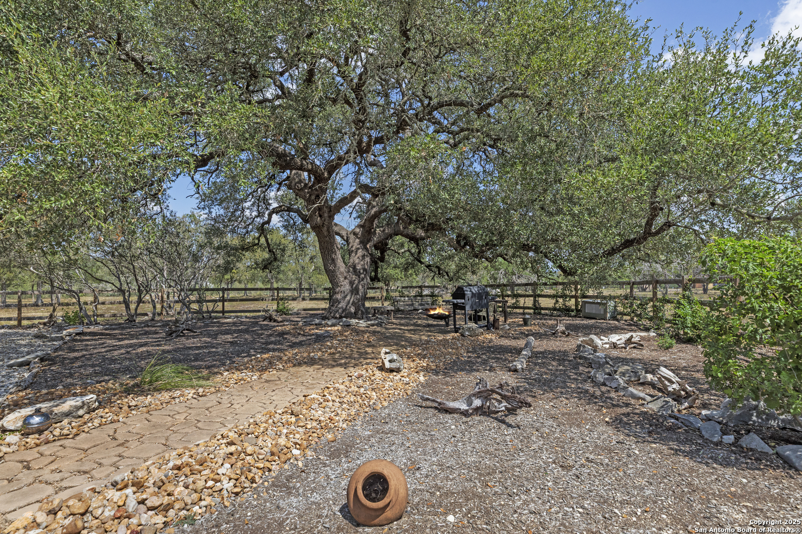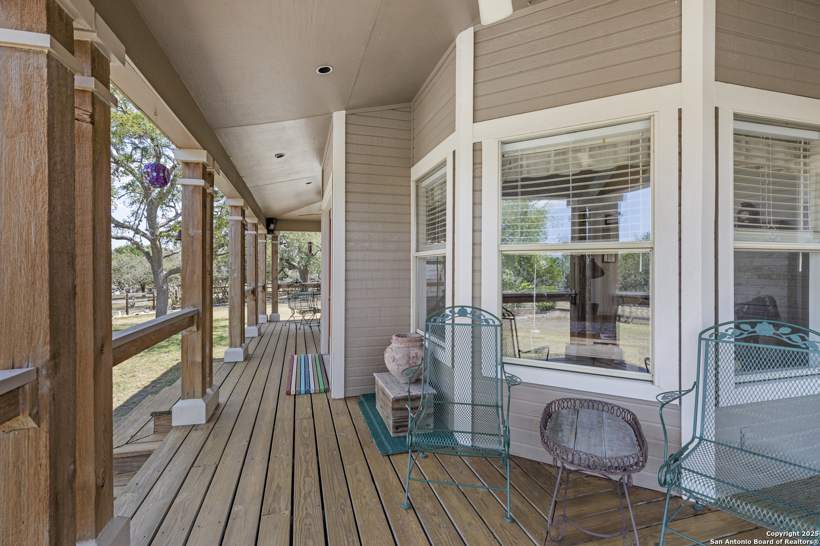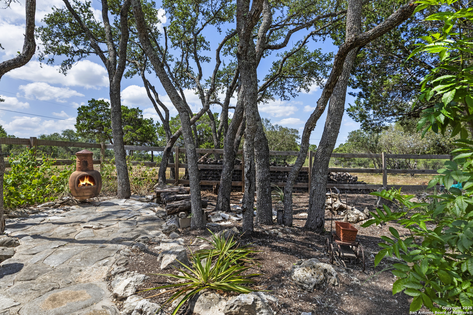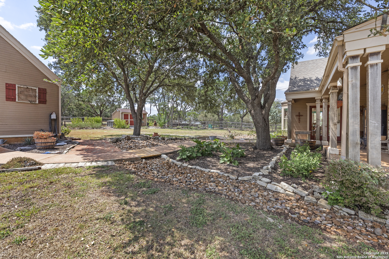 Welcome to this serene Hill Country ranch-style home, nestled on a peaceful 5.33-acre estate in New Braunfels, and with no HOA. Thoughtfully positioned at the center of the lot, this single-story, 3-bedroom, 2-bathroom home offers 2,087 square feet of bright, open living space surrounded by nature - the perfect blend of comfort, privacy, and rural charm. Step inside and you'll immediately notice the abundance of natural light pouring through panoramic double-pane windows in every room - offering stunning 360 views of the property. The spacious living room is warm and welcoming, with a vaulted ceiling, engineered hardwood floors and a striking stone fireplace that anchors the space. The island kitchen includes Vicostone Quartz counters, eat-in dining area, and views of the backyard, while the primary suite is a private retreat - featuring patio access, vaulted ceilings, a walk-in closet, and an ensuite bath with dual vanity areas and a recently updated walk-in shower. Two additional bedrooms, a walk-in pantry, laundry room, and storage area complete the layout, all with abundant windows and views of the outdoors. Outside, enjoy the wraparound front porch and covered back patio, or take a moment to relax on the secluded stone sitting area, tucked under a massive oak tree - a beautiful place to gather and relax with family and friends. The one-acre homestead includes both the 1/2-acre (.2 mile) chip-sealed driveway and the 1/2-acre fenced home site, which is beautifully landscaped with native plants and mature trees. The remaining 4.33 acres consist of open pasture currently leased to a neighboring rancher for grazing their longhorn cattle and mules - allowing you to maintain the agricultural exemption on that portion of the land and benefit from reduced property taxes. Nature lovers will appreciate frequent visits from deer, foxes, wild turkeys, rabbits, roadrunners, and even peacocks. In spring, the landscape comes alive with wildflowers, and sunsets here are nothing short of magical. Additional exterior features include: detached 2-car carport with large storage rooms on either side, workshop shed with electricity, expanded garden shed & well house, LED lighting, new attic storage above carport, private well and septic system, and chip-and-seal driveway (approx. 0.2 mi) with dual electronic gates for added privacy and convenience. While this home feels like a true countryside escape, you're just minutes away from retail, restaurants, grocery stores, medical facilities, and entertainment. It's the best of both worlds - peaceful and secluded, yet close to everything you need.