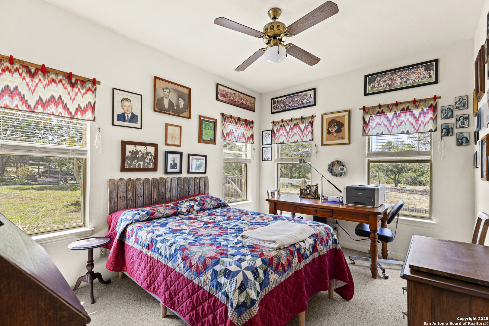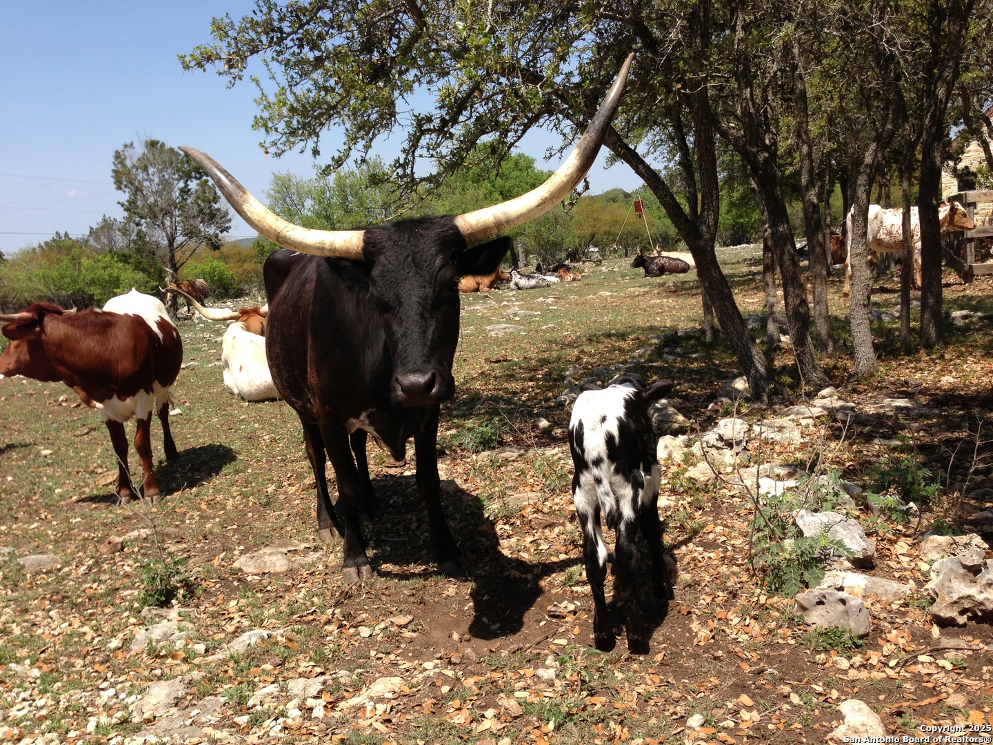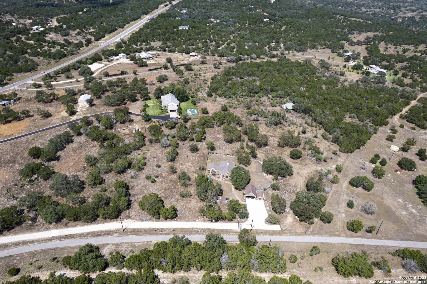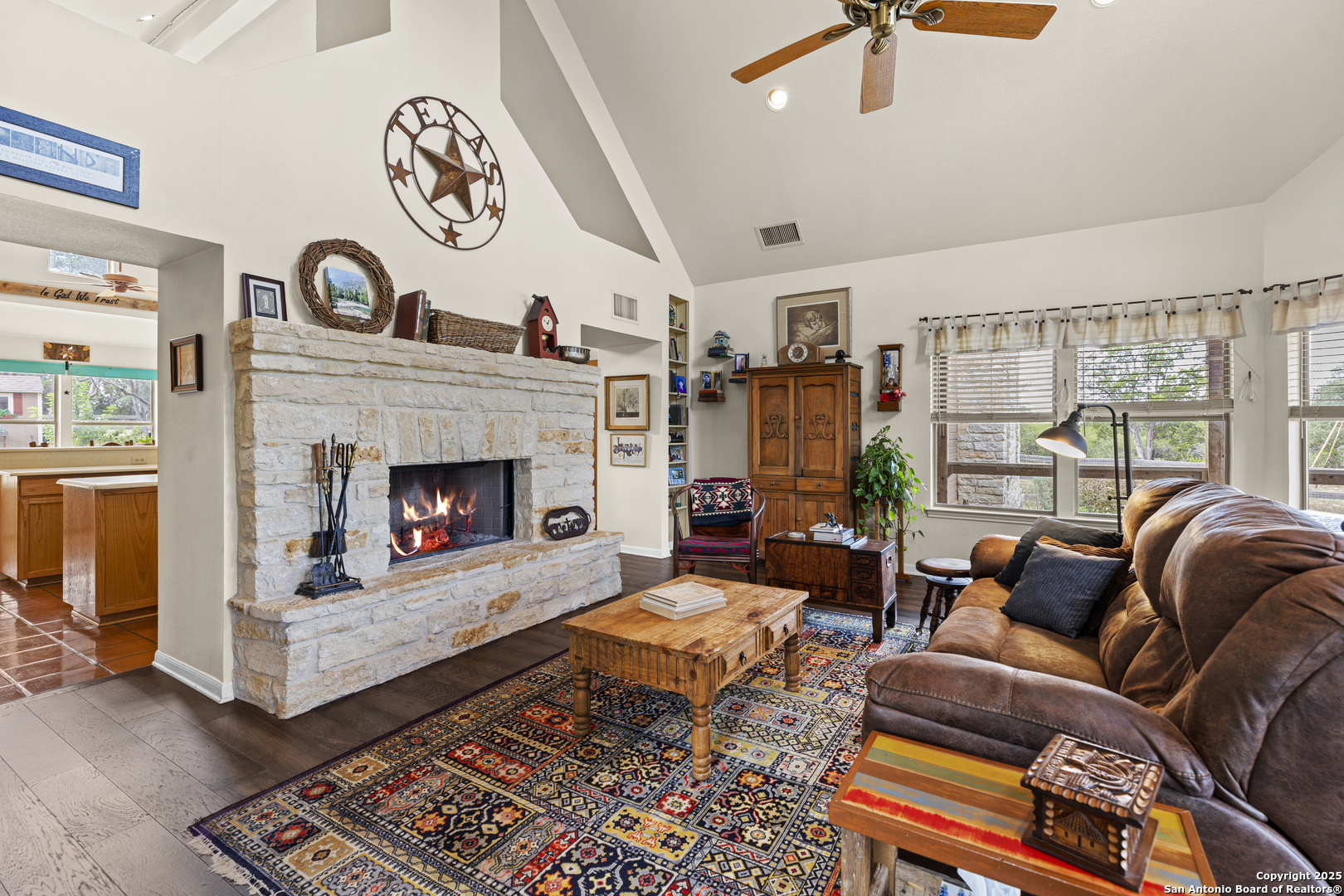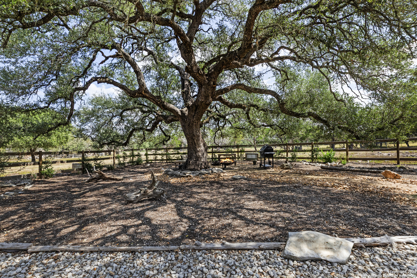 Welcome to this serene Hill Country ranch-style home, nestled on a peaceful 5.33-acre estate in New Braunfels, and with no HOA. Thoughtfully positioned at the center of the lot, this single-story, 3-bedroom, 2-bathroom home offers 2,087 square feet of bright, open living space surrounded by nature - the perfect blend of comfort, privacy, and rural charm. Step inside and you'll immediately notice the abundance of natural light pouring through panoramic double-pane windows in every room - offering stunning 360 views of the property. The spacious living room is warm and welcoming, with a vaulted ceiling, engineered hardwood floors and a striking stone fireplace that anchors the space. The island kitchen includes Vicostone Quartz counters, eat-in dining area, and views of the backyard, while the primary suite is a private retreat - featuring patio access, vaulted ceilings, a walk-in closet, and an ensuite bath with dual vanity areas and a recently updated walk-in shower. Two additional bedrooms, a walk-in pantry, laundry room, and storage area complete the layout, all with abundant windows and views of the outdoors. Outside, enjoy the wraparound front porch and covered back patio, or take a moment to relax on the secluded stone sitting area, tucked under a massive oak tree - a beautiful place to gather and relax with family and friends. The one-acre homestead includes both the 1/2-acre (.2 mile) chip-sealed driveway and the 1/2-acre fenced home site, which is beautifully landscaped with native plants and mature trees. The remaining 4.33 acres consist of open pasture currently leased to a neighboring rancher for grazing their longhorn cattle and mules - allowing you to maintain the agricultural exemption on that portion of the land and benefit from reduced property taxes. Nature lovers will appreciate frequent visits from deer, foxes, wild turkeys, rabbits, roadrunners, and even peacocks. In spring, the landscape comes alive with wildflowers, and sunsets here are nothing short of magical. Additional exterior features include: detached 2-car carport with large storage rooms on either side, workshop shed with electricity, expanded garden shed & well house, LED lighting, new attic storage above carport, private well and septic system, and chip-and-seal driveway (approx. 0.2 mi) with dual electronic gates for added privacy and convenience. While this home feels like a true countryside escape, you're just minutes away from retail, restaurants, grocery stores, medical facilities, and entertainment. It's the best of both worlds - peaceful and secluded, yet close to everything you need.