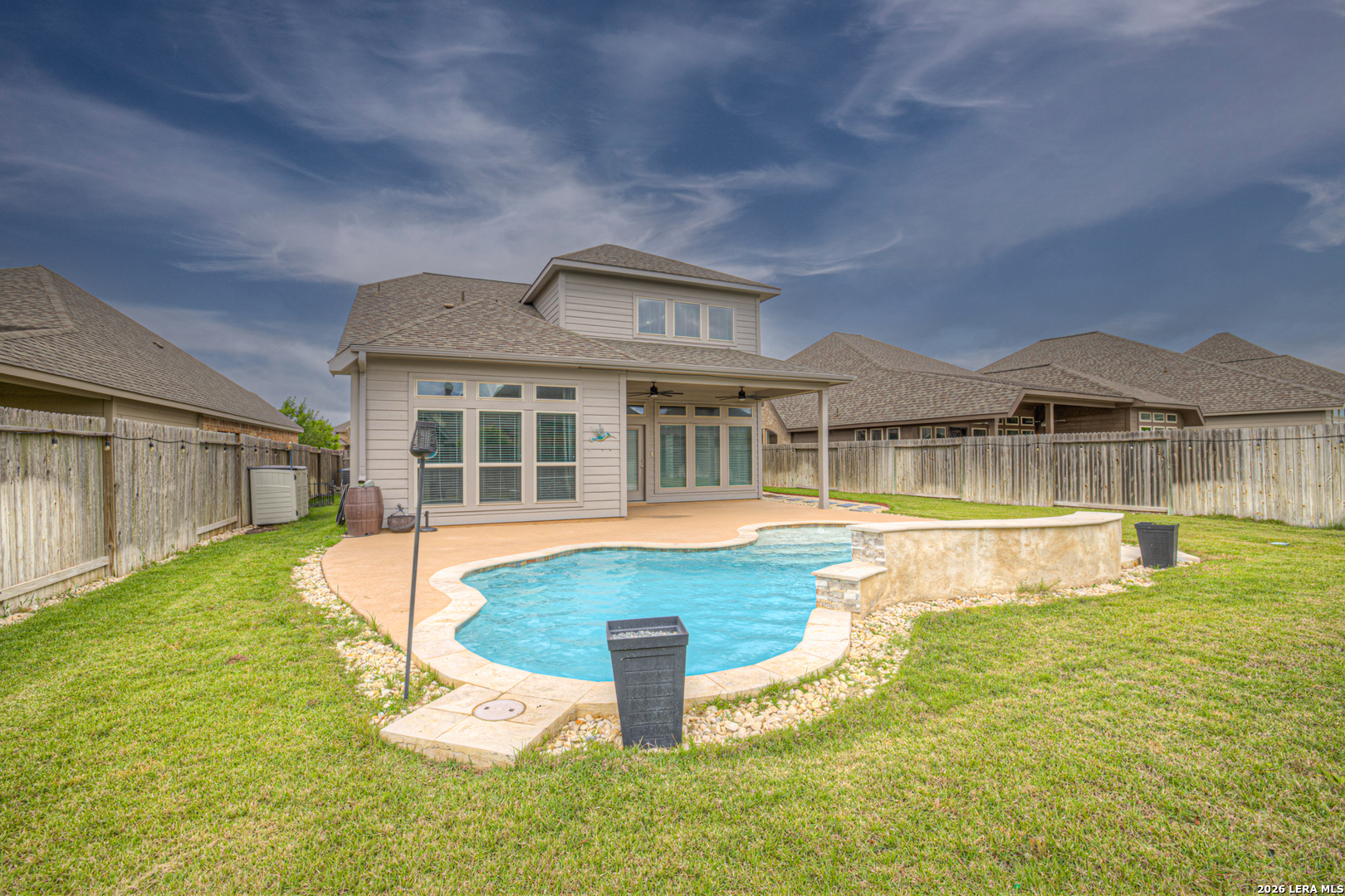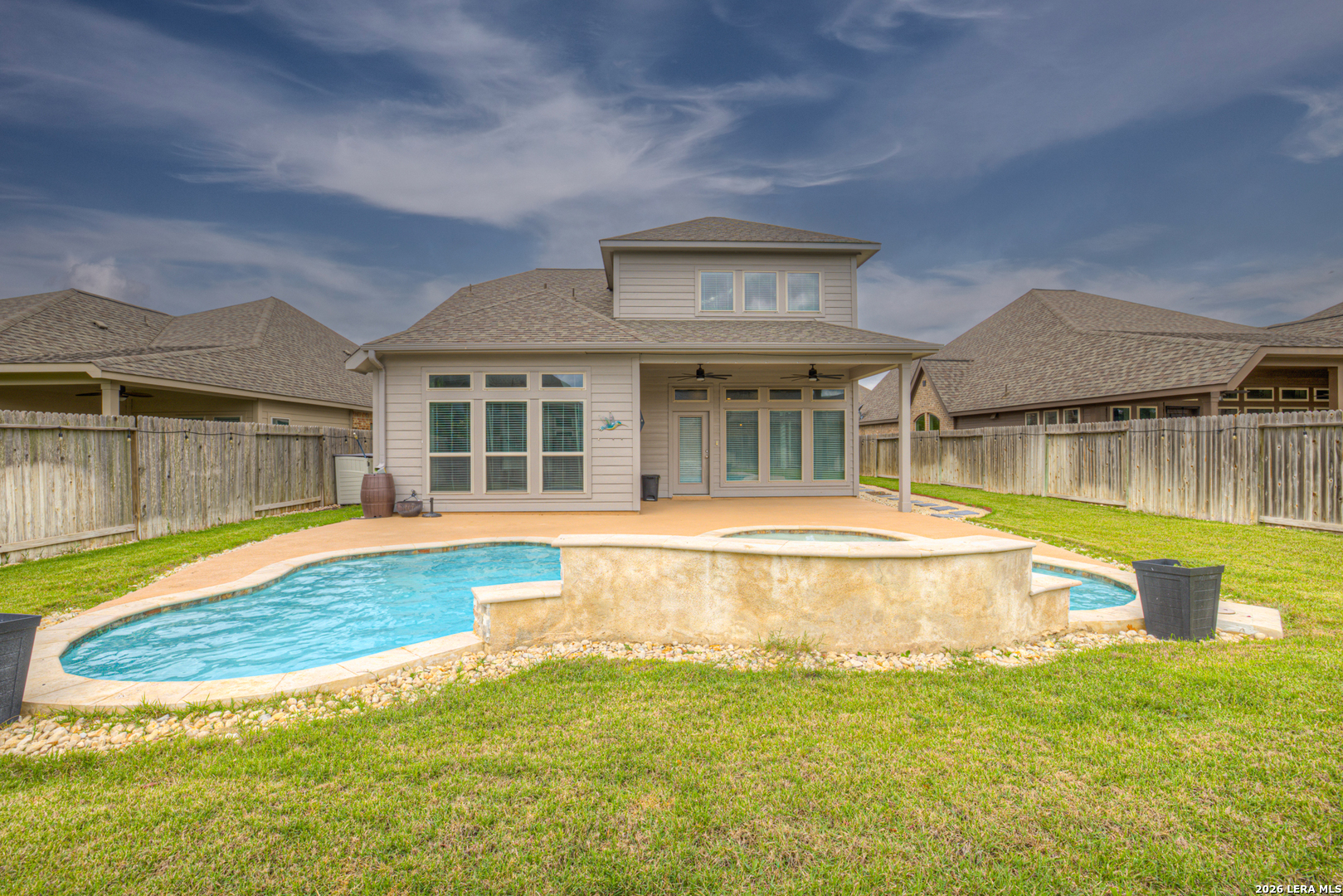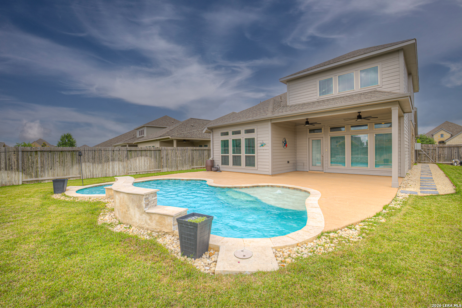 Welcome to this beautiful two-story home offering 4 bedrooms, 3 full baths, and a modern design that blends style with functionality. The thoughtfully designed layout features the primary suite and a secondary bedroom on the main floor, with a full bath conveniently located just outside the second bedroom-perfect for guests or multi-generational living. Upstairs, you'll find two additional bedrooms and the third full bathroom, along with a loft area that's ideal for a game room, or media area. A dedicated office on the main level provides the perfect work-from-home setup. The kitchen is both stylish and functional, featuring granite countertops, a center island, and a charming farmhouse sink-perfect for everyday living and entertaining alike. Step outside to your own private backyard retreat, complete with a large covered patio and an in-ground pool with waterfall feature-ideal for relaxing or hosting. Located in a great neighborhood perfect for families and zoned to the highly sought-after Navarro ISD, this home offers the perfect combination of comfort, convenience, and lifestyle. Don't miss your chance to make it yours!