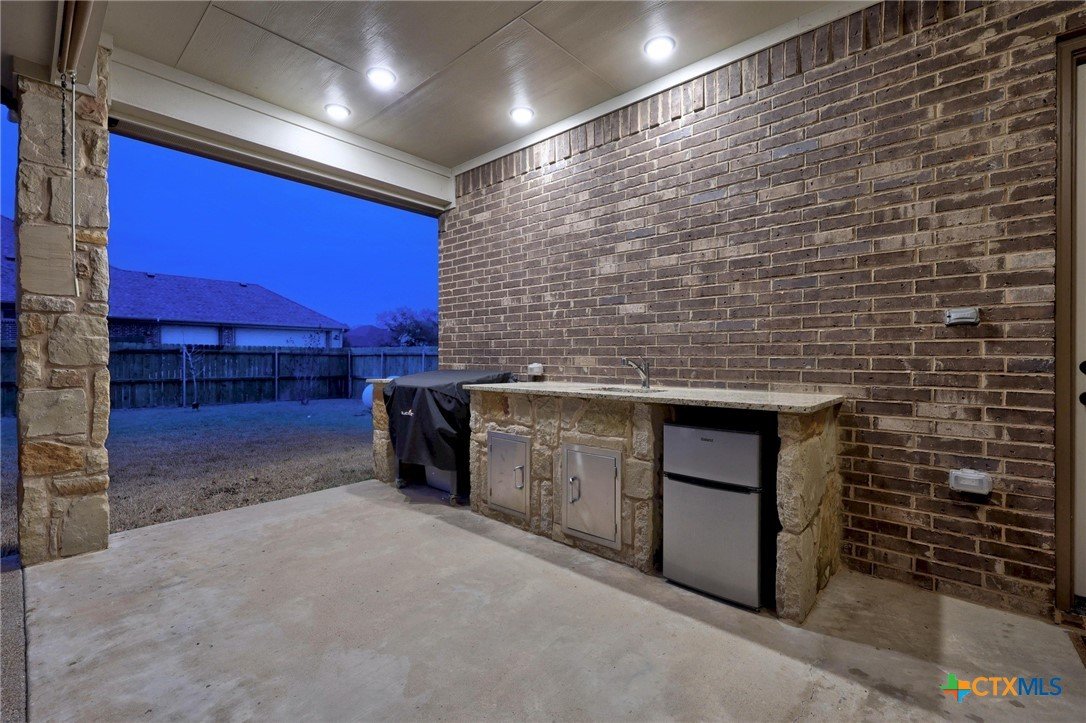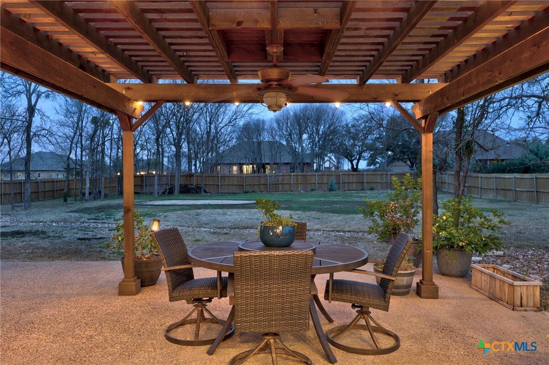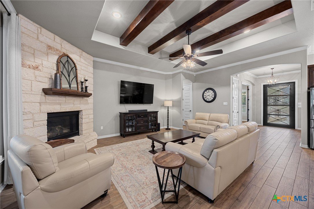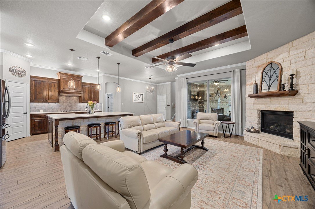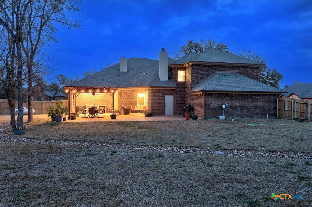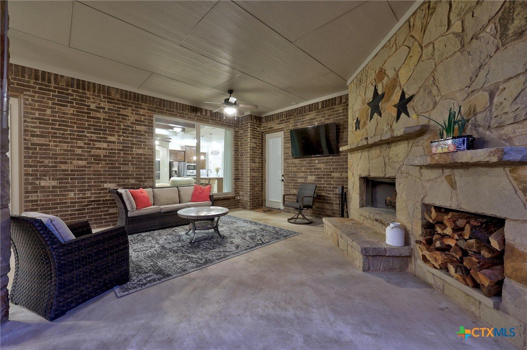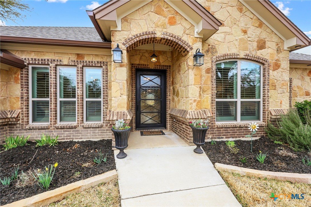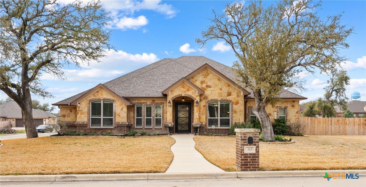 Welcome to your dream home! This stunning 5-bedroom, 3.5-bath house is a head-turner with its charming stone exterior and immense, towering oak trees adorning the entry. The modern interior boasts wood-like plank tile throughout, complemented by elegant plantation shutters. The ornate tray ceiling, graced with beautifully vaulted beams in the living room, creates an atmospheric setting for the limestone fireplace that serves as the room's stunning focal point. Large picture windows bathe the expansive open-layout living room in delightful natural light. The enticing chef's kitchen with a large island at its heart is perfect for honing your culinary skills or entertaining guests. The master bedroom is a true sanctuary, featuring a luxurious garden tub and convenient walk-in shower. Step outside and you will find an inviting outdoor living area; a large extended patio with its own stone fireplace. The expansive backyard provides ample space for all your outdoor endeavors. Just a short walk to the neighborhood pond/lake, walking trail, with convenient access to the lake Belton, shopping, and more!