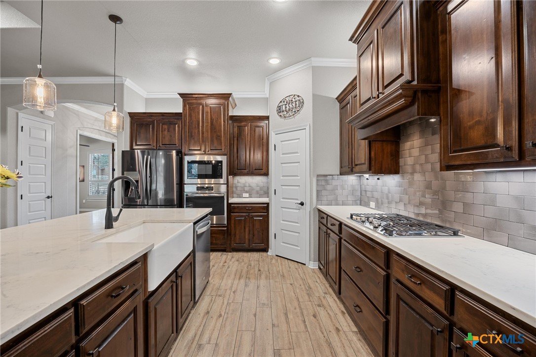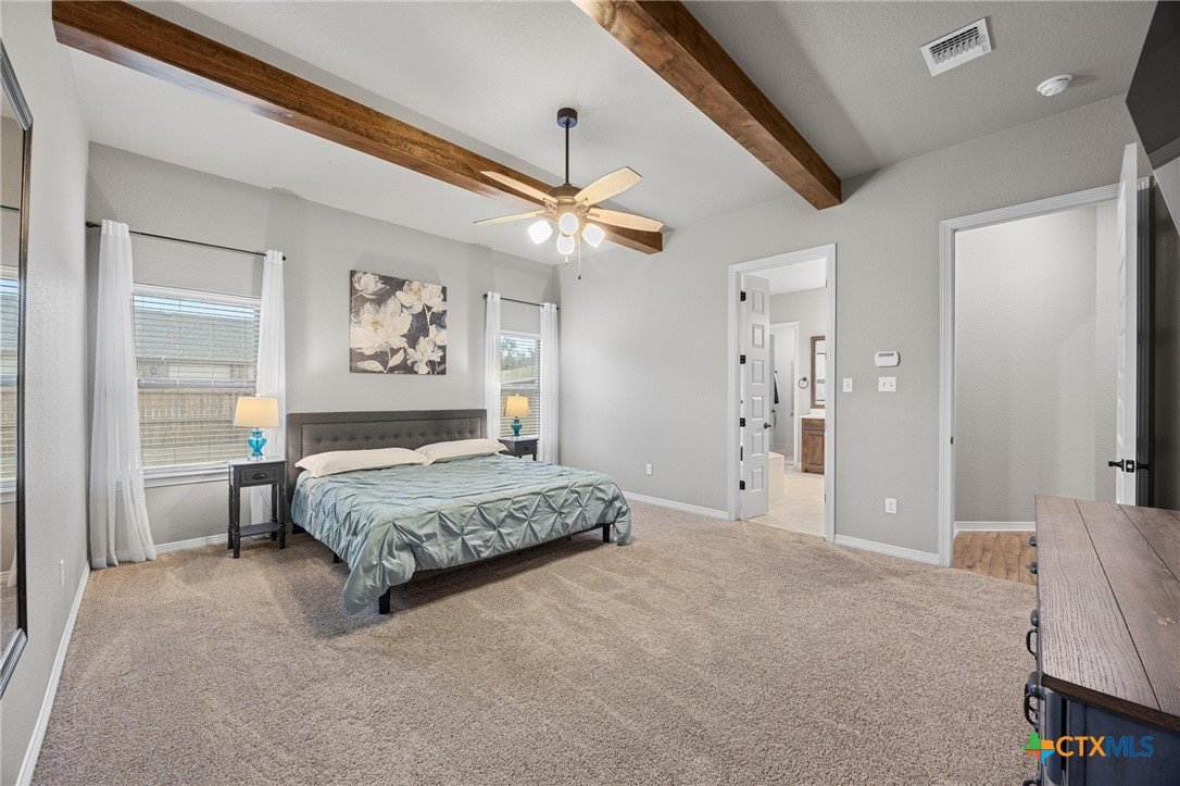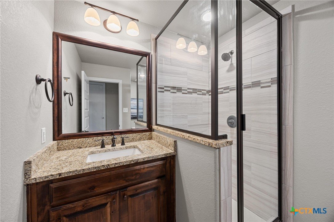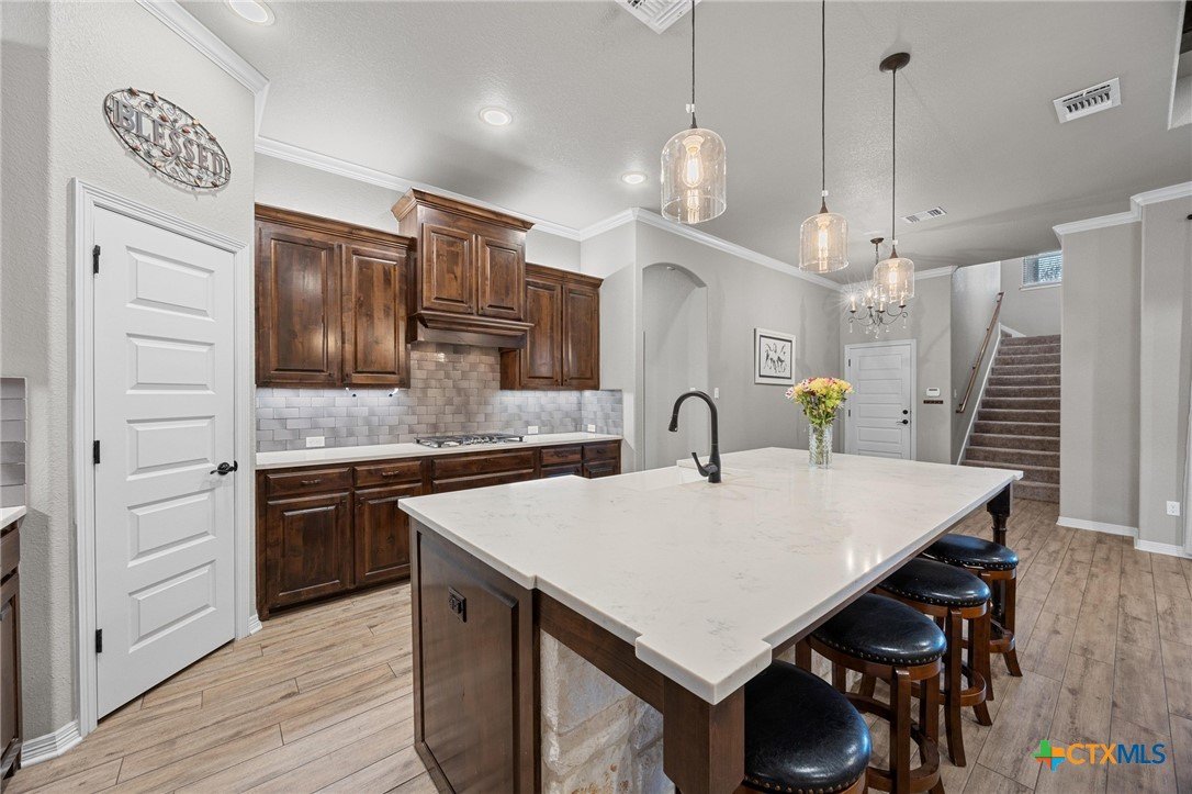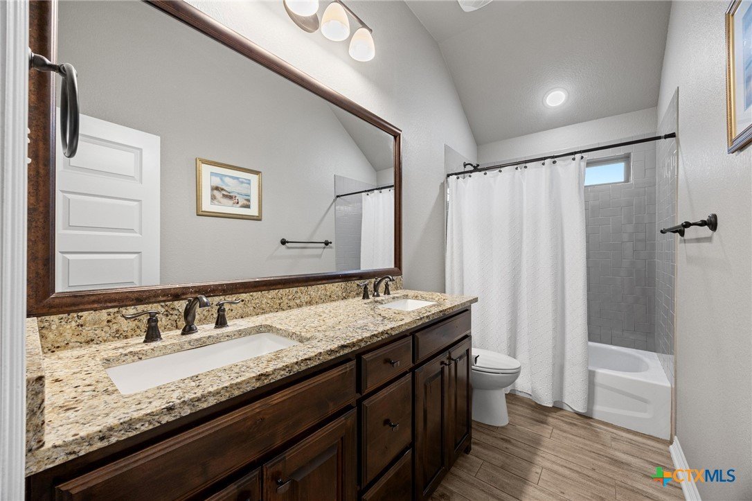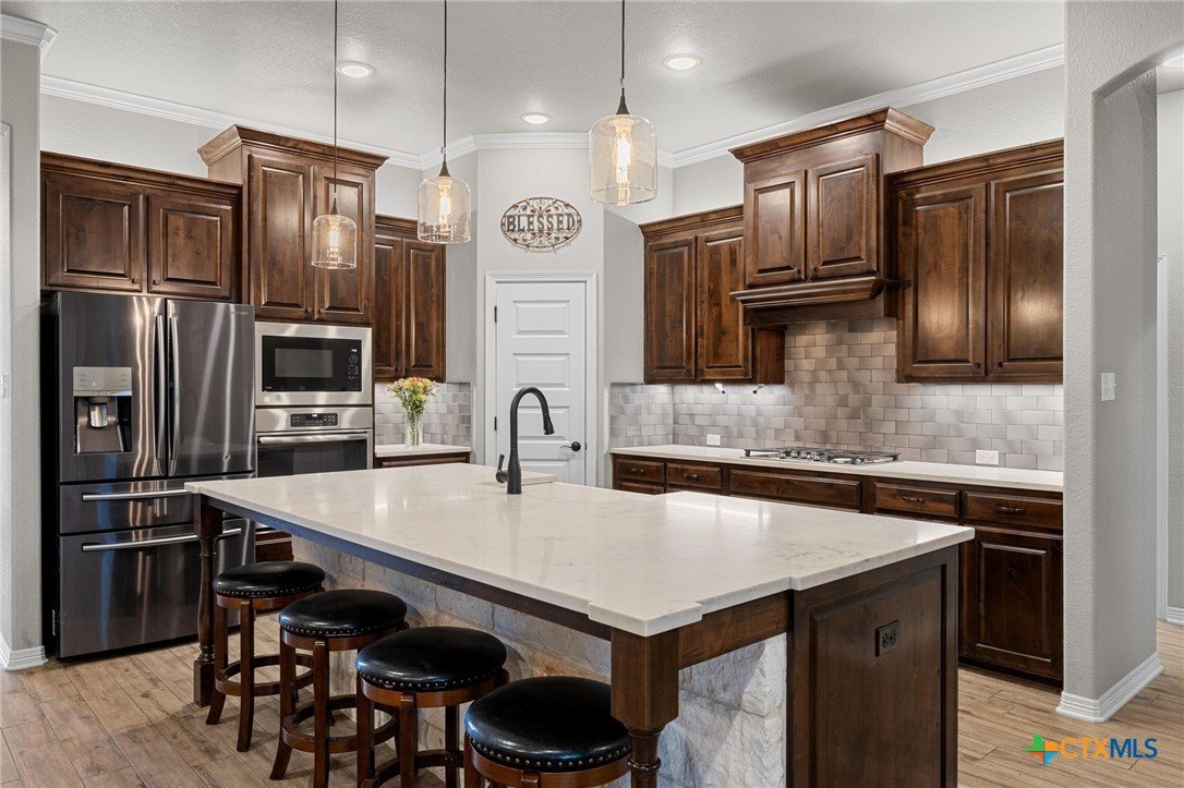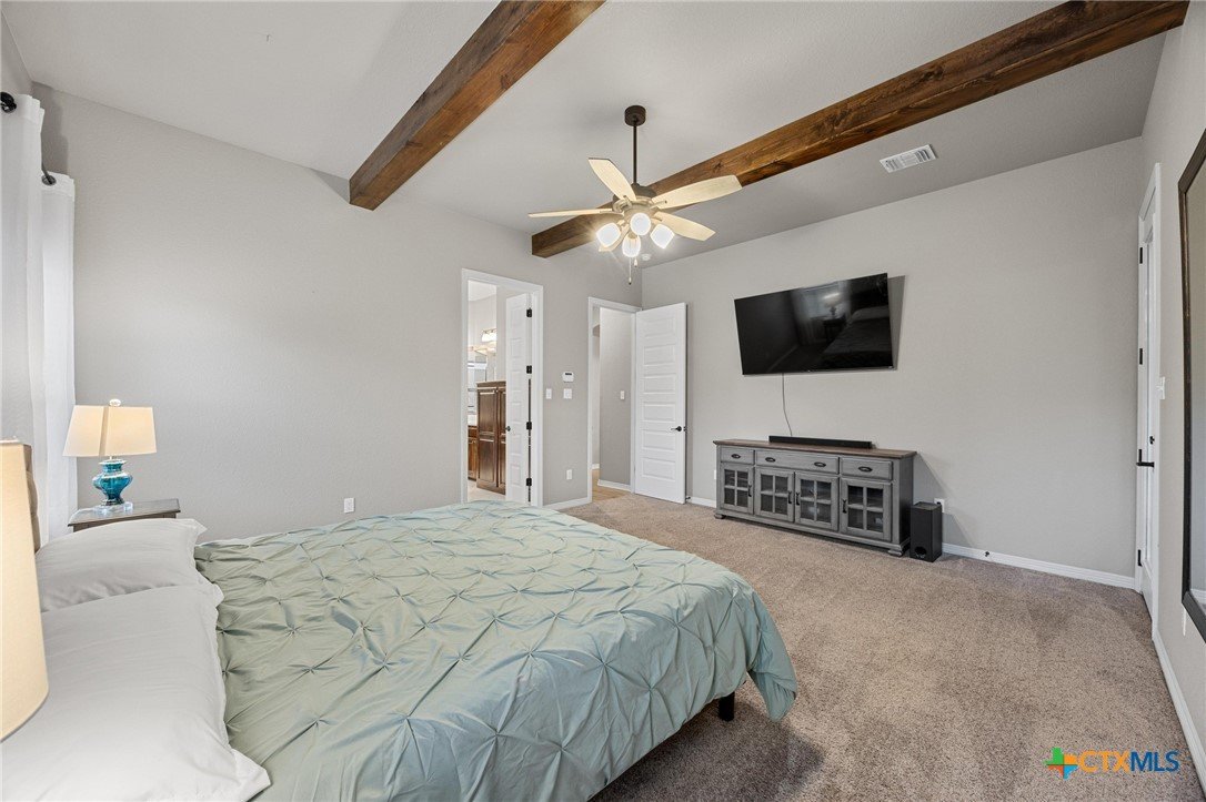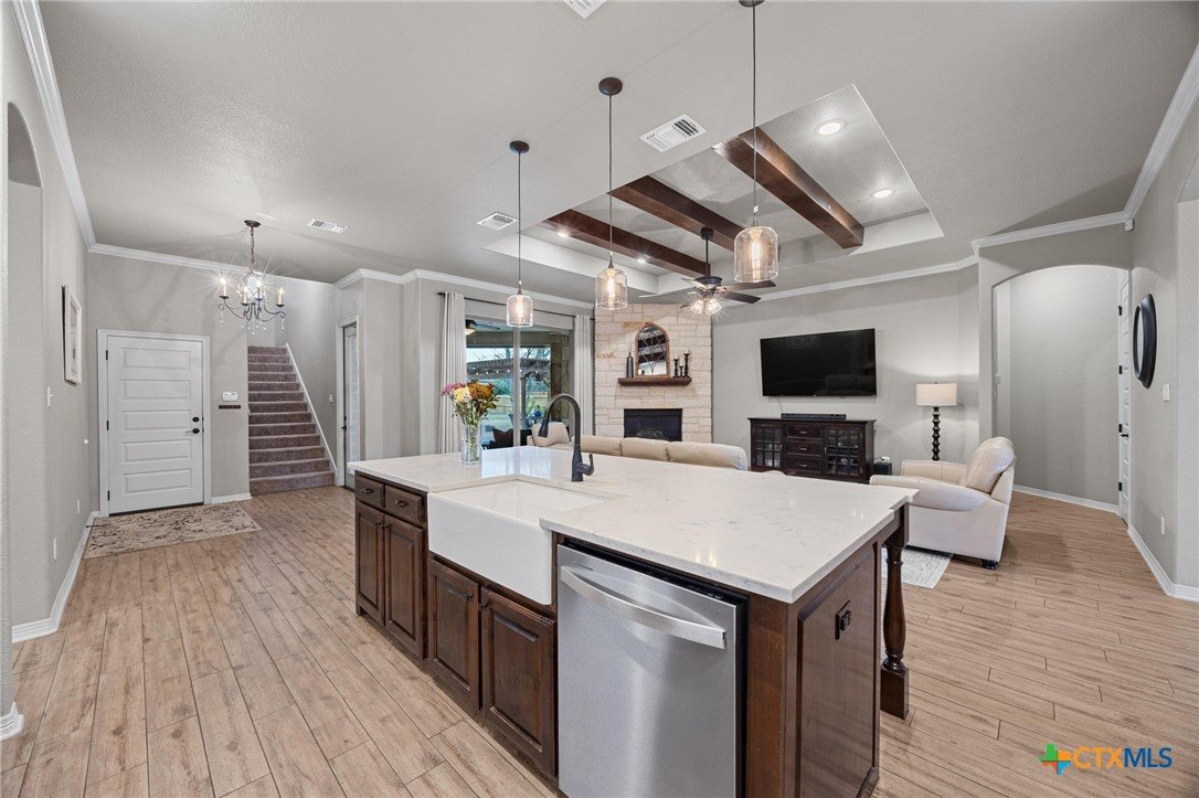 Welcome to your dream home! This stunning 5-bedroom, 3.5-bath house is a head-turner with its charming stone exterior and immense, towering oak trees adorning the entry. The modern interior boasts wood-like plank tile throughout, complemented by elegant plantation shutters. The ornate tray ceiling, graced with beautifully vaulted beams in the living room, creates an atmospheric setting for the limestone fireplace that serves as the room's stunning focal point. Large picture windows bathe the expansive open-layout living room in delightful natural light. The enticing chef's kitchen with a large island at its heart is perfect for honing your culinary skills or entertaining guests. The master bedroom is a true sanctuary, featuring a luxurious garden tub and convenient walk-in shower. Step outside and you will find an inviting outdoor living area; a large extended patio with its own stone fireplace. The expansive backyard provides ample space for all your outdoor endeavors. Just a short walk to the neighborhood pond/lake, walking trail, with convenient access to the lake Belton, shopping, and more!