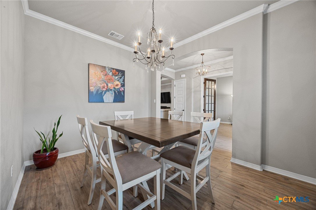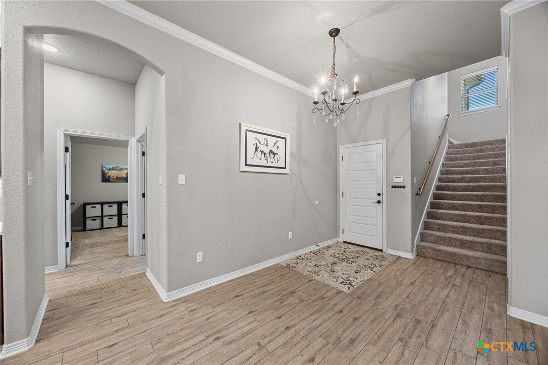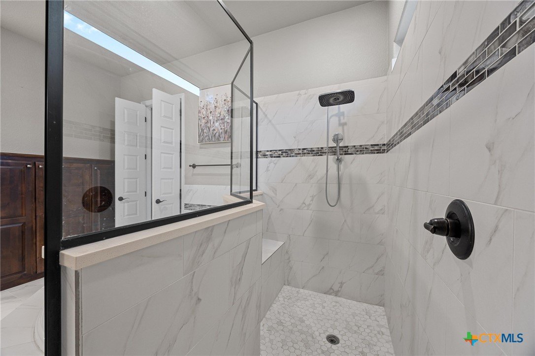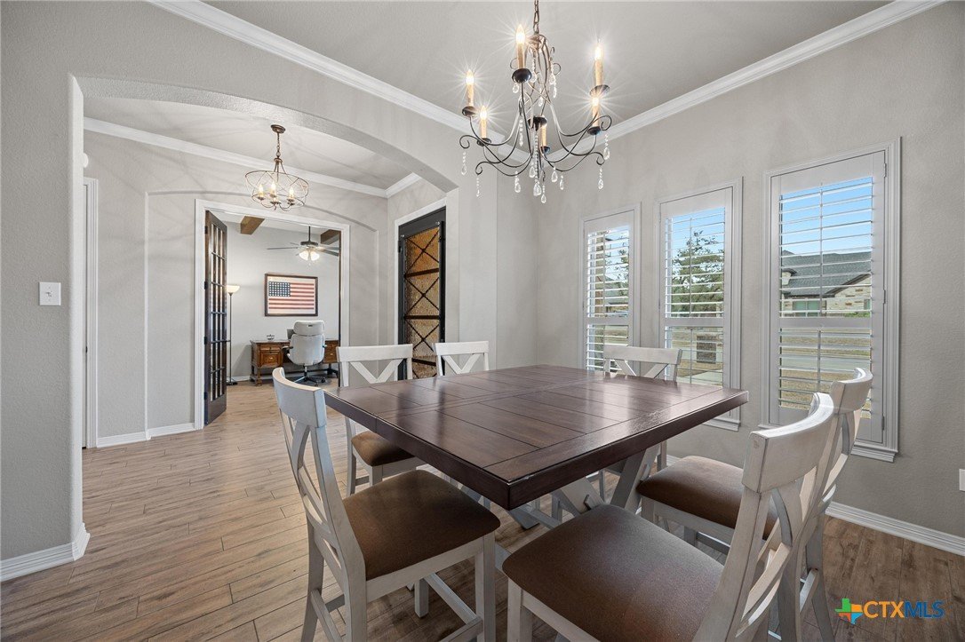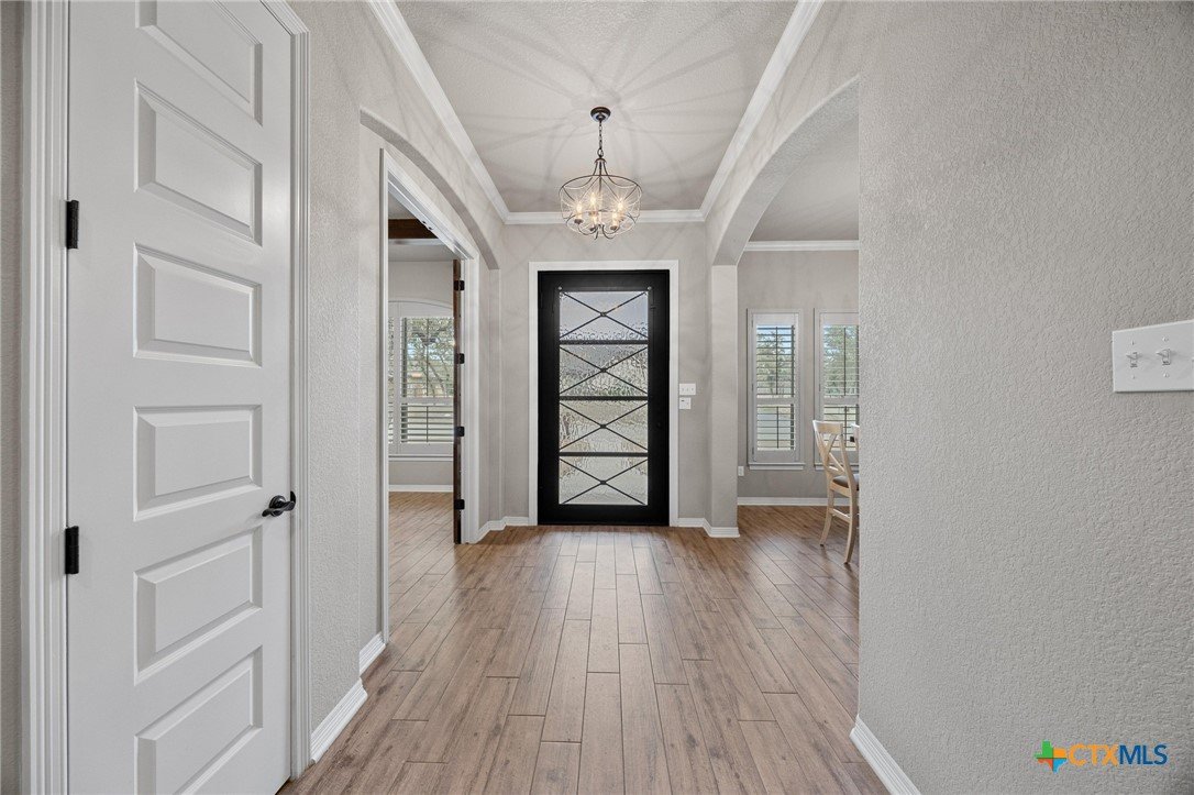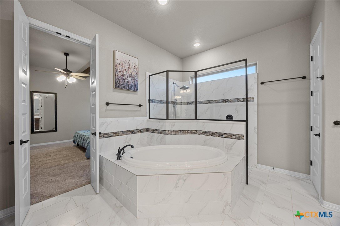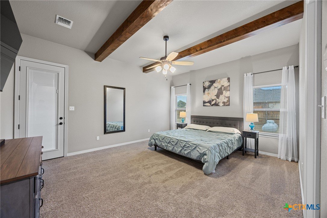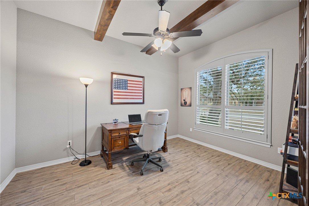 Welcome to your dream home! This stunning 5-bedroom, 3.5-bath house is a head-turner with its charming stone exterior and immense, towering oak trees adorning the entry. The modern interior boasts wood-like plank tile throughout, complemented by elegant plantation shutters. The ornate tray ceiling, graced with beautifully vaulted beams in the living room, creates an atmospheric setting for the limestone fireplace that serves as the room's stunning focal point. Large picture windows bathe the expansive open-layout living room in delightful natural light. The enticing chef's kitchen with a large island at its heart is perfect for honing your culinary skills or entertaining guests. The master bedroom is a true sanctuary, featuring a luxurious garden tub and convenient walk-in shower. Step outside and you will find an inviting outdoor living area; a large extended patio with its own stone fireplace. The expansive backyard provides ample space for all your outdoor endeavors. Just a short walk to the neighborhood pond/lake, walking trail, with convenient access to the lake Belton, shopping, and more!